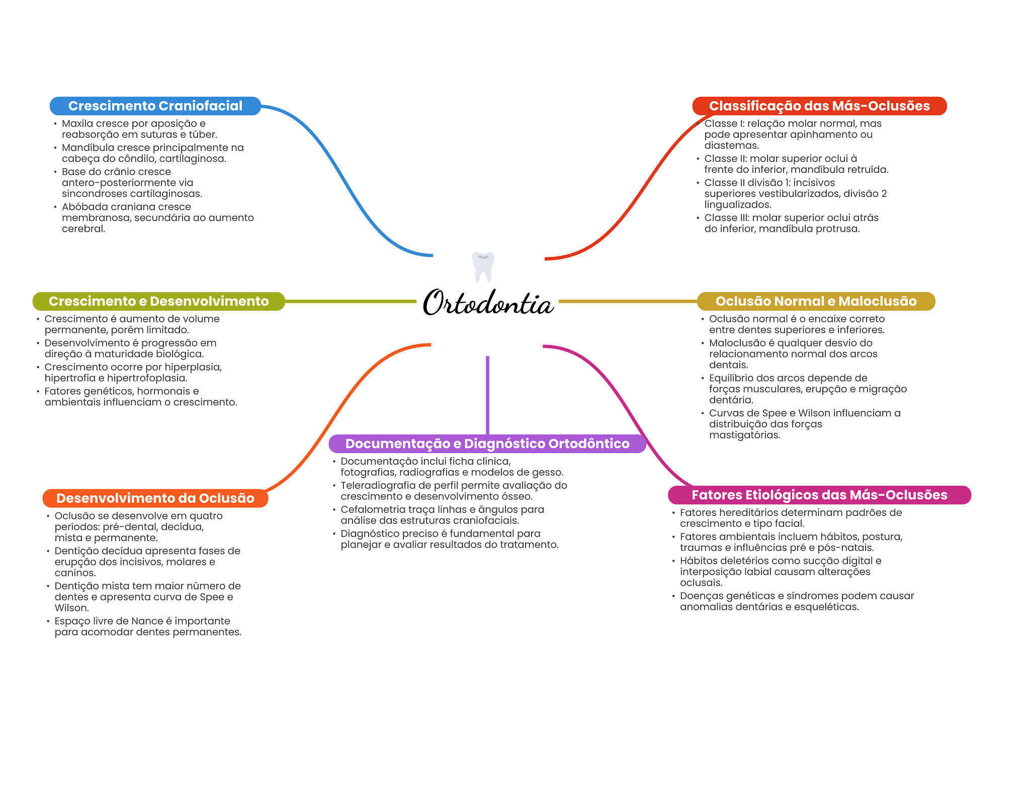 Crescimento Craniofacial Classificação das Más-Oclusões Maxila cresce por aposição e Classe I: relação molar normal, mas reabsorção em suturas e túber. pode apresentar apinhamento ou Mandíbula cresce principalmente na diastemas. cabeça do côndilo, cartilaginosa. Classe II: molar superior oclui à Base do crânio cresce frente do inferior, mandíbula retruída. antero-posteriormente via Classe divisão 1: incisivos sincondroses cartilaginosas. superiores vestibularizados, divisão 2 Abóbada craniana cresce lingualizados. membranosa, secundária ao aumento Classe III: molar superior oclui atrás cerebral. do inferior, mandíbula protrusa. Crescimento e Desenvolvimento Ortodontia Oclusão Normal e Maloclusão Crescimento é aumento de volume Oclusão normal é encaixe correto permanente, porém limitado. entre dentes superiores e inferiores. Desenvolvimento é progressão em Maloclusão é qualquer desvio do direção à maturidade biológica. relacionamento normal dos arcos Crescimento ocorre por hiperplasia, dentais. hipertrofia e hipertrofoplasia. Equilíbrio dos arcos depende de Fatores genéticos, hormonais e forças musculares, erupção e migração ambientais influenciam crescimento. dentária. Curvas de Spee e Wilson influenciam a distribuição das forças mastigatórias. Documentação e Diagnóstico Ortodôntico Documentação inclui ficha clínica, fotografias, radiografias e modelos de gesso. Teleradiografia de perfil permite avaliação do Desenvolvimento da Oclusão crescimento e desenvolvimento ósseo. Fatores Etiológicos das Más-Oclusões Cefalometria traça linhas e ângulos para Oclusão se desenvolve em quatro Fatores hereditários determinam padrões de análise das estruturas craniofaciais. períodos: pré-dental, decídua, crescimento e tipo facial. mista e permanente. Diagnóstico preciso é fundamental para Fatores ambientais incluem hábitos, postura, planejar e avaliar resultados do tratamento. Dentição decídua apresenta fases de traumas e influências pré e pós-natais. erupção dos incisivos, molares e Hábitos deletérios como sucção digital e caninos. interposição labial causam alterações Dentição mista tem maior número de oclusais. dentes e apresenta curva de Spee e Doenças genéticas e síndromes podem causar Wilson. anomalias dentárias e esqueléticas. Espaço livre de Nance é importante para acomodar dentes permanentes.