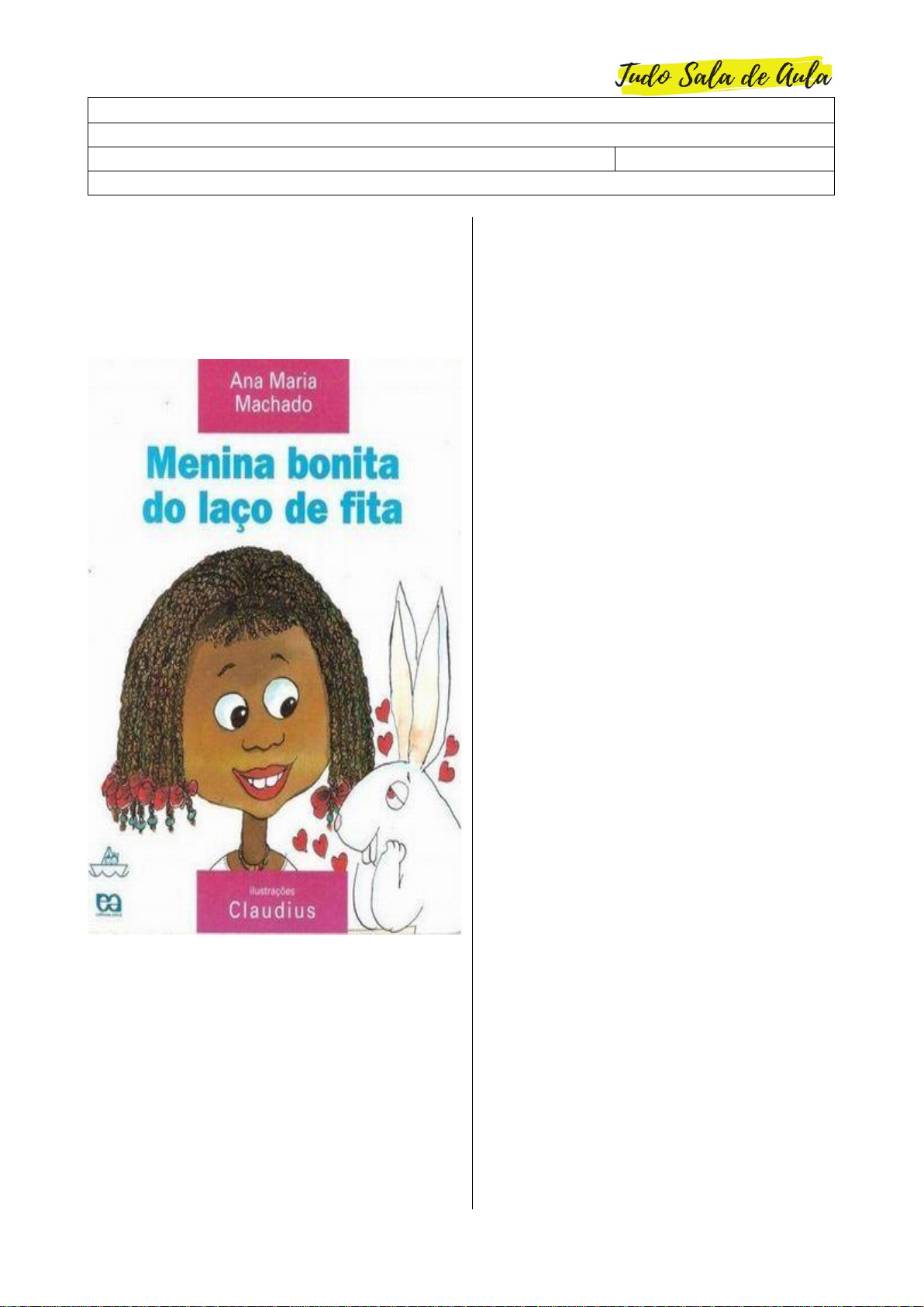 ATIVIDADE DE INTERPRETAÇÃO E COMPREENSÃO DE TEXTO ESTUDANTE: PROFESSOR (A): DATA: ___/___/_____ ESCOLA: LEIA A CAPA DO LIVRO E RESPONDA ÀS QUESTÕES: 1. QUAL O TÍTULO DO LIVRO? _________________________________ _________________________________ _________________________________ 2. QUANTAS PALAVRAS TEM O TÍTULO? _________________________________ _________________________________ 3. QUEM É AUTORA DO LIVRO? _________________________________ _________________________________ 4. QUEM FEZ AS ILUSTRAÇÕES DO LIVRO? _________________________________ _________________________________ 5. PELAS IMAGENS, QUAL O SENTIMENTO O COELHO SENTE PELA MENINA? _________________________________ _________________________________ 6. DUAS PALAVRAS ESTÃO RIMANDO NO TÍTULO, QUAIS SÃO ELAS? _________________________________ _________________________________ 7. PARA VOCÊ, O QUE CHAMA SUA ATENÇÃO NA CAPA DESSE LIVRO? _________________________________ _________________________________ _________________________________ _________________________________ _________________________________