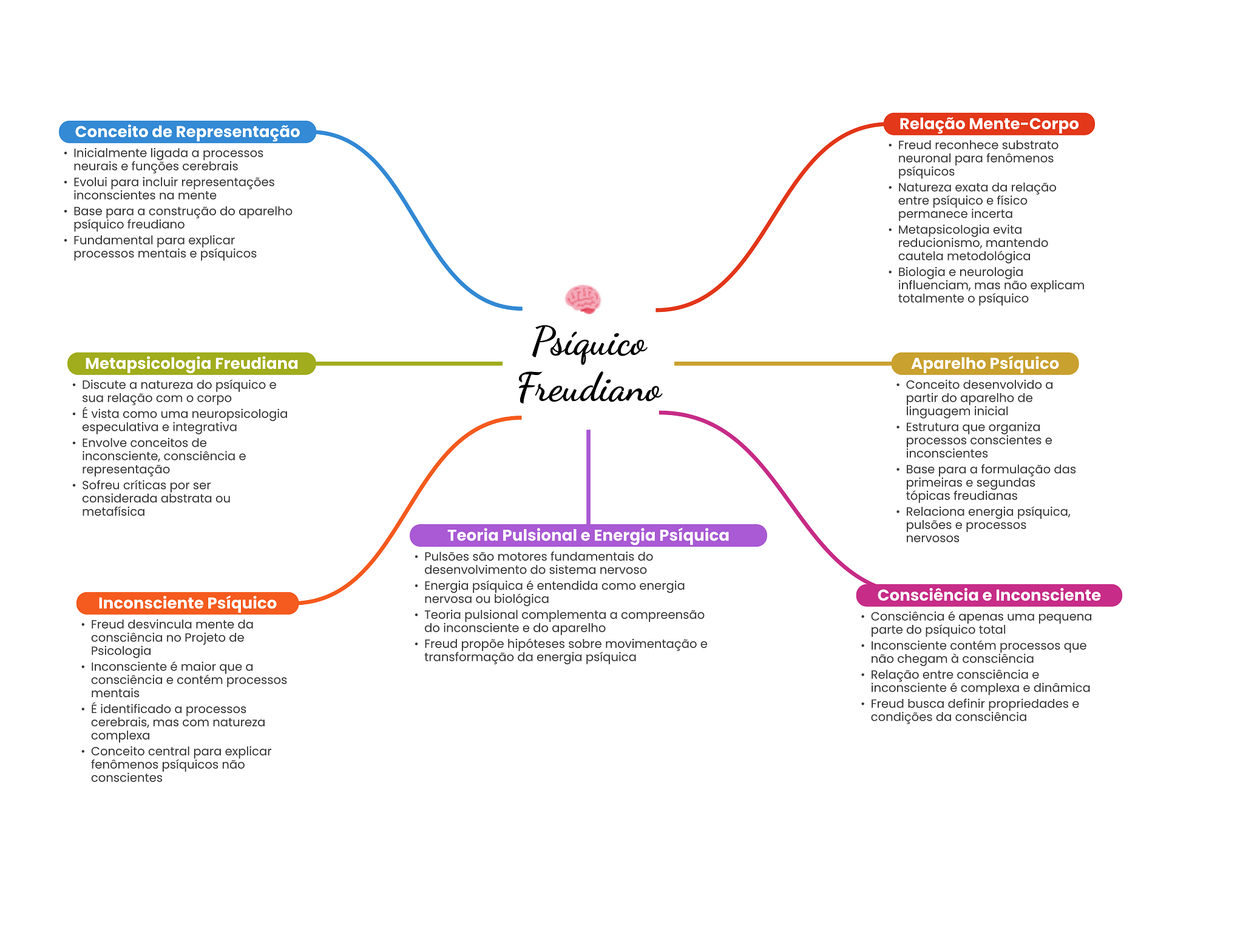 Conceito de Representação Relação Mente-Corpo Freud reconhece substrato Inicialmente ligada a processos neuronal para fenômenos neurais e funções cerebrais psíquicos Evolui para incluir representações Natureza exata da relação inconscientes na mente entre psíquico e físico Base para a construção do aparelho permanece incerta psíquico freudiano Metapsicologia evita Fundamental para explicar reducionismo, mantendo processos mentais e psíquicos cautela metodológica Biologia e neurologia influenciam, mas não explicam totalmente psíquico Psíquico Metapsicologia Freudiana Aparelho Psíquico Discute a natureza do psíquico e Freudiano Conceito desenvolvido a sua relação com corpo partir do aparelho de É vista como uma neuropsicologia linguagem inicial especulativa e integrativa Estrutura que organiza Envolve conceitos de processos conscientes e inconsciente, consciência e inconscientes representação Base para a formulação das Sofreu críticas por ser primeiras e segundas considerada abstrata ou tópicas freudianas metafísica Relaciona energia psíquica, pulsões e processos Teoria Pulsional e Energia Psíquica nervosos Pulsões são motores fundamentais do desenvolvimento do sistema nervoso Energia psíquica é entendida como energia nervosa ou biológica Consciência e Inconsciente Inconsciente Psíquico Teoria pulsional complementa a compreensão Freud desvincula mente da Consciência é apenas uma pequena do inconsciente e do aparelho parte do psíquico total consciência no Projeto de Psicologia Freud propõe hipóteses sobre movimentação e Inconsciente contém processos que transformação da energia psíquica não chegam à consciência Inconsciente é maior que a consciência e contém processos Relação entre consciência e mentais inconsciente é complexa e dinâmica É identificado a processos Freud busca definir propriedades e cerebrais, mas com natureza condições da consciência complexa Conceito central para explicar fenômenos psíquicos não conscientes