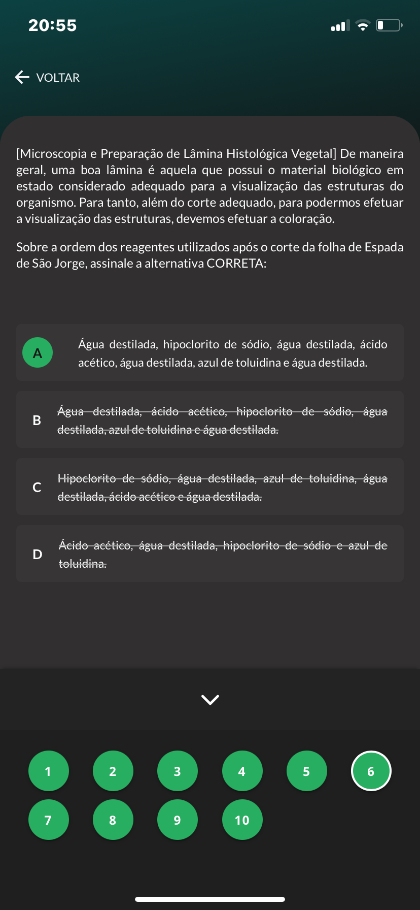 20:55 VOLTAR [Microscopia e Preparação de Lâmina Histológica Vegetal] De maneira geral, uma boa lâmina é aquela que possui material biológico em estado considerado adequado para a visualização das estruturas do organismo. Para tanto, além do corte adequado, para podermos efetuar a visualização das estruturas, devemos efetuar a coloração. Sobre a ordem dos reagentes utilizados após corte da folha de Espada de São Jorge, assinale a alternativa CORRETA: Água destilada, hipoclorito de sódio, água destilada, ácido A acético, água destilada, azul de toluidina e água destilada. Água destilada, ácido acético, hipoclorito de sódio, água B destilada, azul de toluidina e água destilada. Hipoclorito de sódio, água destilada, azul de toluidina, água c destilada, ácido acético e água destilada. Ácido acético, água destilada, hipoclorito de sódio e azul de D toluidina. 1 2 3 4 5 6 7 8 9 10