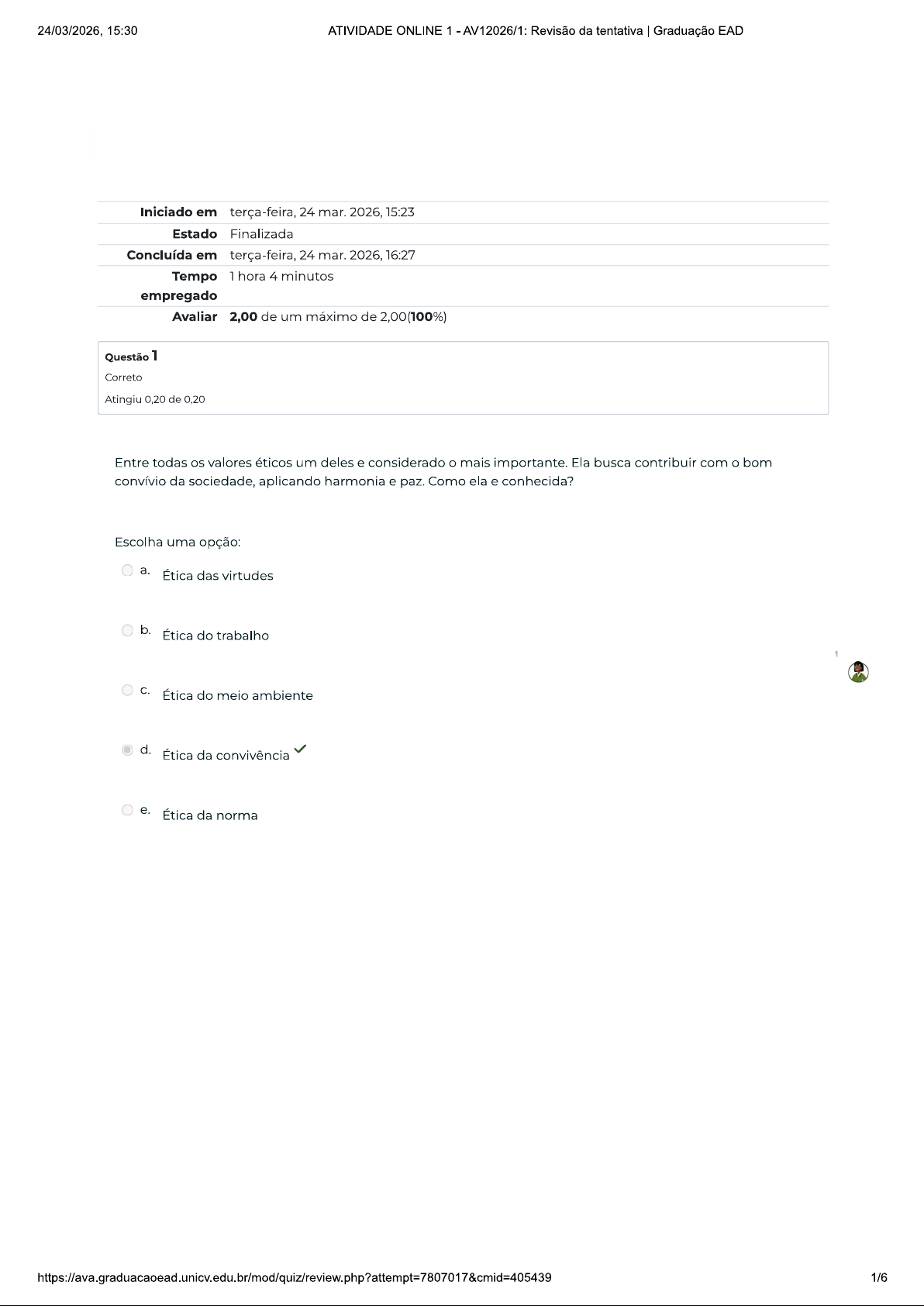 24/03/2026, 15:30 ATIVIDADE ONLINE 1 - AV12026/1: Revisão da tentativa Graduação EAD Iniciado em terça-feira, 24 mar. 2026, 15:23 Estado Finalizada Concluída em terça-feira, 24 mar. 2026, 16:27 Tempo 1 hora 4 minutos empregado Avaliar 2,00 de um máximo de 2,00(100%) Questão 1 Correto Atingiu 0,20 de 0,20 Entre todas os valores éticos um deles e considerado mais importante. Ela busca contribuir com bom convívio da sociedade, aplicando harmonia e paz. Como ela e conhecida? Escolha uma opção: a. Ética das virtudes b. Ética do trabalho C. Ética do meio ambiente d. Ética da convivência e. Ética da norma 1/624/03/2026, 15:30 ATIVIDADE ONLINE 1 - AV12026/1: Revisão da tentativa Graduação EAD Questão 2 Correto Atingiu 0,20 de 0,20 A frase abaixo defini qual princípio ético? "Devemos tratar igualmente os iguais e desigualmente desiguais, na medida de sua desigualdade." (Aristóteles). Escolha uma opção: a. Respeito b. Igualdade C. Liberdade d. Confiança e. Justiça Questão 3 1 Correto Atingiu 0,20 de 0,20 Agora que conhecemos os significados e valores usados pela ética, podemos afirmar que eles são valores: Escolha uma opção: a. Menos importantes que valores morais. b. Com uma estabilidade muito maior que valores morais C. Com uma estabilidade igual aos valores morais d. Mais importantes que valores morais. e. Com uma estabilidade menor que valores morais 2/624/03/2026, 15:30 ATIVIDADE ONLINE 1 - AV12026/1: Revisão da tentativa Graduação EAD Questão 4 Correto Atingiu 0,20 de 0,20 Dentro da étida das virtudes, A capacidade de escolher bem, de calcular os meios e a forma necessária para um fim bom é chamada de Phyonesis, muitas vezes traduzida para? Escolha uma opção: a. Potência b. Competitividade C. Princípios d. Destreza e. Prudência Questão 5 Correto 1 Atingiu 0,20 de 0,20 De acordo com INMETRO e a ISO 26000, existem 7 princípios da responsabilidade social. Dois deles são? Escolha uma opção: a. Conforto é Respeito b. Comportamento ético e Direito aos humanos. C. Liberdade e Paciência d. Educação e Poder e. Poder e Riqueza 3/624/03/2026, 15:30 ATIVIDADE ONLINE 1 - AV12026/1: Revisão da tentativa Graduação EAD Questão 6 Correto Atingiu 0,20 de 0,20 Ser ético não é somente falar bonito, com as palavras certas na hora certa. É preciso ter atitude, mostrar em ações aquilo que se prega. Porém para isso e necessário um primeiro passo, qual? Escolha uma opção: a. Não se importante com outros b. Reconhecer próximo como importante C. Valorizar somente a sí proprio d. Reconhecer que sou sempre melhor que os outros. e. Saber que somente a felicidade da minha família que interessa Questão 7 Correto 1 Atingiu 0,20 de 0,20 Virtudes éticas e a relação entre justo e ao injusto. Por isso, de acordo com os ensinamentos de Aristóteles, agir de forma virtuosa e a justa medida a nós. Essa justa medida é conhecida como? Escolha uma opção: a. Inicial b. meio-termo C. capacitória d. finalidade e. prazerosa 4/624/03/2026, 15:30 ATIVIDADE ONLINE 1 AV12026/1: Revisão da tentativa Graduação EAD Questão 8 Correto Atingiu 0,20 de 0,20 A ética está distribuída entre vários valores éticos, sendo um deles a ética da virtude, também conhecida como? Escolha uma opção: a. Ética aristotélica b. Ética de Platão C. Ética de Confúcio d. Ética de sócrates e. Ética de Séneca Questão 9 Correto 1 Atingiu 0,20 de 0,20 A ética lida com valores que são aceitos pelas sociedades em geral do mundo todo e são valores que costumam ser aceitos nas diferentes épocas. Quais são esses valores? Escolha uma opção: a. Objetivos e centralizados b. universais e perenes C. Regionais e sociais d. Hierárquicos e sexual e. Locais e comunitários 5/624/03/2026, 15:30 ATIVIDADE ONLINE 1 - AV12026/1: Revisão da tentativa Graduação EAD Questão 10 Correto Atingiu 0,20 de 0,20 Existem três tipos de utilitarismo, sendo um deles que acredita que seja necessário prevenir a maior quantidade possível de dor ou dano para maior número de pessoas. Qual tipo de utilitarismo e esse? Escolha uma opção: a. Positivo b. Indiferente C. Ato e norma d. Preferencial e. Negativo 6/6
