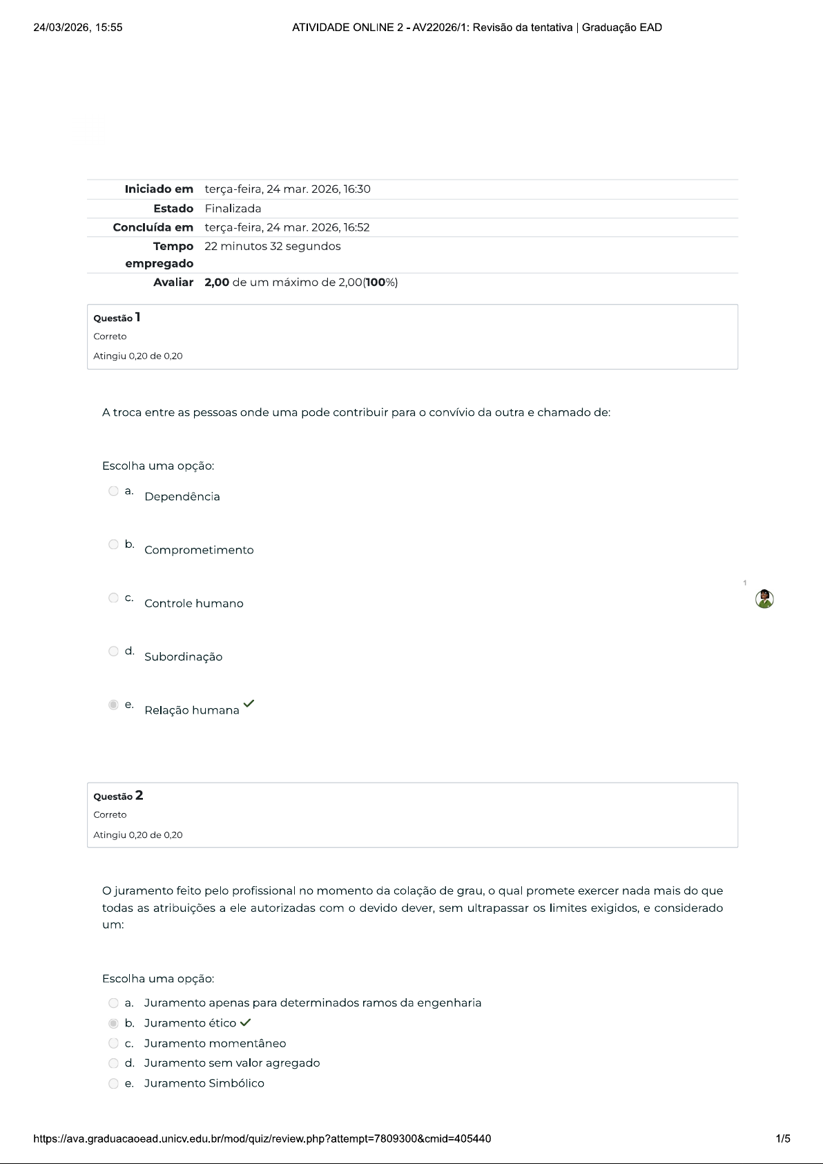 24/03/2026, 15:55 ATIVIDADE ONLINE 2 - AV22026/1: Revisão da tentativa Graduação EAD Iniciado em terça-feira, 24 mar. 2026, 16:30 Estado Finalizada Concluída em terça-feira, 24 mar. 2026, 16:52 Tempo 22 minutos 32 segundos empregado Avaliar 2,00 de um máximo de 2,00(100%) Questão 1 Correto Atingiu 0,20 de 0,20 A troca entre as pessoas onde uma pode contribuir para convívio da outra e chamado de: Escolha uma opção: a. Dependência b. Comprometimento C. Controle humano d. Subordinação e. Relação humana Questão 2 Correto Atingiu 0,20 de 0,20 juramento feito pelo profissional no momento da colação de grau, qual promete exercer nada mais do que todas as atribuições a ele autorizadas com devido dever, sem ultrapassar limites exigidos, e considerado um: Escolha uma opção: a. Juramento apenas para determinados ramos da engenharia b. Juramento ético C. Juramento momentâneo d. Juramento sem valor agregado e. Juramento Simbólico 1/524/03/2026, 15:55 ATIVIDADE ONLINE 2 - AV22026/1: Revisão da tentativa Graduação EAD Questão 3 Correto Atingiu 0,20 de 0,20 Qual das alternativas abaixo é considerada um dos pontos básicos na elaboração de uma nova ética para ser aplicado e alcançar melhorias na qualidade de vida e no meio ambiente? Escolha uma opção: a. Apoio a industrialização b. Poder sobre decisões C. Bem-estar humano e ecológico d. Confronto com políticas publicas. e. Individualismo em ações Questão 4 Correto 1 Atingiu 0,20 de 0,20 Uma forma de pensar um pouco mais sobre diversidade é aplicando um outra ação tanto na vida pessoal quanto na profissional. Qual e ela? Escolha uma opção: a. Ignorância b. Empatia C. Carência d. Egoísmo e. Soberba 2/524/03/2026, 15:55 ATIVIDADE ONLINE 2 AV22026/1: Revisão da tentativa Graduação EAD Questão 5 Correto Atingiu 0,20 de 0,20 diálogo gera confiança entre as pessoas, as tornando mais próximas e éticas com a própria vida e a sociedade global. texto acima se refere a: Escolha uma opção: a. Comunidade b. Diversidade C. Sociedade d. Simplicidade e. Publicidade Questão 6 1 Correto Atingiu 0,20 de 0,20 Complete as lacunas da frase: convívio e a integração são as melhores formas de obter um de qualidade de acordo com as normas éticas do Qual a alternativa correta? Escolha uma opção: a. Fornecedor Parceiros. b. Empreendimento Fornecedor. C. Consumidor Empresas. d. Empresas consumidor. e. Fornecedor Empreendimento. 3/524/03/2026, 15:55 ATIVIDADE ONLINE 2 AV22026/1: Revisão da tentativa Graduação EAD Questão 7 Correto Atingiu 0,20 de 0,20 Complete as lacunas: Saber a forma com que outra pessoa vive é saber o diferente que a vida é. A alternativa correta e: Escolha uma opção: a. Aceitar Comprar b. Aceitar Negar C. Negociar Comprar d. Negar Negar e. Aceitar Aceitar Questão 8 1 Correto Atingiu 0,20 de 0,20 saber Ambiental problematiza conhecimento fragmentado em disciplinas e a administração setorial do desenvolvimento, para constituir um campo de conhecimento teóricos e práticos orientado para a rearticulação das relações. Este intuito e entre a relação de quais áreas? Escolha uma opção: a. Sociedade e Natureza b. Sociedade e Política C. Natureza e Economia d. Natureza e Política e. Sociedade e Economia 4/524/03/2026, 15:55 ATIVIDADE ONLINE 2 AV22026/1: Revisão da tentativa Graduação EAD Questão 9 Correto Atingiu 0,20 de 0,20 A ética profissional é de algum modo um prolongamento de uma outra ética. Qual seria essa ética inicial? Escolha uma opção: a. Ética humana b. Ética geral C. Ética Religiosa d. Ética ecológica e. Ética Pessoal Questão 10 Correto Atingiu 0,20 de 0,20 1 Há muito tempo a ecologia deixou de ser uma parte integrante da biologia e passou a ser considerada como um conceito. Esse conceito foi dividido em 4 partes. Quais são elas? Escolha uma opção: a. Social, Desenvolvimento, animal e mental b. Ambiental, Humano, Político e Comunitário C. Desenvolvimento, Comunitário, Humano e integral. d. Humano, político, animal e desenvolvimento. e. Ambiental, Social, Mental e Integral 5/5