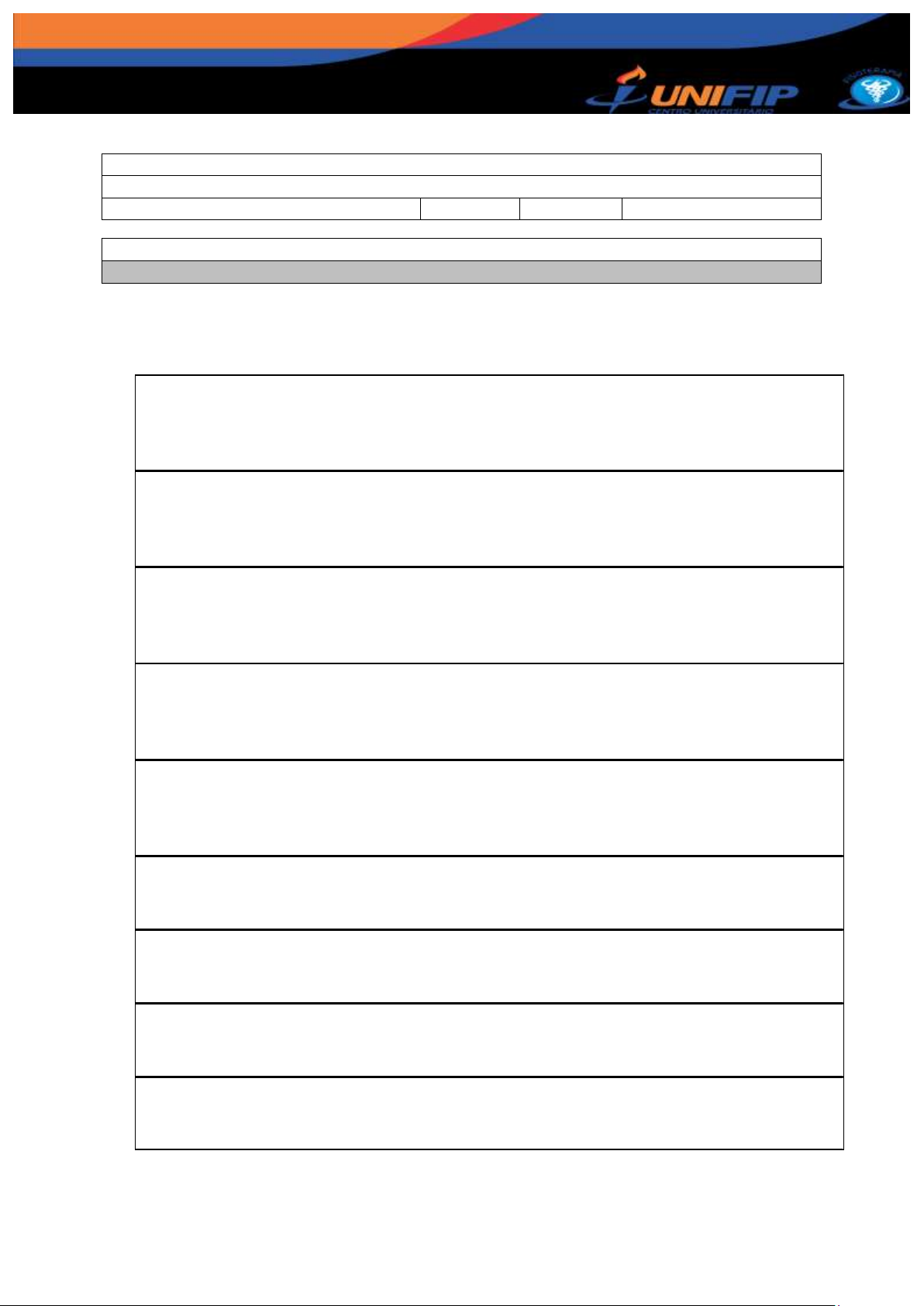CENTRO UNIVERSITÁRIO UNIFIP CURSO DE FISIOTERAPIA Componente Curricular: FISIOTERAPIA EM UTI Professora: RAYNE BORGES TORRES SETTE Semestre: Período: 8º. Data: ___/___/_____ Estudante: GLOSSÁRIO 1) Defina os termos no glossário referentes às alterações dos seguintes exames complementares, especifique quando essas alterações podem representar limitações absolutas ou relativas para procedimentos de Fisioterapia. Hemoglobina e hematócritos: eritrocitose/policitemia e anemia Leucócitos: leucocitose e leucopenia Plaquetas: trombocitose e trobocitopenia/plaquetopenia Glicose: hiperglicemia e hipoglicemia Uréia: ureia baixa e uremia Creatinina: aumentada ou baixa K+: hiperpotassemia/hipercalemia e hipopotassemia/hipocalemia Na+: hepernatremia e hiponatremia Ca++: hipercalcemia e hipocalcemia CENTRO UNIVERSITÁRIO UNIFIP CURSO DE FISIOTERAPIA 2) Realize outro glossário com os termos técnicos utilizados para descrever os sinais vitais e as pupilas quando normais ou alterados. Defina e coloque os limites de normalidade. Frequência cardíaca - Normocárdico - Bradicárdico - Taquicárdico Frequência respiratória - Eupneico: - Dispneico: - Bradipneico: - Taquipneico: Pressão arterial - Normotenso: - Hipertenso: - Hipotenso: Temperatura - Hipotérmico: - Subfebril: - Afebril: Pupilas - Isocóricas: - Anisocóricas: - Mióticas: - Midriáticas: