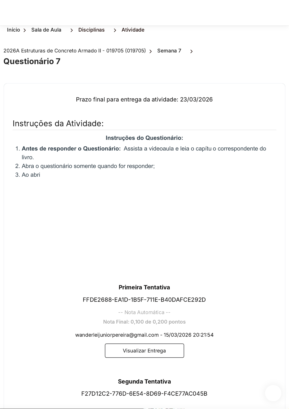 Início 〉 Sala de Aula 〉 Disciplinas 〉 Atividade 2026A Estruturas de Concreto Armado II - 019705 (019705) 〉 Semana 7 〉 Questionário 7 Instruções da Atividade: Prazo final para entrega da atividade: 23/03/2026 Instruções do Questionário: 1. Antes de responder o Questionário: Assista a videoaula e leia o capítulo correspondente do livro. 2. Abra o questionário somente quando for responder; 3. Ao abrir o questionário você terá 4 questões para responder; 4. Leia com calma todas as questões e entenda o que pede a questão: se pede a incorreta, a correta e qual o tema da questão; 5. Lembre-se de Clicar no botão "Enviar"; 6. Você tem duas tentativas para fazer o teste, a segunda tentativa é opcional; 7. Lembre-se que as respostas mudam de lugar em cada tentativa; 8. As respostas corretas só aparecem após o envio da segunda tentativa; 9. O sistema considera a maior nota entre as duas tentativas; 10. Lembre-se que na segunda tentativa zera TODAS as questões, inclusive as que você acertou na primeira tentativa. Bons estudos! Primeira Tentativa FFDE2688-EA1D-1B5F-711E-B40DAFCE292D -- Nota Automática -- Nota Final: 0,100 de 0,200 pontos wanderleijuniorpereira@gmail.com - 15/03/2026 20:21:54 Visualizar Entrega Segunda Tentativa F27D12C2-776D-6E54-8D69-F4CE77AC045B https://ava.uca.edu.br/aluno/sala-de-aula/disciplina/modulo/atividade/677878 https://ava.uca.edu.br/aluno/sala-de-aula/disciplina/modulo/atividade/677878 https://ava.uca.edu.br/aluno/sala-de-aula/disciplina https://ava.uca.edu.br/aluno/sala-de-aula/disciplina/modulo/atividade/:id/:nome https://api.whatsapp.com/send?phone=5514988263000&text=Suporte javascript:void(0); -- Nota Automática -- Nota Final: 0,100 de 0,200 pontos wanderleijuniorpereira@gmail.com - 15/03/2026 21:22:31 Visualizar Entrega Perguntas Pergunta 1. Pergunta 2. pontos: 0,100Pergunta 1. O projetista precisa ter em mente que o projeto de um sistema de protensão deve ser muito bem elaborado, pois tem diversas variáveis envolvidas, de modo que o melhor projeto é obtido de forma iterativa. Podem ser descritos três diferentes procedimentos para o projeto de peças protendidas à flexão, são eles: Múltipla Escolha: A. Podemos adotar a seção transversal e calcular o valor de excentricidade da força de protensão, considerando os carregamentos atuantes ou fase mais importante, verificando na sequência as tensões atuantes no concreto para diferentes estágios de carregamentos, fazendo as tensões atuantes serem maiores ou iguais às tensões admissíveis. B. Podemos adotar a seção transversal e calcular o valor de excentricidade da força de protensão, considerando os carregamentos atuantes ou fase mais importante, verificando na sequência as tensões atuantes no concreto para diferentes estágios de carregamentos. https://api.whatsapp.com/send?phone=5514988263000&text=Suporte javascript:void(0); C. Para a condição de grandes vãos, a peça mais eficiente pode resultar tomando como base as tensões admissíveis do concreto na escolha da seção transversal, fazendo as tensões atuantes serem maiores que as tensões admissíveis. D. Temos a determinação da seção transversal, seguida pela determinação das forças de protensão e o perfil da armadura ativa, ao final podemos realizar modificações de forma a atender as tensões atuantes. E. Para os problemas de verificação, é necessário conhecer somente os carregamentos atuantes e as tensões admissíveis, pois com esses fatores podemos verificar o ELS. pontos: 0,100Pergunta 2. Além dos esforços de flexão, uma viga de concreto protendido estará, praticamente sempre, sujeita à ação de esforços cortantes, sabendo ainda que o conhecimento das parcelas (Vsw e Vc) é fundamental para o dimensionamento, pede-se: Determinar a parcela de força resistida pelos estribos (Vsw) de uma viga protendida seção I, biapoiada sob flexão: Composta por estribos verticais; Coeficientes de ponderação: γc = γf = 1,4; Largura da alma bw = 14 cm, altura útil da armadura de protensão dp = 89 cm; Força cortante solicitante VSd = 260 kN; Força de protensão final P∞ = 710 kN; Momento fletor solicitante máximo no vão MSd = 80.593 kN.cm; Ac = 2.256 cm² , Wb = 49.144 cm³ , excentricidade da armadura de protensão ep = 40 cm. Múltipla Escolha: A. Vsw = 76,48 kN. Avaliação Nota Avaliada: 0,000 de 0,100 https://api.whatsapp.com/send?phone=5514988263000&text=Suporte javascript:void(0); B. Vsw = 89,29 kN. C. Vsw = 56,73 kN. D. Vsw = 75,29 kN. E. Vsw = 89,33 kN. Fechar Visualização 〈 Voltar aos Módulos 〈 Anterior Avaliação Nota Avaliada: 0,100 de 0,100 Próxima 〉 Faculdade Católica Paulista https://api.whatsapp.com/send?phone=5514988263000&text=Suporte javascript:void(0); Contato Endereço Avenida Cristo Rei, 305 – Banzato Marília, São Paulo – CEP: 17515-200 Horário De Funcionamento Segunda a quinta, das 8:00 às 20:00 horas As sextas, das 8:00 às 18:00 horas. WhatsApp : (14) 9.8826-3000 Telefone Sede: (14) 3422-1815 Central de Atendimento: 0800 664 5583 E-mail : secretaria@uca.edu.br https://www.instagram.com/faculdadecatolicaead/ https://facebook.com/ucaead https://www.youtube.com/@UcaEduBr https://www.linkedin.com/school/faculdade-catolica-paulista/?originalSubdomain=br https://maps.app.goo.gl/wWsD9QX5fVPa3h6PA https://api.whatsapp.com/send?phone=5514988263000&text=Suporte tel:14-3422-1815 tel:14-3422-1815 tel:0800-664-5583 tel:0800-664-5583 mailto:secretaria@uca.edu.br https://api.whatsapp.com/send?phone=5514988263000&text=Suporte javascript:void(0);