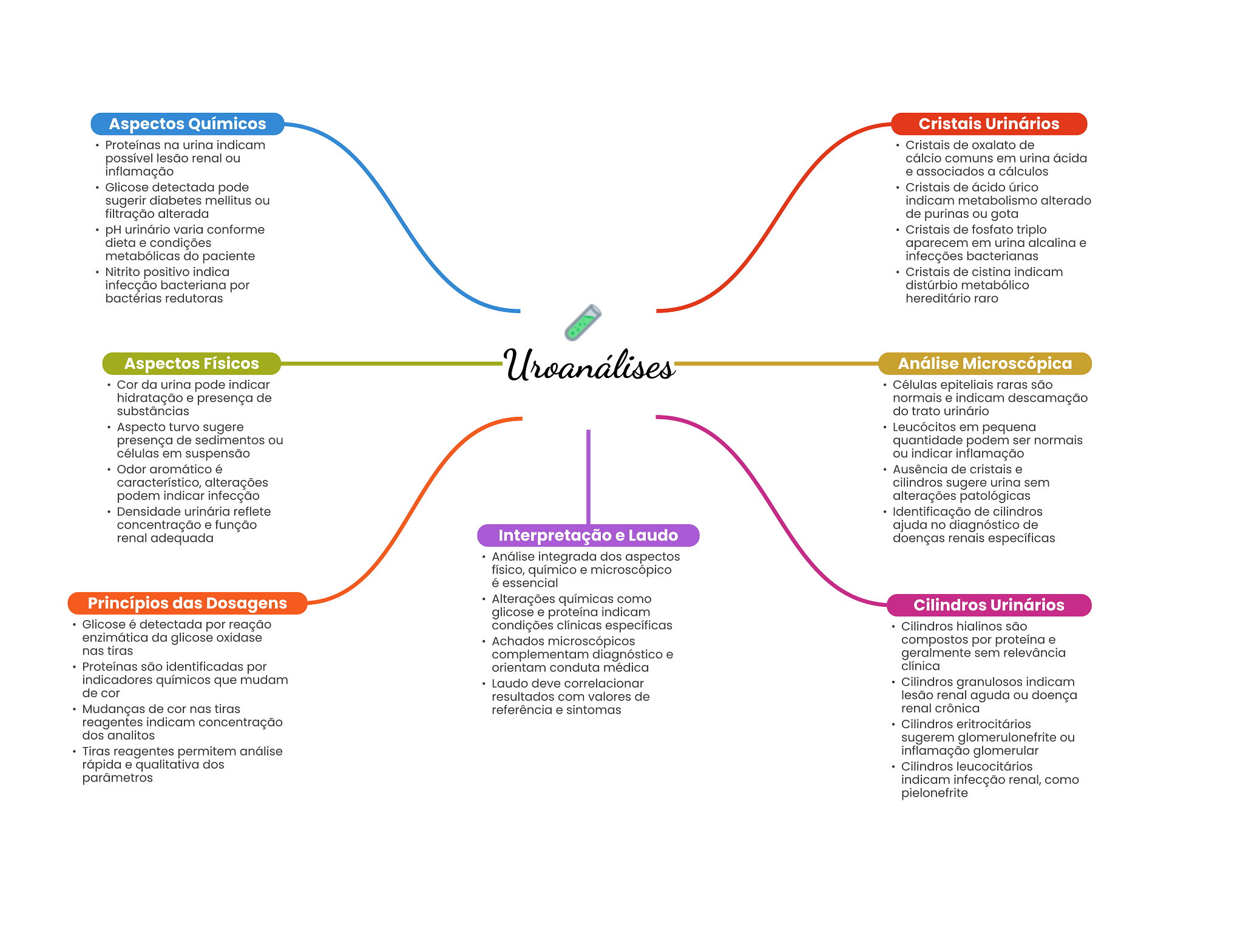 Aspectos Químicos Cristais Urinários Proteínas na urina indicam Cristais de oxalato de possível lesão renal ou cálcio comuns em urina ácida inflamação e associados a cálculos Glicose detectada pode Cristais de ácido úrico sugerir diabetes mellitus ou indicam metabolismo alterado filtração alterada de purinas ou gota pH urinário varia conforme Cristais de fosfato triplo dieta e condições aparecem em urina alcalina e metabólicas do paciente infecções bacterianas Nitrito positivo indica Cristais de cistina indicam infecção bacteriana por distúrbio metabólico bactérias redutoras hereditário raro Aspectos Físicos Uroanálises Análise Microscópica Cor da urina pode indicar Células epiteliais raras são hidratação e presença de normais e indicam descamação substâncias do trato urinário Aspecto turvo sugere Leucócitos em pequena presença de sedimentos ou quantidade podem ser normais células em suspensão ou indicar inflamação Odor aromático é Ausência de cristais e característico, alterações cilindros sugere urina sem podem indicar infecção alterações patológicas Densidade urinária reflete Identificação de cilindros concentração e função ajuda no diagnóstico de renal adequada Interpretação e Laudo doenças renais específicas Análise integrada dos aspectos físico, químico e microscópico é essencial Princípios das Dosagens Alterações químicas como Cilindros Urinários glicose e proteína indicam Glicose é detectada por reação condições clínicas específicas Cilindros hialinos são enzimática da glicose oxidase Achados microscópicos compostos por proteína e nas tiras complementam diagnóstico e geralmente sem relevância Proteínas são identificadas por orientam conduta médica clínica indicadores químicos que mudam Laudo deve correlacionar Cilindros granulosos indicam de cor resultados com valores de lesão renal aguda ou doença Mudanças de cor nas tiras referência e sintomas renal crônica reagentes indicam concentração Cilindros eritrocitários dos analitos sugerem glomerulonefrite ou Tiras reagentes permitem análise inflamação glomerular rápida e qualitativa dos Cilindros leucocitários parâmetros indicam infecção renal, como pielonefrite