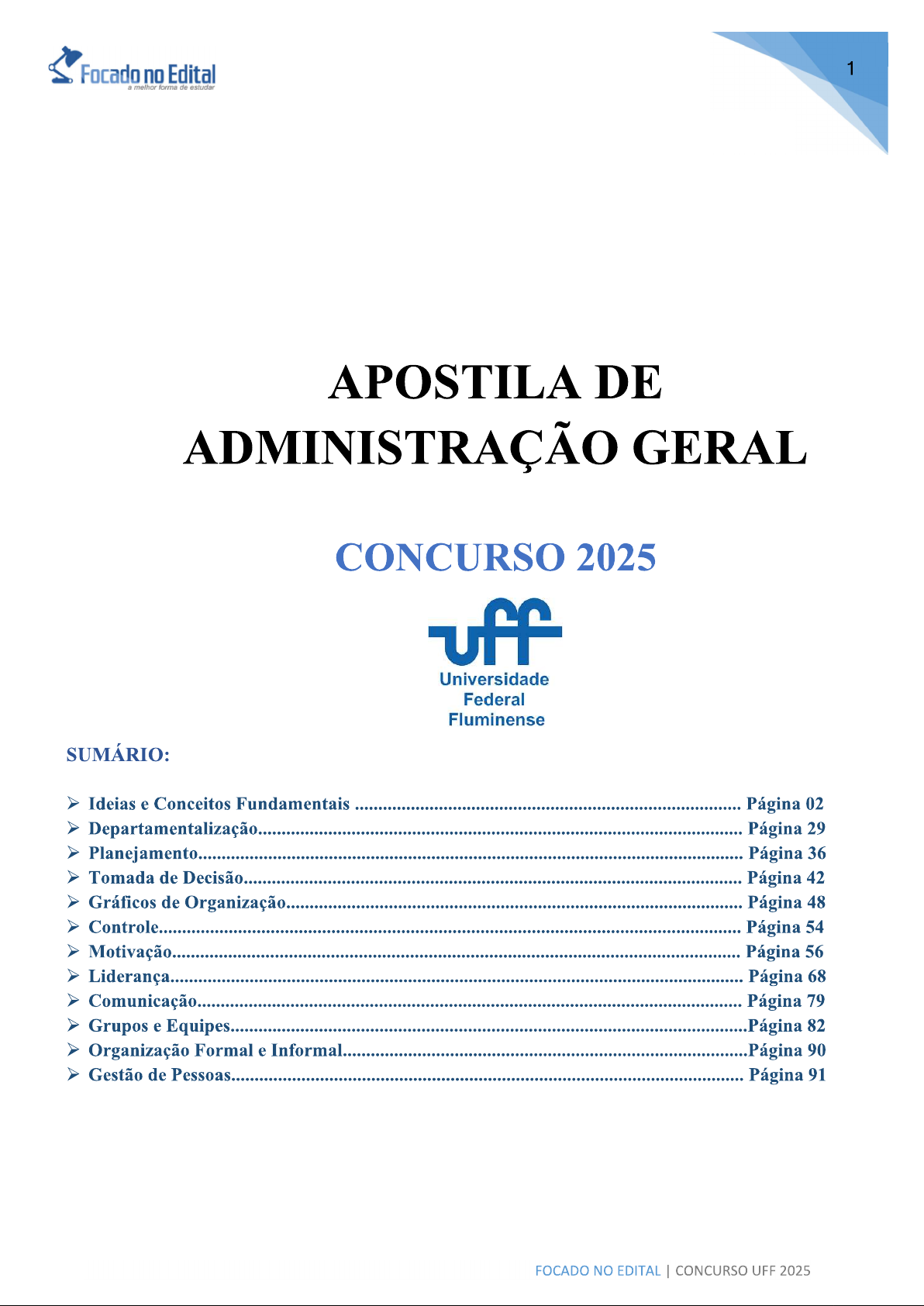 Focado no Edital 1 a melhor forma de estudar APOSTILA DE ADMINISTRAÇÃO GERAL CONCURSO 2025 uff Universidade Federal Fluminense SUMÁRIO: Ideias e Conceitos Fundamentais Página 02 Departamentalização Página 29 Planejamento Página 36 Tomada de Decisão Página 42 Gráficos de Organização Página 48 Controle Página 54 Motivação Página 56 Liderança Página 68 Comunicação Página 79 Grupos e Equipes Página 82 Organização Formal e Informal Página 90 Gestão de Pessoas Página 91 FOCADO NO EDITAL CONCURSO UFF 2025Focado no Edital 2 melhor forma de estudar Introdução Amigo (a) concurseiro (a), mais uma vez estaremos juntos na busca da tão sonhada aprovação para o Concurso Assistente em Administração da UFF Concurso 2025. Esta apostila foi elaborada de forma objetiva e o seu conteúdo está Focado no Edital. Para um estudo mais aprofundado sobre Administração, recomendamos a leitura dos livros indicados nas sugestões bibliográficas. Todavia, como o seu objetivo é a aprovação no concurso, colocamos nesta apostila os principais assuntos na visão dos autores indicados pela COSEAC. Dito isto, importante registrar que elaboramos esta apostila buscando atender a peculiaridade desta banca. Primeiro faremos uma introdução, colocando os conceitos principais. Em seguida começaremos nosso estudo falando das Teorias da Administração, teorias estas explicitamente abordadas nos livros do Idalberto Chiavenato e do Djalma de Pinho Rebouças de Oliveira. Tenha foco, disciplina, dedicação e motivação. Acredite, este concurso pode mudar a sua vida. Bons estudos!! I. Ideias e Conceitos Fundamentais As mudanças são cada vez mais rápidas e inesperadas, principalmente no campo do conhecimento e da explosão populacional. Tais mudanças impõem novas e crescentes necessidades. Neste contexto, o crescimento das organizações faz com que elas se tornem complexas e sem fronteiras. O conceito de administração representa uma governabilidade, gestão de uma empresa ou organização de forma que as atividades sejam administradas com planejamento, organização, direção e controle. O ato de administrar é trabalhar com e por intermédio de outras pessoas na busca de realizar objetivos da organização bem como de seus membros. A administração é um processo evolutivo e interativo, ou seja, tudo o que acontece hoje em administração está correlacionado, direta ou indiretamente, com os acontecimentos passados, bem como todos os assuntos da administração apresentam alguma forma de interligação. Segundo Djalma Oliveira, podemos definir que a Organização é a instituição legalmente constituída, com a finalidade de oferecer produtos e/ou serviços para outras organizações e/ou para os consumidores do mercado em geral.¹ A Administração é o processo de conjugar recursos humanos e materiais de forma a atingir fins desejados, através de uma organização. É um processo de tomar decisões sobre objetivos e recursos. A figura abaixo apresenta um diagrama mostrando os principais componentes das organizações. Portanto, uma organização é um sistema que transforma recursos em objetivos (produtos e serviços). OLIVEIRA, Djalma de Pinho Rebouças. Teoria Geral da Administração. edição, Atlas, 2013. FOCADO NO EDITAL CONCURSO UFF 2025Focado no Edital 3 melhor forma de estudar RECURSOS OBJETIVOS Humanos Processos de Materiais transformação Produtos Financeiros Espaço Divisão do Serviços Tempo trabalho Principais componentes das organizações Desta forma, objetivos e recursos são as palavras chaves na definição de administração e também de organização. Uma organização é um sistema de recursos que procura realizar algum objetivo (ou conjunto de objetivos). Além de objetivos e recursos, as organizações têm dois outros componentes importantes: processos de transformação e divisão do trabalho. Por meio dos processos, a organização transforma os recursos para produzir os resultados. Um processo é um conjunto ou sequência de atividades interligadas, com começo, meio e fim, que utiliza os recursos, como trabalho humano e equipamentos, para fornecer produtos e serviços. A divisão do trabalho é o processo que permite superar as limitações individuais por meio da especialização. Quando se juntam as tarefas especializadas, realizam-se produtos e serviços que ninguém conseguiria fazer sozinho. II. Funções da administração De forma bem objetiva, Djalma Oliveira define as quatro as principais funções da administração:² 1. Planejamento É a metodologia administrativa que permite diagnosticar e analisar situações atuais, de estabelecer resultados objetivos e metas a serem alcançados pelas organizações e de delinear ações estratégias para alcançar estes resultados, bem como estabelecer leis e normas políticas que servem de sustentação a esse procedimento administrativo. O planejamento é a função inicial do processo administrativo nas organizações. E o planejamento que orienta todas as atividades subsequentes da realidade administrativa das organizações. Entretanto, não se deve considerar a função planejamento como a mais importante todas as quatro funções são importantes, mas a função que indica a direção a ser consolidada pela organização, no desenvolvimento de suas atividades administrativas. 2. Organização É a metodologia administrativa que orienta a capacidade de ordenação, estruturação e apresentação de um sistema, de um projeto, de um trabalho e dos recursos abordados, visando alcançar os resultados estabelecidos no planejamento (este caso trata-se da função administrativa e não da organização no sentido de uma Instituição). 2 OLIVEIRA, Djalma de Pinho Rebouças. Teoria Geral da Administração. edição, Atlas, 2013. FOCADO NO EDITAL CONCURSO UFF 2025