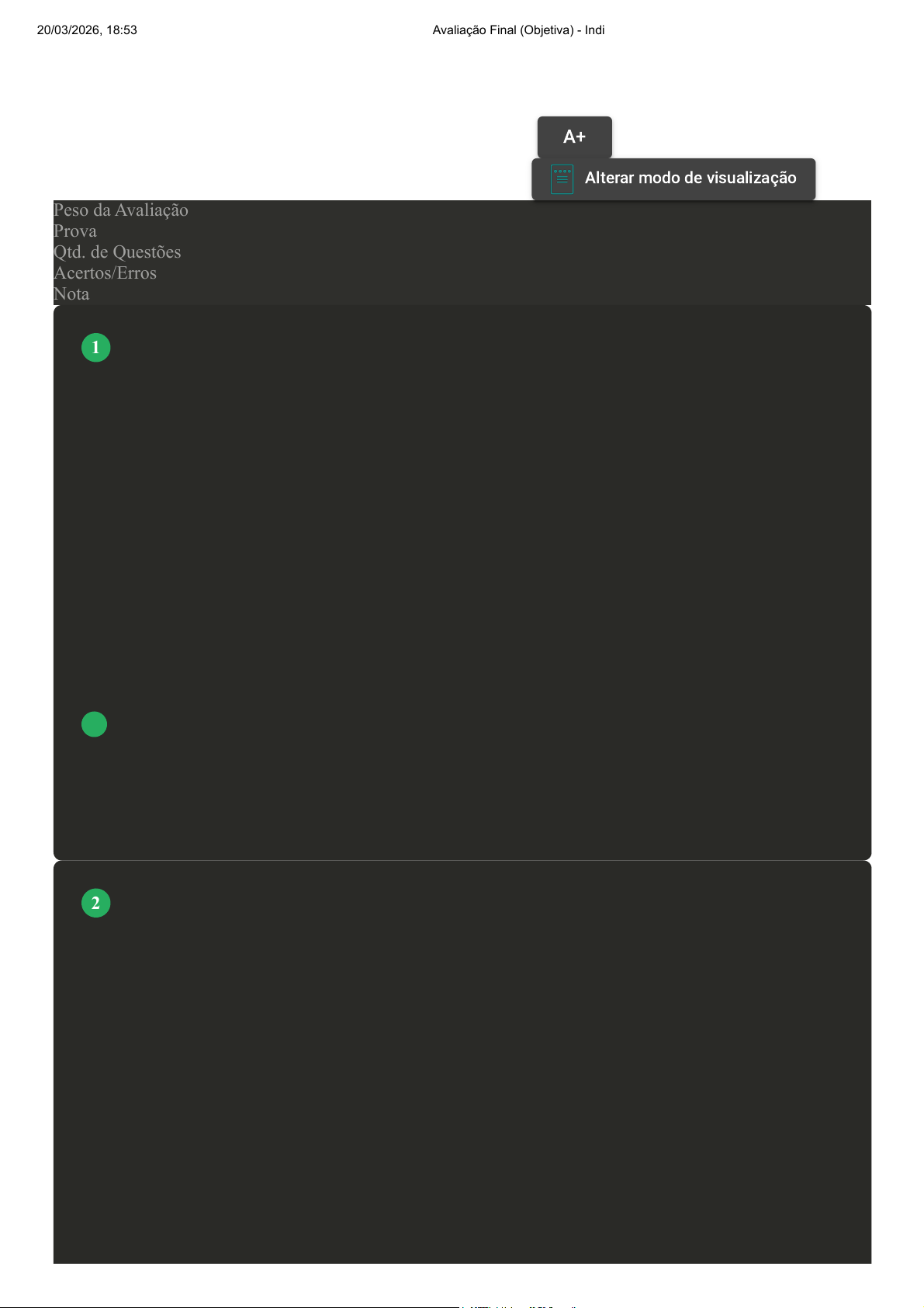 Prova Impressa GABARITO | Avaliação Final (Objetiva) - Individual (Cod.:1592016) Peso da Avaliação 4,00 Prova 116629544 Qtd. de Questões 10 Acertos/Erros 10/0 Nota 10,00 Ao fazer a prospecção de um possível tratamento para um cliente, o profissional da estética deve antes de tudo buscar levantar o máximo de informações possíveis sobre o indivíduo, sua rotina e históricos de saúde e familiar. O nome dessa busca de informações que comumente ocorre através de entrevista é anamnese ou avaliação estética. A avaliação corporal irá pesquisar a presença de alterações estéticas corporais. Com base nas alterações estéticas corporais, assinale a alternativa CORRETA: A Acne e fotoenvelhecimento B Estrias e poros dilatados. C Fibroedema geloide (FEG) e gordura localizada. D Alopecia e dermatite seborreica. A busca por procedimentos estéticos estão cada vez mais em evidência, uma vez que a vaidade está por trás da definição de padrões estéticos. Por essa razão, as ações tomadas na estética facial exigem cuidados dos profissionais da saúde e beleza. Com relação à anamnese, analise as sentenças a seguir: I- Através da ficha de anamnese é possível traçar a conduta terapêutica considerando as possíveis contraindicações e lesões que necessitam de encaminhamento médico. II- Caso um antigo cliente retorne para realizar procedimentos estéticos não se faz necessário passar pela reavaliação, uma vez que já preencheu a ficha de anamnese. VOLTAR A+Aumentar, Fonte Alterar modo de visualização 1 2 20/03/2026, 18:53 Avaliação Final (Objetiva) - Individual about:blank 1/8 III- Os métodos de avaliação incluem a realização da entrevista com ficha de anamnese, exame visual, exame tátil, abordagem superficial, palpação e interrogatório. IV- Não é necessário realizar ficha de anamnese, uma vez que o sucesso do tratamento depende do profissional que executará o procedimento. Assinale a alternativa CORRETA: A As sentenças II e III estão corretas. B As sentenças I e III estão corretas. C As sentenças I e II estão corretas. D As sentenças III e IV estão corretas. [Laboratório Virtual – Avaliação Corporal] A forma como a gordura localizada distribui-se no corpo caracteriza o biotipo corporal. Sabendo disso, assinale a alternativa que descreve o biotipo correto: A Ginoide: mais comum nas mulheres, com acúmulo de gordura nos quadris e nas coxas, lembrando a forma de uma pera. B Androide: mais comum nas mulheres, com acúmulo de gordura no abdome, lembrando a forma de uma maçã. C Androide: mais comum nos homens, com acúmulo de gordura no abdome, nos quadris e nas coxas. D Ginoide: mais comum nos homens, com acúmulo de gordura no abdome, lembrando a forma de uma maçã. 3 20/03/2026, 18:53 Avaliação Final (Objetiva) - Individual about:blank 2/8 Conhecer o tipo de pele é fundamental para conseguir tomar a decisão acertada ao escolher os cuidados específicos de acordo com as necessidades da pele de cada cliente. A qualidade e o tipo de pele são determinados geneticamente, pois determinam a quantidade de glândulas sebáceas encontrada na epiderme. Sobre a pele oleosa, assinale a alternativa CORRETA: A Apresenta uma aparência macia, suave e aveludada. B Apresenta poros visíveis na maior parte do rosto e maior quantidade de sebo. C Apresenta menor número de células na camada córnea que a pele alipídica. D Não é recomendado o uso de hidratantes, pois irá deixar a pele mais oleosa. O rejuvenescimento facial tem como objetivo tratar alterações cutâneas na região da face. Considerando as alterações de envelhecimento, assim como as técnicas disponíveis, deve-se indicar e tratar o cliente com a melhor delas. Segundo Gary D. Monheit, criador do conceito 3Rs, associe os itens, utilizando o código a seguir: I- Renovar a pele. II- Relaxar os músculos. III- Recuperar o volume e redefinir os contornos faciais. ( ) Realizar preenchimento das rugas. ( ) O principal tratamento é a aplicação da toxina botulínica. ( ) Corresponde ao tratamento de manchas senis e fotodermatoses. 4 5 20/03/2026, 18:53 Avaliação Final (Objetiva) - Individual about:blank 3/8 ( ) O tratamento mais adequado é a utilização de ácido hialurônico. Assinale a alternativa que apresenta a sequência CORRETA: A II - III - II - I. B I - II - I - III. C I - I - III - II. D III - II - I - III. A gordura corporal possui papel importante no organismo, sendo necessária para vários processos fisiológicos essenciais. Em contrapartida, a gordura localizada é uma disfunção estética corporal que vem sendo uma das maiores queixas nos centros de estética, sendo o seu tratamento muito procurado. Com relação à gordura localizada, classifique V para as sentenças verdadeiras e F para as falsas: ( ) A distribuição do tecido adiposo e o número de adipócitos são influenciados por fatores genéticos e ambientais. ( ) A disposição de gordura do tipo ginoide tem maior ocorrência entre as mulheres e associa-se à imagem da pera. ( ) A gordura localizada no abdômen, é denominada como androide, e tem maior ocorrência entre os homens. ( ) A única causa do problema entre as pessoas que sofrem com o acúmulo de gordura localizada é a má alimentação. Assinale a alternativa que apresenta a sequência CORRETA: A F - F - V - F. B V - F - F - V. 6 20/03/2026, 18:53 Avaliação Final (Objetiva) - Individual about:blank 4/8 C F - V - V - F. D V - V - V - F. O edema é uma das queixas na estética, que geralmente é pouco citada, mas que influencia muito na caracterização de outras disfunções. Podemos definir edema como o excesso de líquido acumulado no espaço intersticial, ou seja, entre os tecidos do corpo. Sobre o edema intracelular, classifique V para as sentenças verdadeiras e F para as falsas: ( ) Pode ocorrer em decorrência de processo inflamatório nos tecidos. ( ) Ocorre quando há um excesso de filtração, isto é, um extravasamento do 