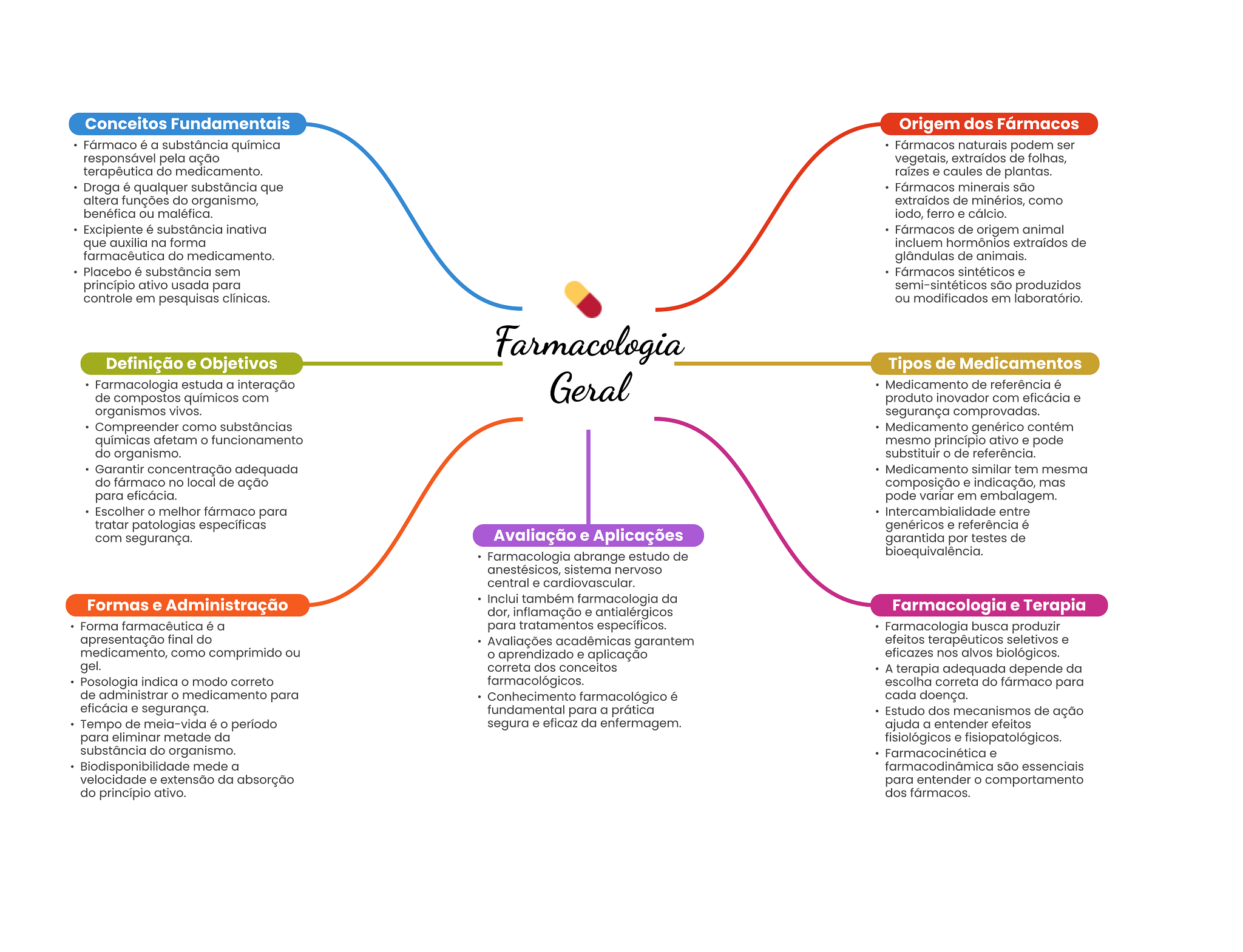 Conceitos Fundamentais Origem dos Fármacos Fármaco é a substância química Fármacos naturais podem ser responsável pela ação vegetais, extraídos de folhas, terapêutica do medicamento. raízes e caules de plantas. Droga é qualquer substância que Fármacos minerais são altera funções do organismo, extraídos de minérios, como benéfica ou maléfica. iodo, ferro e cálcio. Excipiente é substância inativa Fármacos de origem animal que auxilia na forma incluem hormônios extraídos de farmacêutica do medicamento. glândulas de animais. Placebo é substância sem Fármacos sintéticos e princípio ativo usada para semi-sintéticos são produzidos controle em pesquisas clínicas. ou modificados em laboratório. Farmacologia Definição e Objetivos Tipos de Medicamentos Farmacologia estuda a interação Geral Medicamento de referência é de compostos químicos com produto inovador com eficácia e organismos vivos. segurança comprovadas. Compreender como substâncias Medicamento genérico contém químicas afetam O funcionamento mesmo princípio ativo e pode do organismo. substituir de referência. Garantir concentração adequada Medicamento similar tem mesma do fármaco no local de ação composição e indicação, mas para eficácia. pode variar em embalagem. Escolher melhor fármaco para Intercambialidade entre tratar patologias específicas genéricos e referência é com segurança. Avaliação e Aplicações garantida por testes de Farmacologia abrange estudo de bioequivalência. anestésicos, sistema nervoso central e cardiovascular. Formas e Administração Inclui também farmacologia da dor, inflamação e antialérgicos Farmacologia e Terapia Forma farmacêutica é a para tratamentos específicos. Farmacologia busca produzir apresentação final do Avaliações acadêmicas garantem efeitos terapêuticos seletivos e medicamento, como comprimido ou aprendizado e aplicação eficazes nos alvos biológicos. gel. correta dos conceitos A terapia adequada depende da Posologia indica modo correto farmacológicos. escolha correta do fármaco para de administrar medicamento para Conhecimento farmacológico é cada doença. eficácia e segurança. fundamental para a prática Estudo dos mecanismos de ação Tempo de meia-vida é período segura e eficaz da enfermagem. ajuda a entender efeitos para eliminar metade da fisiológicos e fisiopatológicos. substância do organismo. e Biodisponibilidade mede a farmacodinâmica são essenciais velocidade e extensão da absorção para entender comportamento do princípio ativo. dos fármacos.