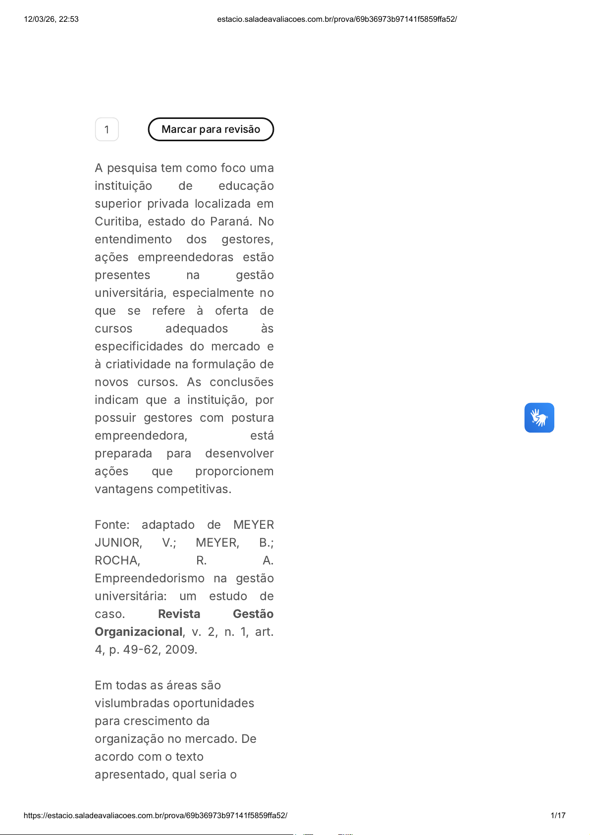 1 Marcar para revisão A pesquisa tem como foco uma instituição de educação superior privada localizada em Curitiba, estado do Paraná. No entendimento dos gestores, ações empreendedoras estão presentes na gestão universitária, especialmente no que se refere à oferta de cursos adequados às especificidades do mercado e à criatividade na formulação de novos cursos. As conclusões indicam que a instituição, por possuir gestores com postura empreendedora, está preparada para desenvolver ações que proporcionem vantagens competitivas. Fonte: adaptado de MEYER JUNIOR, V.; MEYER, B.; ROCHA, R. A. Empreendedorismo na gestão universitária: um estudo de caso. Revista Gestão Organizacional, v. 2, n. 1, art. 4, p. 49-62, 2009. Em todas as áreas são vislumbradas oportunidades para crescimento da organização no mercado. De acordo com o texto apresentado, qual seria o 12/03/26, 22:53 estacio.saladeavaliacoes.com.br/prova/69b36973b97141f5859ffa52/ https://estacio.saladeavaliacoes.com.br/prova/69b36973b97141f5859ffa52/ 1/17 A B C D E diferencial competitivo da instituição de ensino analisada? Conhecimento acadêmico Estrutura organizacional. Gestores competentes Disponibilidade de recursos A postura empreendedora 2 Marcar para revisão Esse artigo buscou responder quais as práticas logísticas presentes na gestão das Pequenas e Médias Empresas (PMEs) que contribuíram para melhorar o seu desempenho, sendo reconhecidas por seus proprietários como fatores determinantes para a manutenção do negócio. Os esforços dedicados pelas empresas pesquisadas às práticas de compras, à administração de estoques e ao atendimento ao cliente foram interpretados, pelos sócios proprietários, como 12/03/26, 22:53 estacio.saladeavaliacoes.com.br/prova/69b36973b97141f5859ffa52/ https://estacio.saladeavaliacoes.com.br/prova/69b36973b97141f5859ffa52/ 2/17 A B C D E instrumentos importantes na gestão do negócio, contribuindo para a manutenção e para o crescimento das empresas. Também ficou clara a importância dos softwares de gestão como ferramenta de apoio à melhoria das práticas logísticas. Fonte: adaptado de SILVA, J. N.; PITASSI, C. Práticas logísticas nas pequenas e médias empresas brasileiras. Revista ADM.MADE, v. 17, n. 2, p. 29-48, 2013. Qual fator crítico de sucesso que é impactado pela melhoria de práticas logísticas nas organizações? Excelência operacional Transparência de gestão Prestação de contas Atração e retenção de talentos Definição de objetivos e metas 12/03/26, 22:53 estacio.saladeavaliacoes.com.br/prova/69b36973b97141f5859ffa52/ https://estacio.saladeavaliacoes.com.br/prova/69b36973b97141f5859ffa52/ 3/17 A B 3 Marcar para revisão O capital humano é um dos maiores ativos de uma empresa, e ter uma equipe de alto desempenho pode proporcionar uma vantagem competitiva significativa. Neste sentido, a organização pode criar um ambiente de trabalho positivo, ao oferecer oportunidades de desenvolvimento profissional, reconhecer o bom desempenho e proporcionar remuneração e benefícios competitivos. As empresas que conseguem atrair e reter talentos de alta qualidade são mais propensas a inovar, crescer e ter sucesso a longo prazo. Qual é o impacto da atração e retenção de talentos para o sucesso de um empreendimento? A atração e retenção de talentos são irrelevantes para o sucesso de um empreendimento As empresas devem se concentrar apenas na atração de talentos, pois a retenção de talentos não é importante 12/03/26, 22:53 estacio.saladeavaliacoes.com.br/prova/69b36973b97141f5859ffa52/ https://estacio.saladeavaliacoes.com.br/prova/69b36973b97141f5859ffa52/ 4/17 C D E A atração e retenção de talentos é um fator crítico de sucesso, uma vez que a montagem de uma equipe de alto desempenho pode proporcionar uma vantagem competitiva e contribuir para a inovação, crescimento e sucesso a longo prazo. Apenas a remuneração e benefícios competitivos são necessários para atrair e reter talentos As empresas devem se concentrar apenas na retenção de talentos, pois a atração de novos talentos é menos importante 4 Marcar para revisão A gestão por competências é uma abordagem estratégica que busca alinhar os conhecimentos, habilidades e atitudes dos colaboradores às metas e objetivos da 12/03/26, 22:53 estacio.saladeavaliacoes.com.br/prova/69b36973b97141f5859ffa52/ https://estacio.saladeavaliacoes.com.br/prova/69b36973b97141f5859ffa52/ 5/17 A B organização. Nesse contexto, as competências empreendedoras permitem a identificação e exploração de oportunidades de negócios, a resolução de problemas e a tomada de decisões de forma inovadora e estratégica Fonte: adaptado de CAMPOS, T. M.; LIMA, E. O. Um Estudo sobre os Fatores que influenciam no Desenvolvimento de Competências Empreendedoras. Revista Pretexto, v. 20, n. 1, p. 38-56, 2019. De acordo com o texto, qual é o objetivo da gestão por competências em relação às competências empreendedoras? Ignorar as competências empreendedoras, pois elas são consideradas menos importantes para a empresa Identificar, desenvolver e reforçar as competências empreendedoras entre os colaboradores para impulsionar a inovação e o crescimento da empresa 12/03/26, 22:53 estacio.saladeavaliacoes.com.br/prova/69b36973b97141f5859ffa52/ https://estacio.saladeavaliacoes.com.br/prova/69b36973b97141f5859ffa52/ 6/17 C D E Limitar as competências empreendedoras apenas à criatividade e liderança Enfatizar apenas a resiliência e a proatividade, ignorando outras competências empreendedoras Desencorajar o desenvolvimento de habilidades interpessoais como uma competência empreendedora 5 Marcar para revisão O presente trabalho relata o processo percorrido pela empresa ALFA, fabricante no setor de iluminação para o desenvolvimento de novo negócio por meio de aliança formada com seu distribuidor para atuação no segmento de projetos de iluminação. O processo iniciou-se 