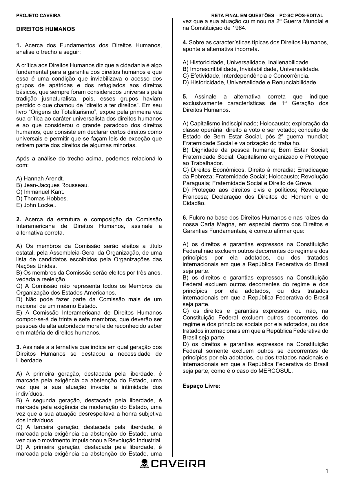 PROJETO CAVEIRA RETA FINAL EM QUESTÕES – PC-SC PÓS-EDITAL 1 DIREITOS HUMANOS 1. Acerca dos Fundamentos dos Direitos Humanos, analise o trecho a seguir: A crítica aos Direitos Humanos diz que a cidadania é algo fundamental para a garantia dos direitos humanos e que essa é uma condição que inviabilizava o acesso dos grupos de apátridas e dos refugiados aos direitos básicos, que sempre foram considerados universais pela tradição jusnaturalista, pois, esses grupos haviam perdido o que chamou de “direito a ter direitos”. Em seu livro “Origens do Totalitarismo”, expõe pela primeira vez sua crítica ao caráter universalista dos direitos humanos e ao que considerou o grande paradoxo dos direitos humanos, que consiste em declarar certos direitos como universais e permitir que se façam leis de exceção que retirem parte dos direitos de algumas minorias. Após a análise do trecho acima, podemos relacioná-lo com: A) Hannah Arendt. B) Jean-Jacques Rousseau. C) Immanuel Kant. D) Thomas Hobbes. E) John Locke.. 2. Acerca da estrutura e composição da Comissão Interamericana de Direitos Humanos, assinale a alternativa correta. A) Os membros da Comissão serão eleitos a título estatal, pela Assembleia-Geral da Organização, de uma lista de candidatos escolhidos pela Organizações das Nações Unidas. B) Os membros da Comissão serão eleitos por três anos, vedada a reeleição. C) A Comissão não representa todos os Membros da Organização dos Estados Americanos. D) Não pode fazer parte da Comissão mais de um nacional de um mesmo Estado. E) A Comissão Interamericana de Direitos Humanos compor-se-á de trinta e sete membros, que deverão ser pessoas de alta autoridade moral e de reconhecido saber em matéria de direitos humanos. 3. Assinale a alternativa que indica em qual geração dos Direitos Humanos se destacou a necessidade de Liberdade. A) A primeira geração, destacada pela liberdade, é marcada pela exigência da abstenção do Estado, uma vez que a sua atuação invadia a intimidade dos indivíduos. B) A segunda geração, destacada pela liberdade, é marcada pela exigência da moderação do Estado, uma vez que a sua atuação desrespeitava a honra subjetiva dos indivíduos. C) A terceira geração, destacada pela liberdade, é marcada pela exigência da abstenção do Estado, uma vez que o movimento impulsionou a Revolução Industrial. D) A primeira geração, destacada pela liberdade, é marcada pela exigência da abstenção do Estado, uma vez que a sua atuação culminou na 2ª Guerra Mundial e na Constituição de 1964. 4. Sobre as características típicas dos Direitos Humanos, aponte a alternativa incorreta. A) Historicidade, Universalidade, Inalienabilidade. B) Imprescritibilidade, Inviolabilidade, Universalidade. C) Efetividade, Interdependência e Concorrência. D) Historicidade, Universalidade e Renunciabilidade. 5. Assinale a alternativa correta que indique exclusivamente características de 1ª Geração dos Direitos Humanos. A) Capitalismo indisciplinado; Holocausto; exploração da classe operária; direito a voto e ser votado; conceito de Estado de Bem Estar Social, pós 2ª guerra mundial; Fraternidade Social e valorização do trabalho. B) Dignidade da pessoa humana; Bem Estar Social; Fraternidade Social; Capitalismo organizado e Proteção ao Trabalhador. C) Direitos Econômicos, Direito à moradia; Erradicação da Pobreza; Fraternidade Social; Holocausto; Revolução Paraguaia; Fraternidade Social e Direito de Greve. D) Proteção aos direitos civis e políticos; Revolução Francesa; Declaração dos Direitos do Homem e do Cidadão. 6. Fulcro na base dos Direitos Humanos e nas raízes da nossa Carta Magna, em especial dentro dos Direitos e Garantias Fundamentais, é correto afirmar que: A) os direitos e garantias expressos na Constituição Federal não excluem outros decorrentes do regime e dos princípios por ela adotados, ou dos tratados internacionais em que a República Federativa do Brasil seja parte. B) os direitos e garantias expressos na Constituição Federal excluem outros decorrentes do regime e dos princípios por ela adotados, ou dos tratados internacionais em que a República Federativa do Brasil seja parte. C) os direitos e garantias expressos, ou não, na Constituição Federal excluem outros decorrentes do regime e dos princípios sociais por ela adotados, ou dos tratados internacionais em que a República Federativa do Brasil seja parte. D) os direitos e garantias expressos na Constituição Federal somente excluem outros se decorrentes de princípios por ela adotados, ou dos tratados nacionais e internacionais em que a República Federativa do Brasil seja parte, como é o caso do MERCOSUL. Espaço Livre: 467580.18/03/2026 857.081.860-20.142219 Não é vedada a reeleição, pode + 1 mandato 4 anos 7 PROJETO CAVEIRA RETA FINAL EM QUESTÕES – PC-SC PÓS-EDITAL 2 7. Dentre as características dos Direitos Humanos e do nosso ordenamento Pátrio, em especial a regra do art.7º da CRFB, aponte a afirmativa correta sobre o Tribunal Internacional Penal. A) O Brasil não propugnará pela formação de um tribunal internacional dos direitos humanos. B) O Brasil aderiu como Estado Membro e propugnou pela criação de um tribunal internacional Penal dos direitos humanos, em Genebra, a fim de evitar um estado de exceção. C) O Brasil se submete à jurisdição de Tribunal Penal Internacional a cuja criação tenha manifestado adesão. D) O Brasil não se submete à jurisdição de Tribunal Penal Internacional, diante da interindependência das nações. 8. Como característica de Direitos Humanos, é prudente e correto afirmar que: A) Nas hipóteses de grave violação de direitos humanos, o Procurador-Geral da República, com a finalidade de assegurar o cumprimento de obrigações decorrentes de tratados internacionais de direitos humanos dos quais o Brasil seja parte (ou não), poderá suscitar, perante o Supremo Tribunal F