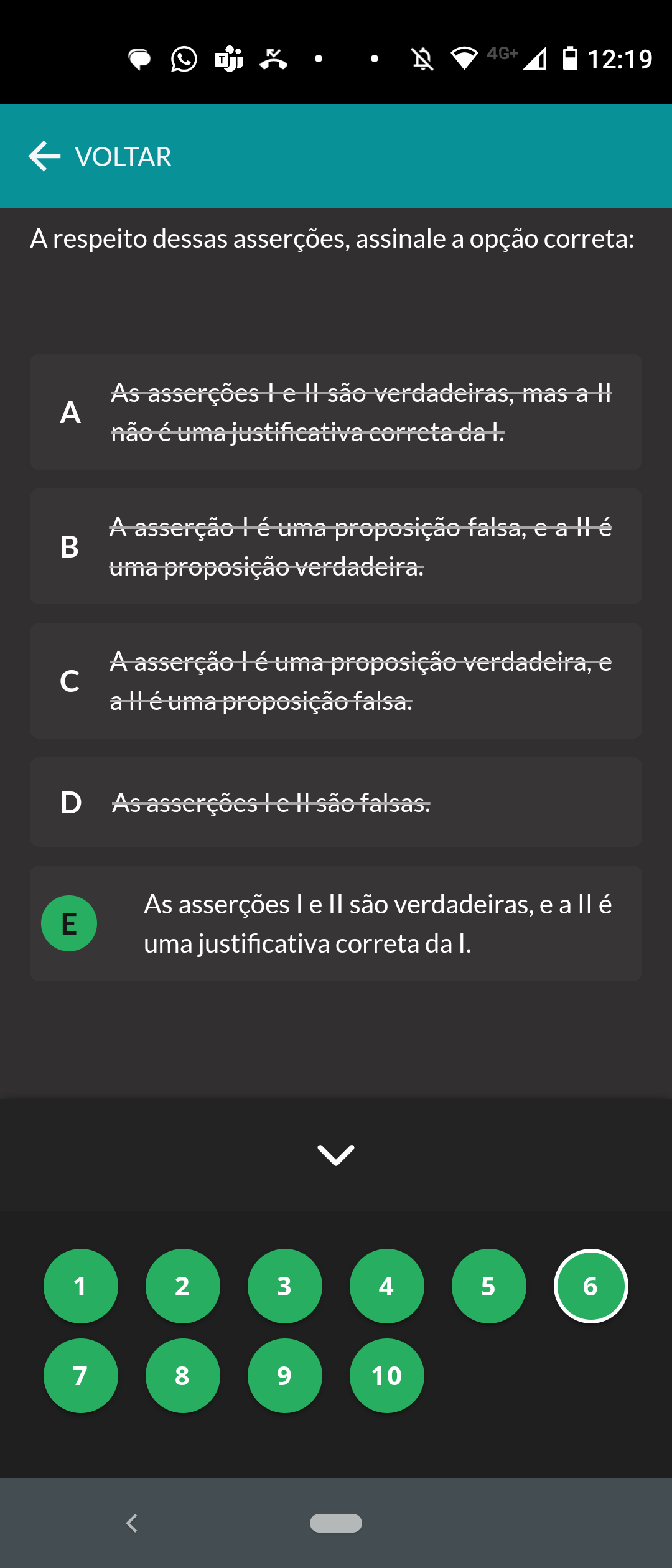 4G+ 12:19 VOLTAR respeito dessas asserções, assinale a opção correta: As asserções le H são verdadeiras, mas a H A não é uma justificativa correta da I. A asserção lé uma proposição falsa, uma proposição verdadeira. A asserção lé uma proposição verdadeira, e c a é uma proposição falsa. D As asserções le H são falsas. As asserções e são verdadeiras, e a é E uma justificativa correta da I. 1 2 3 4 5 6 7 8 9 10