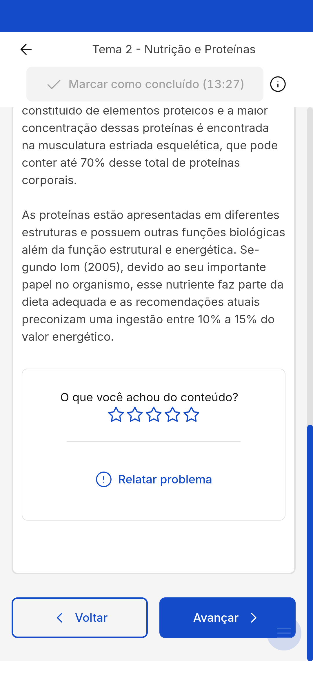 Tema 2 - Nutrição e Proteínas Marcar como concluído (13:27) i constituido de elementos proteicos e a maior concentração dessas proteínas é encontrada na musculatura estriada esquelética, que pode conter até 70% desse total de proteínas corporais. As proteínas estão apresentadas em diferentes estruturas e possuem outras funções biológicas além da função estrutural e energética. Se- gundo lom (2005), devido ao seu importante papel no organismo, esse nutriente faz parte da dieta adequada e as recomendações atuais preconizam uma ingestão entre 10% a 15% do valor energético. O que você achou do conteúdo? ! Relatar problema