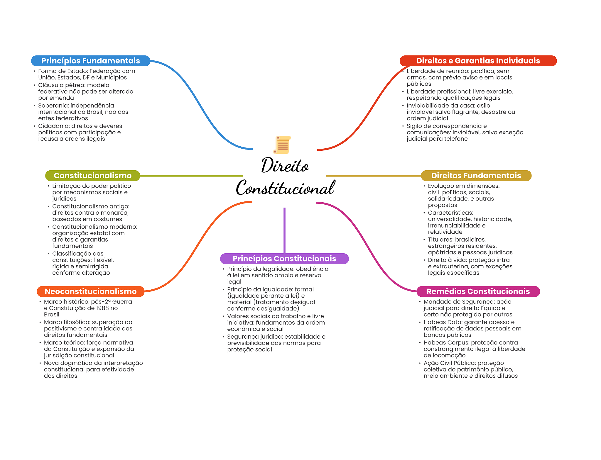 Princípios Fundamentais Direitos e Garantias Individuais Forma de Estado: Federação com Liberdade reunião: pacífica, sem União, Estados, DF e Municípios armas, com prévio e em locais Cláusula pétrea: modelo públicos federativo não pode ser alterado Liberdade profissional: livre exercício, por emenda respeitando qualificações legais Soberania: independência Inviolabilidade da casa: asilo internacional do Brasil, não dos inviolável salvo flagrante, desastre ou entes federativos ordem judicial Cidadania: direitos e deveres Sigilo de correspondência e políticos com participação e comunicações: inviolável, salvo exceção recusa a ordens ilegais judicial para telefone Direito Constitucionalismo Direitos Fundamentais Limitação do poder político Constitucional Evolução em dimensões: por mecanismos sociais e civil-políticos, sociais, jurídicos solidariedade, e outras Constitucionalismo antigo: propostas direitos contra O monarca, Características: baseados em costumes universalidade, historicidade, Constitucionalismo moderno: e organização estatal com relatividade direitos e garantias Titulares: brasileiros, fundamentais estrangeiros residentes, Classificação das apátridas e pessoas jurídicas constituições: flexível, Princípios Constitucionais Direito à vida: proteção intra rígida e semirrígida Princípio da legalidade: obediência e extrauterina, com exceções conforme alteração à lei em sentido amplo e reserva legais específicas legal Neoconstitucionalismo Princípio da igualdade: formal Remédios Constitucionais (igualdade perante a lei) e Marco histórico: Guerra material (tratamento desigual Mandado de Segurança: ação e Constituição de 1988 no conforme desigualdade) judicial para direito líquido e Brasil Valores sociais do trabalho e livre certo não protegido por outros Marco filosófico: superação do iniciativa: fundamentos da ordem Habeas Data: garante acesso e positivismo e centralidade dos econômica e social retificação de dados pessoais em direitos fundamentais Segurança jurídica: estabilidade e bancos públicos Marco teórico: força normativa previsibilidade das normas para Habeas Corpus: proteção contra da Constituição e expansão da proteção social constrangimento ilegal à liberdade jurisdição constitucional de locomoção Nova dogmática da interpretação Ação Civil Pública: proteção constitucional para efetividade coletiva do patrimônio público, dos direitos meio ambiente e direitos difusos