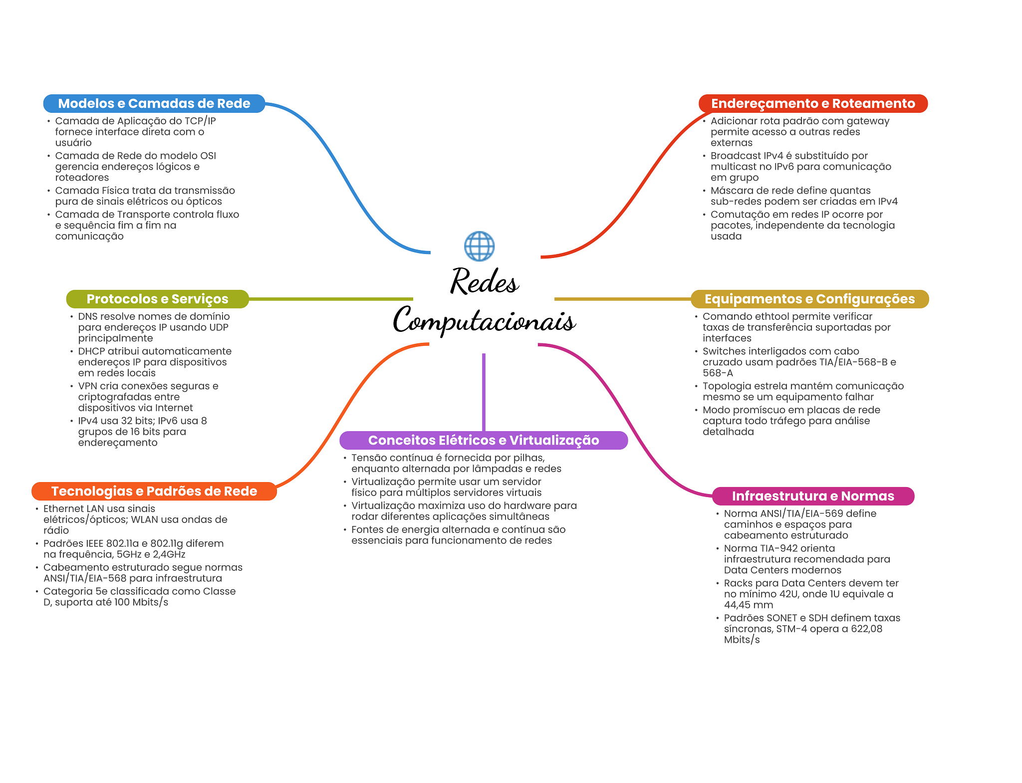 Modelos e Camadas de Rede Endereçamento e Roteamento Camada de Aplicação do TCP/IP Adicionar rota padrão com gateway fornece interface direta com permite acesso a outras redes usuário externas Camada de Rede do modelo OSI Broadcast IPv4 é substituído por gerencia endereços lógicos e multicast no IPv6 para comunicação roteadores em grupo Camada Física trata da transmissão Máscara de rede define quantas pura de sinais elétricos ou ópticos sub-redes podem ser criadas em IPv4 Camada de Transporte controla fluxo Comutação em redes IP ocorre por e sequência fim a fim na pacotes, independente da tecnologia comunicação usada Redes Protocolos e Serviços Equipamentos e Configurações DNS resolve nomes de domínio Computacionais Comando ethtool permite verificar para endereços IP usando UDP taxas de transferência suportadas por principalmente interfaces DHCP atribui automaticamente Switches interligados com cabo endereços IP para dispositivos cruzado usam padrões TIA/EIA-568-B e em redes locais 568-A VPN cria conexões seguras e Topologia estrela mantém comunicação criptografadas entre mesmo se um equipamento falhar dispositivos via Internet Modo promíscuo em placas de rede IPv4 usa 32 bits; IPv6 usa 8 captura todo tráfego para análise grupos de 16 bits para detalhada endereçamento Conceitos Elétricos e Virtualização Tensão contínua é fornecida por pilhas, enquanto alternada por lâmpadas e redes Virtualização permite usar um servidor Tecnologias e Padrões de Rede físico para múltiplos servidores virtuais Infraestrutura e Normas Ethernet LAN usa sinais Virtualização maximiza uso do hardware para elétricos/ópticos; WLAN usa ondas de rodar diferentes aplicações simultâneas Norma ANSI/TIA/EIA-569 define rádio Fontes de energia alternada e contínua são caminhos e espaços para cabeamento estruturado Padrões IEEE e 802.11g diferem essenciais para funcionamento de redes Norma TIA-942 orienta na frequência, 5GHz e 2,4GHz infraestrutura recomendada para Cabeamento estruturado segue normas Data Centers modernos ANSI/TIA/EIA-568 para infraestrutura Racks para Data Centers devem ter Categoria 5e classificada como Classe no mínimo 42U, onde 1U equivale a D, suporta até 100 Mbits/s 44,45 mm Padrões SONET e SDH definem taxas síncronas, STM-4 opera a 622,08 Mbits/s
