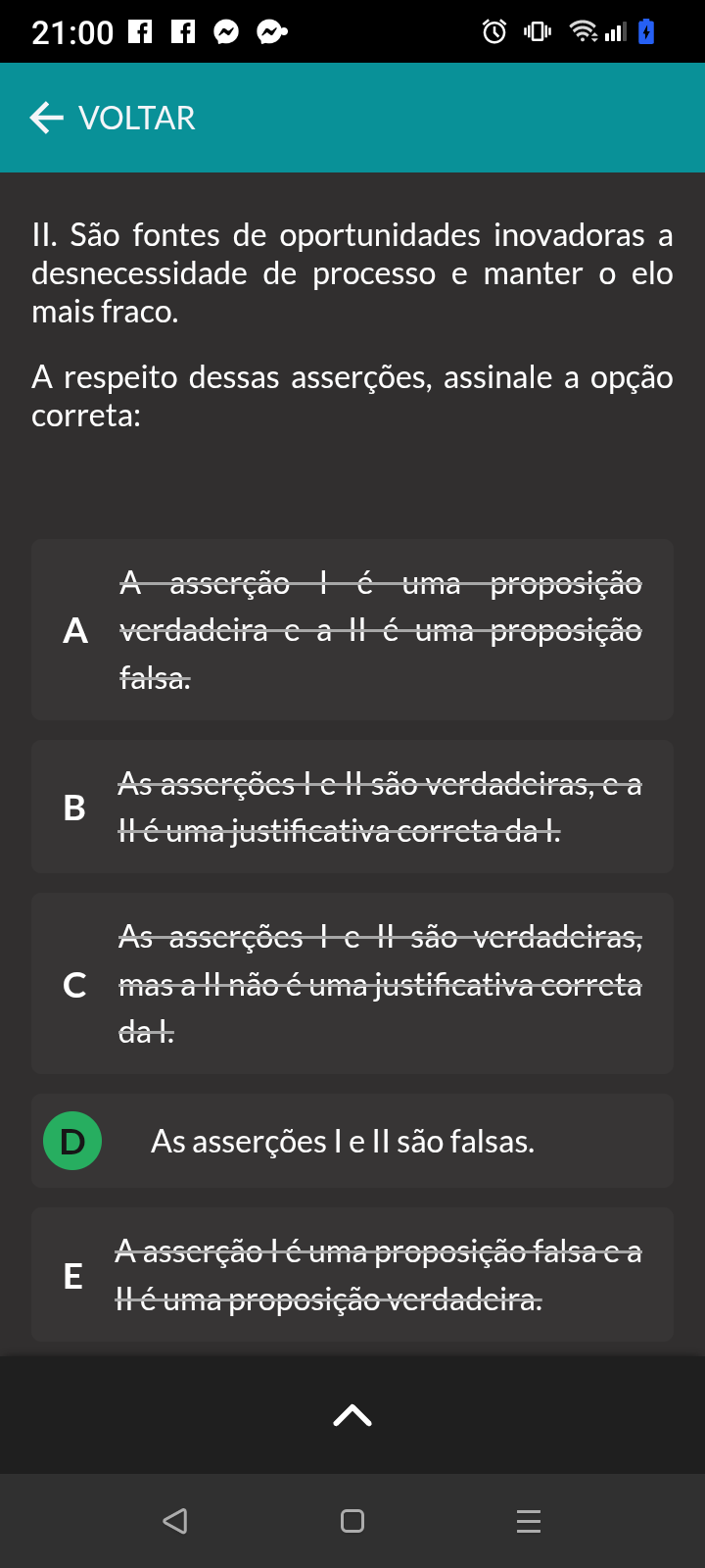 21:00 f f VOLTAR II. São fontes de oportunidades inovadoras a desnecessidade de processo e manter o elo mais fraco. A respeito dessas asserções, assinale a opção correta: A asserção é uma proposição A verdadeira e a H é uma proposição falsa. As asserções le H são verdadeiras, e a H é uma justificativa correta da As asserções H são verdadeiras, c mas a H não é uma justificativa correta dal. D As asserções le são falsas. A asserção lé uma proposição falsa ca E uma proposição verdadeira.
