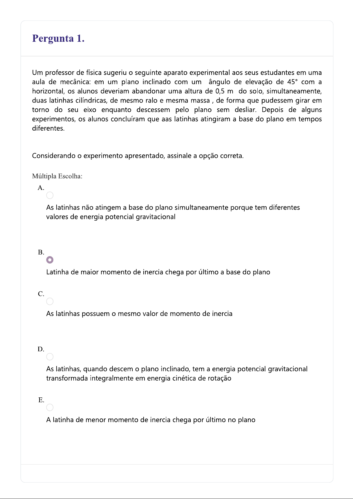 Pergunta 1. Um professor de física sugeriu o seguinte aparato experimental aos seus estudantes em uma aula de mecânica: em um plano inclinado com um ângulo de elevação de 45° com a horizontal, os alunos deveriam abandonar uma altura de 0,5 m do solo, simultaneamente, duas latinhas cilíndricas, de mesmo ralo e mesma massa de forma que pudessem girar em torno do seu eixo enquanto descessem pelo plano sem desliar. Depois de alguns experimentos, os alunos concluíram que aas latinhas atingiram a base do plano em tempos diferentes. Considerando experimento apresentado, assinale a opção correta. Múltipla Escolha: A. As latinhas não atingem a base do plano simultaneamente porque tem diferentes valores de energia potencial gravitacional B. Latinha de maior momento de inercia chega por último a base do plano C. As latinhas possuem mesmo valor de momento de inercia D. As latinhas, quando descem plano inclinado, tem a energia potencial gravitacional transformada integralmente em energia cinética de rotação E. A latinha de menor momento de inercia chega por último no planoAvaliação Nota Avaliada: 0,300 de 0,300 Prof. NAYARA CAROLINE URBANO em 22/05/2025 11:30 Pergunta 2. pontos: 0,700 Uma família vai realizar uma viagem de Marília para São Paulo no final de semana, sabendo que limite de velocidade na pista é 80 km/h, e Marcelo gosta de viajar sem pressa, ele vai realizar essa viagem na média de 75 km/h, sabendo que os pneus possuem 82 cm de diâmetro, qual será a velocidade angular dos pneus em relação aos respectivos eixos? Resposta Dissertativa: Para determinar a velocidade angular dos pneus durante uma viagem, é necessário compreender a relação entre a velocidade linear do veículo (a velocidade com que ele se desloca ao longo da estrada) e o raio das rodas. Neste caso, a família viaja de Marília a São Paulo a uma velocidade média de 75 km/h, e os pneus do veículo possuem um diâmetro de 82 centímetros. A partir disso, podemos calcular a velocidade angular (w) das rodas em relação ao eixo. primeiro passo é converter a velocidade de quilômetros por hora (km/h) para metros por segundo (m/s), pois as demais unidades do cálculo trabalham no Sistema Internacional. A fórmula utilizada para essa conversão é: X 1000 v = 3600 v=3600Vkm/hx1000 Aplicando ao exemplo: v = 3600 Em seguida, é necessário encontrar o raio dos pneus. Sabendo que diâmetro informado é 82 cm (ou 0,82 metros), usamos a fórmula: d 0,82 r=2d=r=20,82=0,41mCom a velocidade linear e raio, podemos calcular a velocidade angular, que representa a taxa de variação do ângulo com tempo, ou seja, quantos radianos por segundo pneu gira. A fórmula para a velocidade angular é: w = 3 w=rv Substituindo os valores: 20,83 ≈ 50,8 rad/s 0,41 Portanto, a velocidade angular dos pneus nessa viagem será aproximadamente 50,8 rad/s, o que significa que cada pneu gira a uma taxa de 50,8 radianos por segundo em torno de seu eixo. Avaliação Nota Avaliada: 0,700 de 0,700 Prof. NAYARA CAROLINE URBANO em 22/05/2025 11:30 Fechar Visualização