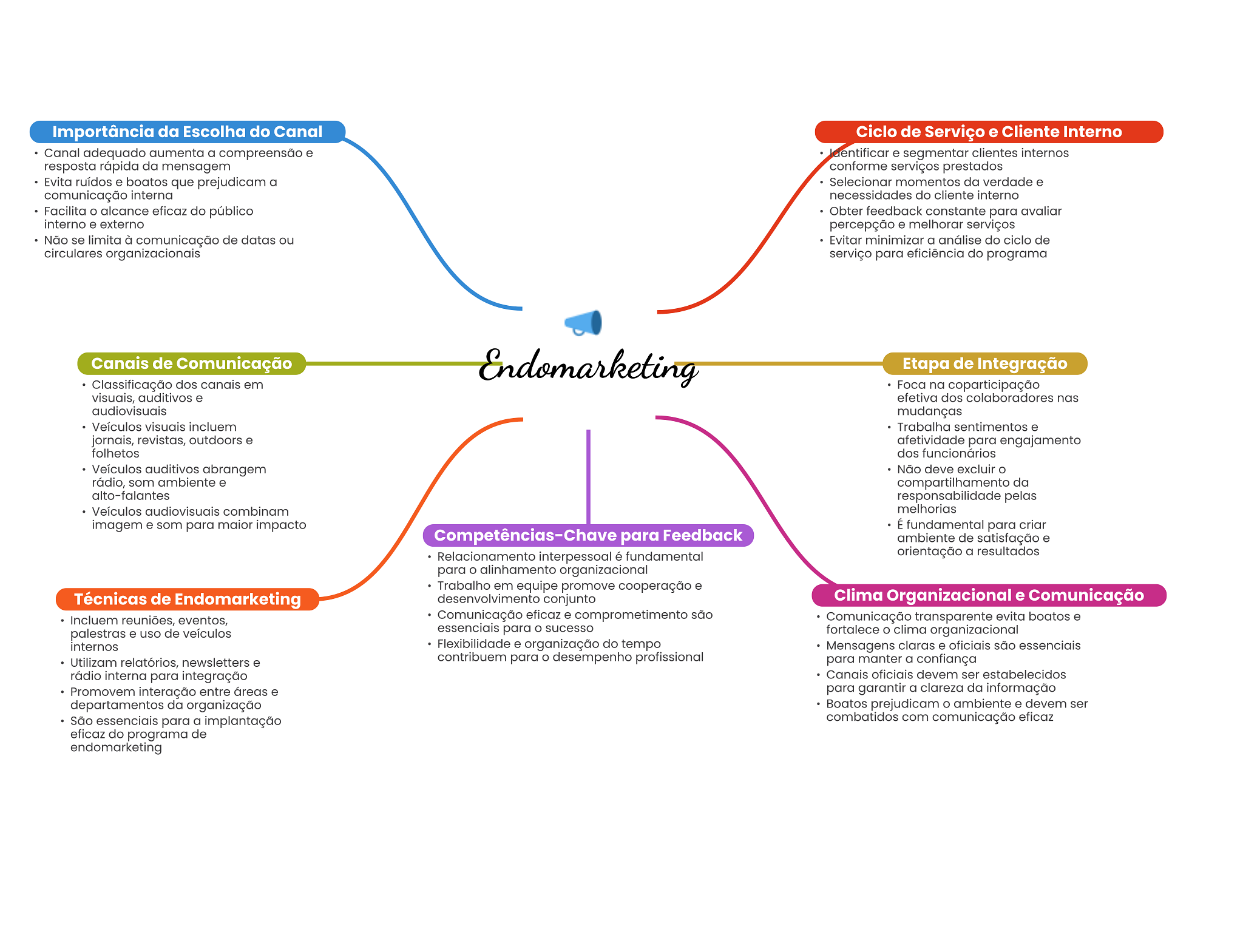 Importância da Escolha do Canal Ciclo de Serviço e Cliente Interno Canal adequado aumenta a compreensão e Identificar e segmentar clientes internos resposta rápida da mensagem conforme serviços prestados Evita ruídos e boatos que prejudicam a Selecionar momentos da verdade e comunicação interna necessidades do cliente interno Facilita alcance eficaz do público Obter feedback constante para avaliar interno e externo percepção e melhorar serviços Não se limita à comunicação de datas ou Evitar minimizar a análise do ciclo de circulares organizacionais serviço para eficiência do programa Canais de Comunicação Endomarketing Etapa de Integração Classificação dos canais em Foca na coparticipação visuais, auditivos e efetiva dos colaboradores nas audiovisuais mudanças Veículos visuais incluem Trabalha sentimentos e jornais, revistas, outdoors e afetividade para engajamento folhetos dos funcionários Veículos auditivos abrangem Não deve excluir rádio, som ambiente e compartilhamento da alto-falantes responsabilidade pelas Veículos audiovisuais combinam melhorias imagem e som para maior impacto É fundamental para criar Competências-Chave para Feedback ambiente de satisfação e Relacionamento interpessoal é fundamental orientação a resultados para O alinhamento organizacional Trabalho em equipe promove cooperação e Técnicas de Endomarketing desenvolvimento conjunto Clima Organizacional e Comunicação Incluem reuniões, eventos, Comunicação eficaz e comprometimento são Comunicação transparente evita boatos e palestras e uso de veículos essenciais para O sucesso fortalece clima organizacional internos Flexibilidade e organização do tempo Mensagens claras e oficiais são essenciais Utilizam relatórios, newsletters e contribuem para desempenho profissional para manter a confiança rádio interna para integração Canais oficiais devem ser estabelecidos Promovem interação entre áreas e para garantir a clareza da informação departamentos da organização Boatos prejudicam ambiente e devem ser São essenciais para a implantação combatidos com comunicação eficaz eficaz do programa de endomarketing