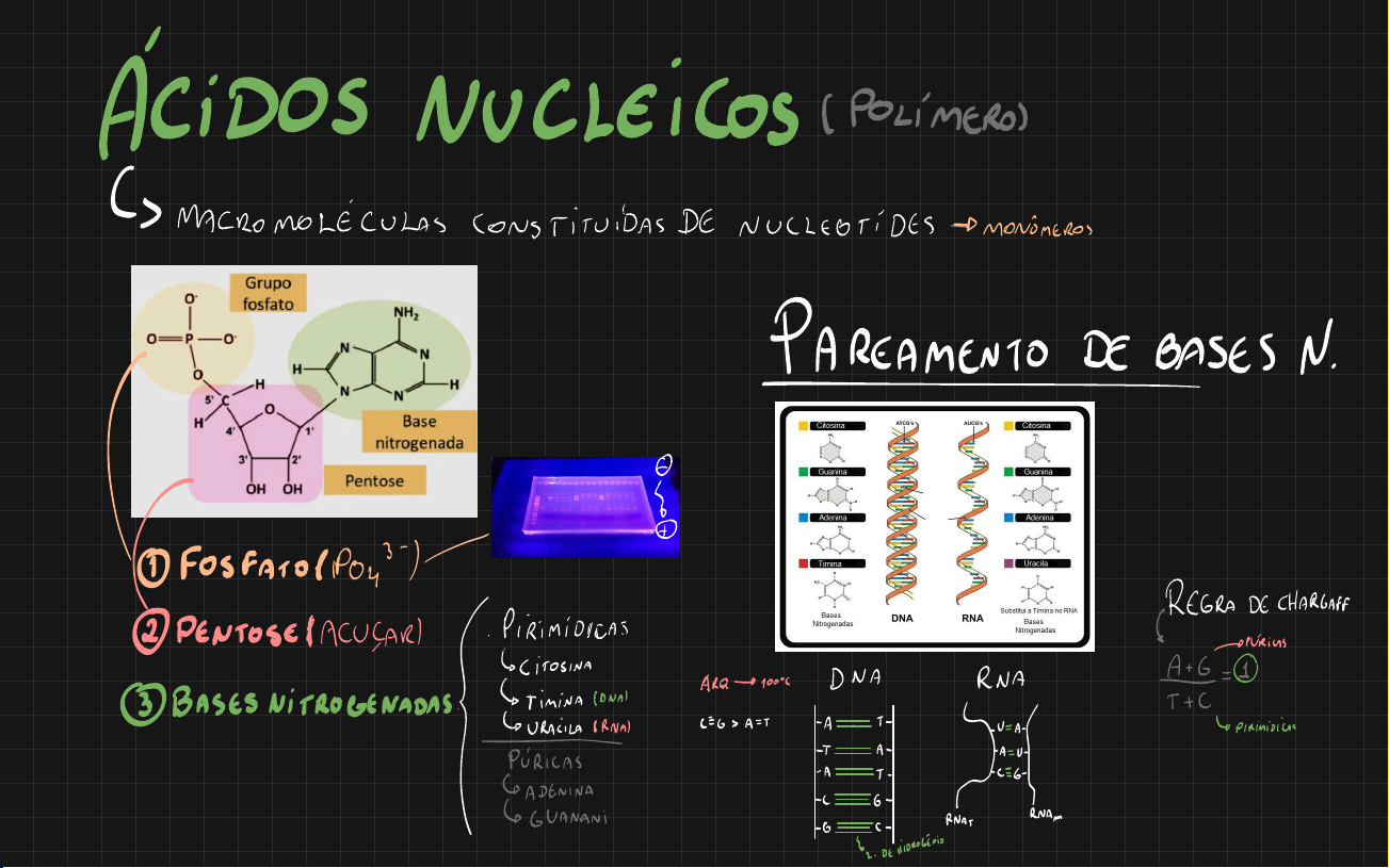 ↑ ACIDOS NUCLEiCOS IPOLIMERO ↳ Macromoléculas Constituídas De nucleotídes emonômero &AREAMENTO BE BASES N. E( #⑳FosfatoDout ↳ &EGRA BE CHARGAff ②PENTOSEDACUÇAR /Pirimidias ↳ -PURICAS Es1 TOSINA &BASES Nitrogenadas Crimina eduar ARQ -o 100% BNA RNA # DRNA) C=G A = T -A To ↳ Primisie -T A -Tr - A To Sim -26- ↳ GUANANi RNAT -- ↳ L . BE Hidrogénio INAiÁCIDOS NUCLEico DNA RNA IH - - - ESTRUTURA F . SIMPLESF . DUPLA - He o RIBOSE DESOXIRRIBOSE H202 i~o l O ! BASES C= 6Vitrobra =G - /Organização Antiparalelas I~ HEREDITARIEDADE HEREDITARIEDADE - Funções (VIRUS) Especificidade enzimática SuSíntese proteica Síntese protfica - & POR Que yuplicar o Fnal L A CICLO CELULAR C células fichas · ①Duplicação celular quiescencia &como O DNa se Duplicar ⑭ 61 +$+ 62= INTERFASE ·- SÍNTESE DE BNA & DunocromossorAtestfoi (UPLICAÇÃO BA.ROMATINA S N - S From agindo ROMATINANTENE e e · * . cromossomos A C = ↑ Tempo 61 S 62 Eo V Transcrição TraduçãoDUPLICAÇÃODNA agazorna - prot②· REPLICAÇÃO - A = T- 3 - 6 S 3 si ↑ - A - T - i ⑭nerver- -[ 6- E - L ! 6 = ↑ CADA molécul E METABE -T = A - - T An 3 -A u . 3 T NOVA, METADE VELHA - A= T- - A - ENZIMA -- i T- -A T - · HELICSt -26- 5 ↑ ! - 1 = 6- - - L 6 - -6- . ABRE AS FITAS A- 6- ↑ 3 G · -I ↓ 6- · ·S (DUBH HELICE) - S - i FITAS Unidas ↑ I L L 6 si 3 ↑ - is -VA= 1 S 3 # DNAMESEI FITA LÍDER &Na PolimeraSeT - ↳ - 31 - * Tod Primer CONSTRUÍDO DEMODO CONTINUA RNA FRAGMENTOS DE OKASAki·construindo emEtapas 31 FomTen Na polimeras SSBS Não Deix A FITAA ARDADA ⑮printiDSust fita Fechar