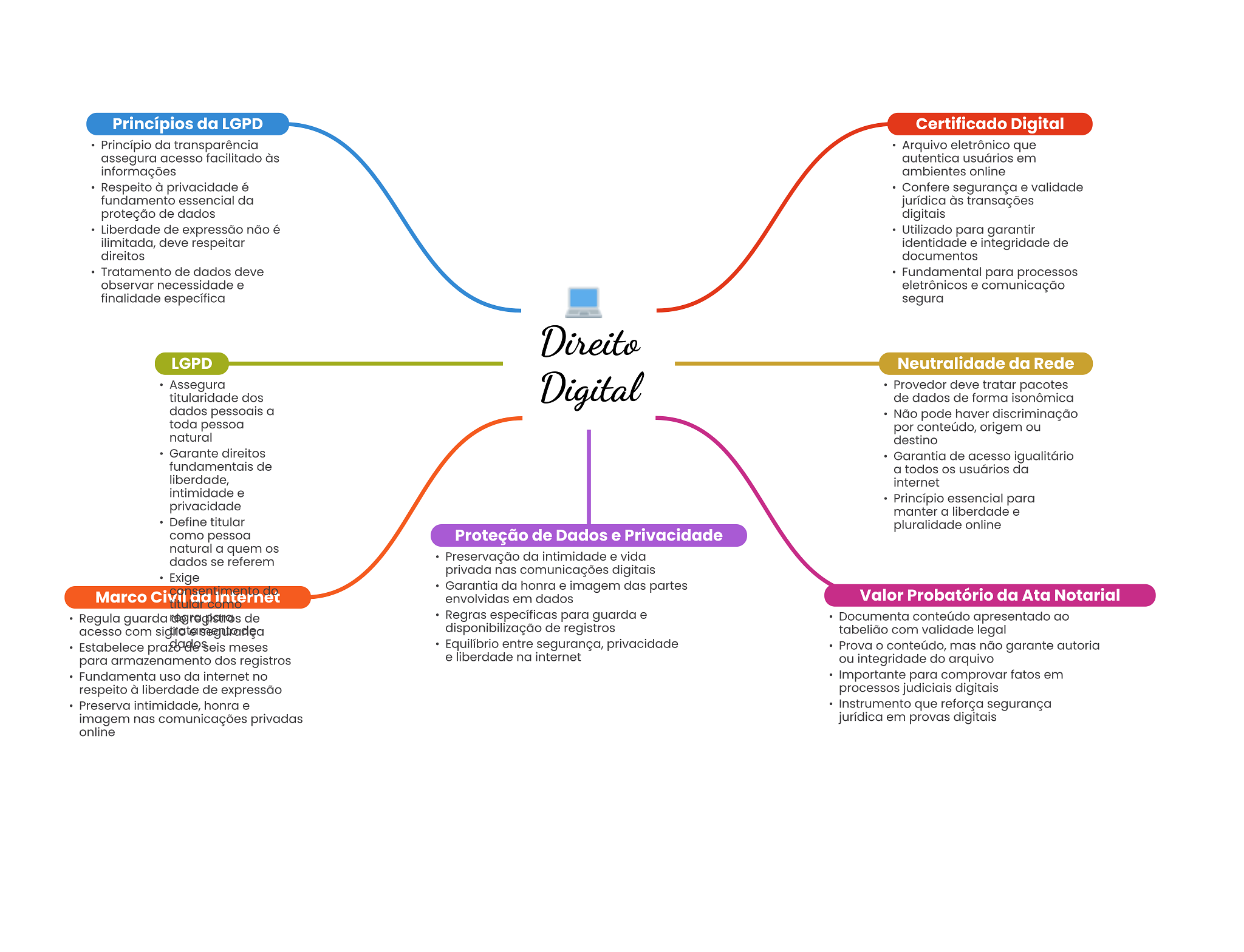 Princípios da LGPD Certificado Digital Princípio da transparência Arquivo eletrônico que assegura acesso facilitado às autentica usuários em informações ambientes online Respeito à privacidade é Confere segurança e validade fundamento essencial da jurídica às transações proteção de dados digitais Liberdade de expressão não é Utilizado para garantir ilimitada, deve respeitar identidade e integridade de direitos documentos Tratamento de dados deve Fundamental para processos observar necessidade e eletrônicos e comunicação finalidade específica segura Direito LGPD Neutralidade da Rede Assegura titularidade dos Digital Provedor deve tratar pacotes de dados de forma isonômica dados pessoais a Não pode haver discriminação toda pessoa por conteúdo, origem ou natural destino Garante direitos Garantia de acesso igualitário fundamentais de a todos OS usuários da liberdade, internet intimidade e Princípio essencial para privacidade manter a liberdade e Define titular pluralidade online como pessoa Proteção de Dados e Privacidade natural a quem OS dados se referem Preservação da intimidade e vida privada nas comunicações digitais Exige Garantia da honra e imagem das partes Marco Civil da internet envolvidas em dados Valor Probatório da Ata Notarial Regula guarda de Regras específicas para guarda e Documenta conteúdo apresentado ao acesso com disponibilização de registros tabelião com validade legal Estabelece meses Equilíbrio entre segurança, privacidade Prova conteúdo, mas não garante autoria para armazenamento dos registros e liberdade na internet ou integridade do arquivo Fundamenta uso da internet no Importante para comprovar fatos em respeito à liberdade de expressão processos judiciais digitais Preserva intimidade, honra e Instrumento que reforça segurança imagem nas comunicações privadas jurídica em provas digitais online