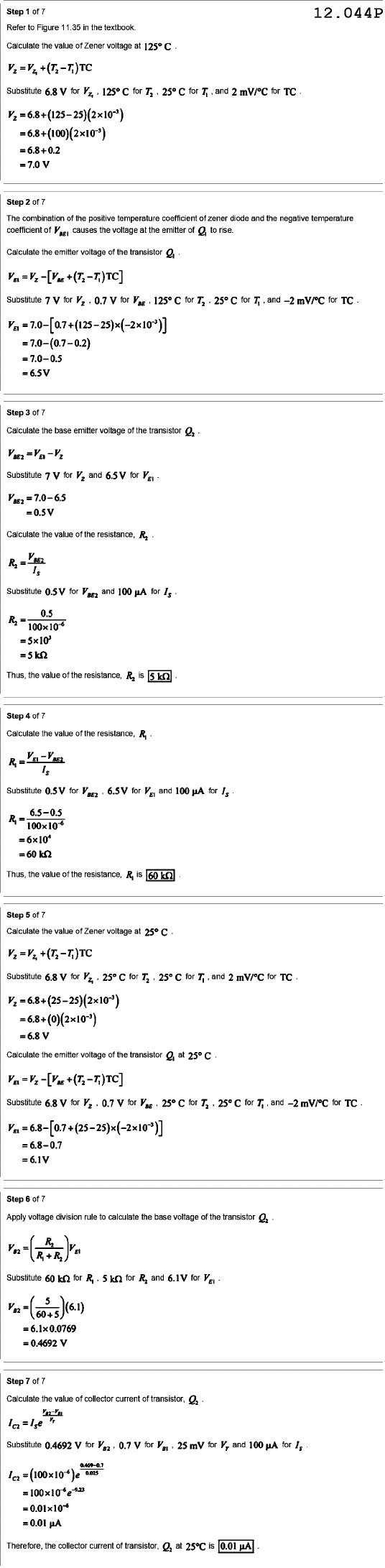 Step of 7 12.044P Refer to Figure 11.35 in the textbook. Calculate the value of Zener voltage at 125° Substitute 6.8 V for 125° C for 25° C for and 2 for =6.8+0.2 V Step of 7 The combination of the positive temperature coefficient of zener diode and the negative temperature coefficient of causes the voltage at the emitter of to rise. Calculate the emitter voltage of the transistor Substitute 7 V for 0.7 V for 125° C for T2 25° for and for TC =7.0-(0.7-0.2) =7.0-0.5 =6.5V Step of Calculate the base emitter voltage of the transistor Substitute 7 V for and for =0.5V Calculate the value of the resistance, R2 Substitute 0.5V for and 100 for 0.5 R2 Thus, the value of the resistance, R2 is Step of 7 Calculate the value of the resistance, Substitute 0.5V for 6.5V for and 100 for 6.5-0.5 = Thus, the value of the resistance, is 60 Step 7 Calculate the value of Zener voltage at 25° Substitute 6.8 V for 25° C for T2 25° for and 2 mV/°C for Calculate the emitter voltage of the transistor at 25° Substitute 6.8 V for 0.7 V for 25° C for 25° for T, and -2 mV/°C for =6.8-0.7 =6.1V Step of 7 Apply voltage division rule to calculate the base voltage of the transistor Substitute 60 for 5 for R2 and 6.1V for =6.1x0.0769 0.4692 V Step Calculate the value of collector current of transistor, Substitute 0.4692 V for 0.7 V for 25 mV for and 100 for 0.469-0.7 0.025 =0.01 Therefore, the collector current of transistor, at 25°C 0.01