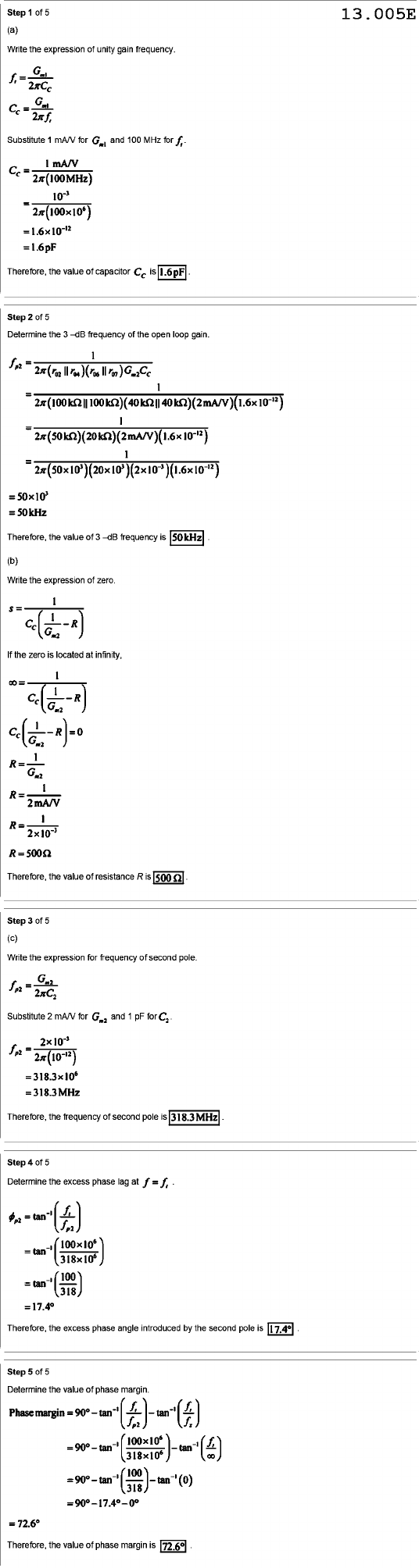 Step of 5 13.005E (a) Write the expression of unity gain frequency. f, Substitute 1 mA/V for and 100 MHz for f, Cc 2π(100MHz) 10⁻³ = =1.6x10⁻¹² =1.6pF Therefore, the value of capacitor Cc is 1.6pF Step of 5 Determine the 3-dB frequency of the open loop gain. 1 1 = I = 1 = = 50kHz Therefore, the value of 3 -dB frequency is 50kHz (b) Write the expression of zero. 1 Cc 1 If the zero is located at infinity, 8 0 1 R R 2mA/V I R Therefore, the value of resistance Ris 500 Ω Step of 5 (c) Write the expression for frequency of second pole. Substitute 2 mA/V for and 1 pF for 2π(10⁻¹²) 2π Therefore, the frequency of second pole 318.3MHz Step of 5 Determine the excess phase lag at f=f, tan = tan 100 = tan 318 =17.4° Therefore, the excess phase angle introduced by the second pole is 7.4° Step of 5 Determine the value of phase margin. Phase margin tan = 90° tan tan = 90° tan tan Therefore, the value of phase margin is 72.6°