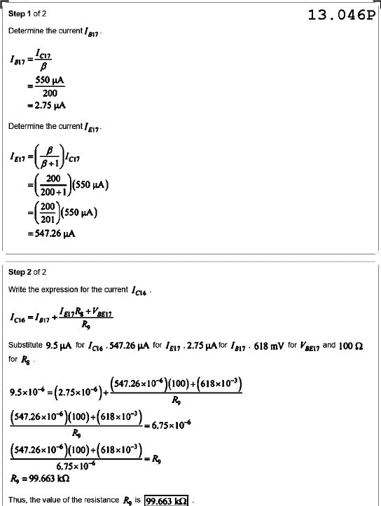 Step 1 of 2 13.046P Determine the current = 550 200 = 2.75 Determine the current 200 = = µA Step 2 of 2 Write the expression for the current Substitute 9.5 µA for 547.26 µA for 2.75 µA for 618 mV for and 100 Ω for R₈ =6.75x10⁻⁶ = 6.75x10⁻⁶ = Thus, the value of the resistance is