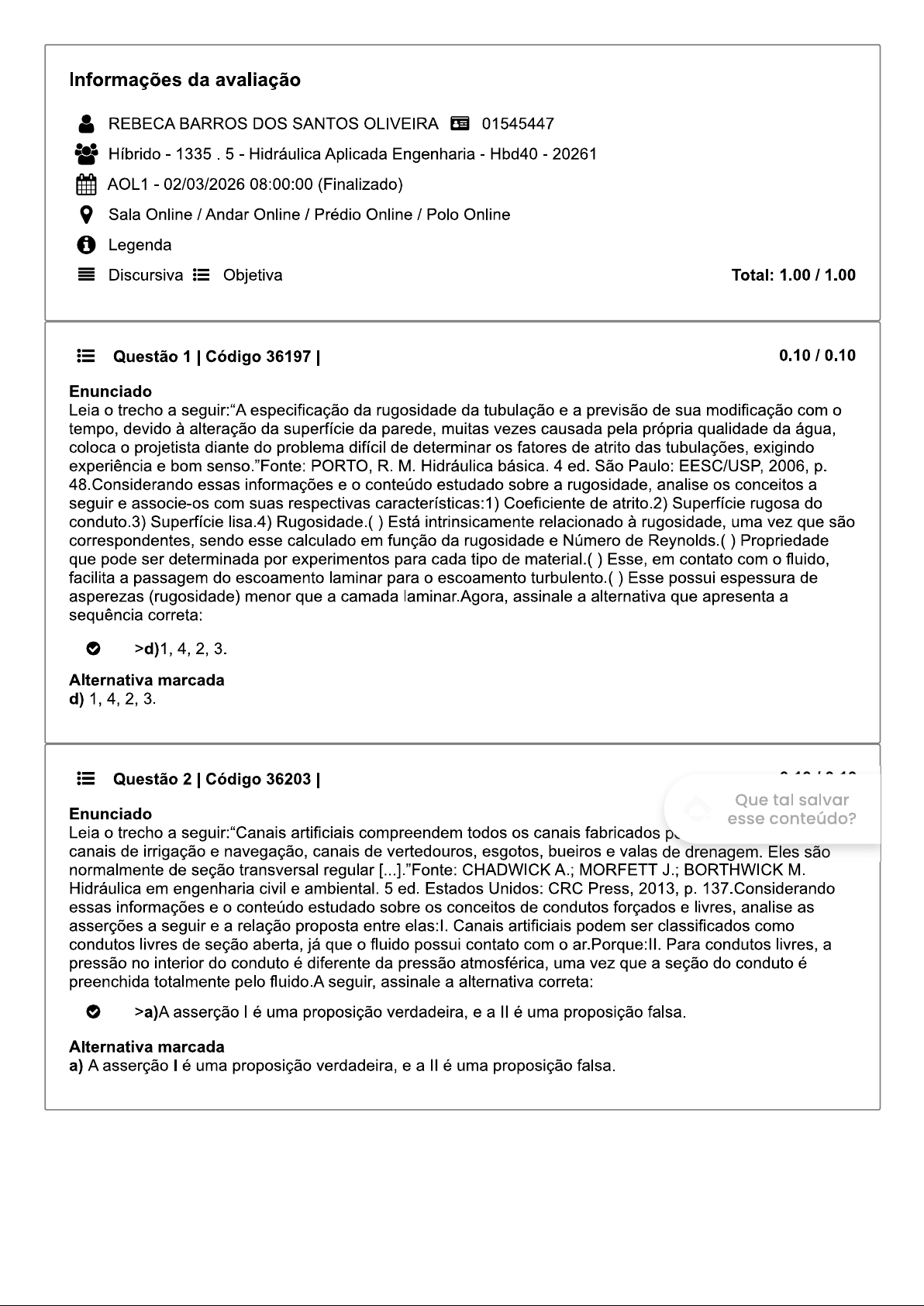 Informações da avaliação REBECA BARROS DOS SANTOS OLIVEIRA 01545447 Híbrido 1335 5 Hidráulica Aplicada Engenharia Hbd40 20261 AOL1 02/03/2026 08:00:00 (Finalizado) Sala Online / Andar Online / Prédio Online / Polo Online i Legenda Discursiva Objetiva Total: 1.00 1.00 Questão 1 Código 36197 0.10 / 0.10 Enunciado Leia o trecho a seguir:"A especificação da rugosidade da tubulação e a previsão de sua modificação com o tempo, devido à alteração da superfície da parede, muitas vezes causada pela própria qualidade da água, coloca projetista diante do problema difícil de determinar os fatores de atrito das tubulações, exigindo experiência e bom senso. "Fonte: PORTO, R. M. Hidráulica básica. 4 ed. São Paulo: EESC/USP, 2006, p. 48. .Considerando essas informações e o conteúdo estudado sobre a rugosidade, analise os conceitos a seguir e associe-os com suas respectivas características:1) Coeficiente de atrito.2) Superfície rugosa do conduto.3) Superfície lisa.4) Está intrinsicamente relacionado à rugosidade, uma vez que são correspondentes, sendo esse calculado em função da rugosidade e Número de Propriedade que pode ser determinada por experimentos para cada tipo de Esse, em contato com o fluido, facilita a passagem do escoamento laminar para o escoamento turbulento.() Esse possui espessura de asperezas (rugosidade) menor que a camada laminar.Agora, assinale a alternativa que apresenta a sequência correta: >d)1,4,2,3. Alternativa marcada d) 1, 4, 2, 3. Questão 2 Código 36203 Que tal salvar Enunciado esse conteúdo? Leia o trecho a artificiais compreendem todos os canais fabricados canais de irrigação e navegação, canais de vertedouros, esgotos, bueiros e valas de drenagem. Eles são normalmente de seção transversal regular [...]."Fonte: CHADWICK A.; MORFETT J.; BORTHWICK Hidráulica em engenharia civil e ambiental. 5 ed. Estados Unidos: CRC Press, 2013, 137.Considerando essas informações e conteúdo estudado sobre os conceitos de condutos forçados e livres, analise as asserções a seguir e a relação proposta entre elas:l. Canais artificiais podem ser classificados como condutos livres de seção aberta, já que o fluido possui contato com o Para condutos livres, a pressão no interior do conduto é diferente da pressão atmosférica, uma vez que a seção do conduto é preenchida totalmente pelo fluido.A seguir, assinale a alternativa correta: >a)A asserção é uma proposição verdadeira, e a é uma proposição falsa. Alternativa marcada a) A asserção I é uma proposição verdadeira, e a é uma proposição falsa.Questão 3 Código 36202 0.10 0.10 Enunciado Leia o trecho a seguir:"A viscosidade e atrito externos são os principais responsáveis pela diferença de energia no escoamento, em consequência das forças de atrito, escoamento somente ocorre com uma perda de energia: a perda de carga. "Fonte: NETTO. Manual de hidráulica. 9. ed. São Paulo: Blucher, 2015, .Considerando essas informações e o conteúdo estudado sobre perda de carga, analise as asserções a seguir e a relação proposta entre elas:l. Em sistemas hidráulicos, a consideração da perda de carga torna dimensionamento diferente do que ocorre na realidade, ou seja, torna dimensionamento impreciso. A perda de carga ocorre devido ao contato do fluido com uma superfície, por exemplo, a água em escoamento no interior e uma tubulação que interage com a superfície desse conduto.A seguir, assinale a alternativa correta: >d)A asserção I é uma proposição falsa, e a é uma proposição verdadeira. Alternativa marcada d) A asserção é uma proposição falsa, e a é uma proposição verdadeira. Questão 4 Código 36191 0.10 0.10 Enunciado Leia o trecho a seguir:"A hidráulica é uma ciência muito antiga. Os egípcios e babilônios construíram canais, ambos para irrigação e para fins defensivos. Nenhuma tentativa foi feita naquele momento para entender as leis do movimento fluido. As primeiras tentativas notáveis de racionalizar a natureza da pressão e padrões de fluxo foram realizados pelos gregos [...]."Fonte: CHADWICK A.; MORFETT J.; BORTHWICK M. Hidráulica em engenharia civil e ambiental. 5. ed. Estados Unidos: CRC Press, 2013, p. 11.0 conhecimento sobre fluidos vem sendo desenvolvido ao longo da história, dessa forma, atualmente são aplicados diversos conceitos hidráulicos. Considerando essas informações e conteúdo estudado, analise os conceitos a seguir e associe-os com suas respectivas características:1) Equação da continuidade.2) Raio hidráulico.3) Fórmula de Chezy.4) Propriedade relevante de condutos que relaciona o volume e o tempo, assim como área e velocidade.( É uma expressão que relaciona as dimensões de um conduto de seção não circular para solucionar questões de engenharia.() É uma condição específica para o escoamento permanente. Nessa condição, é considera uma vazão constante ao longo do Associada à expressão de Manning-Strickler, é empregada para o cálculo da vazão em condutos livres.Agora, assinale a alternativa que apresenta a sequência correta: >d)4,2,1,3. Alternativa marcada Que tal salvar esse conteúdo? d) 4, 2, 1, 3.Questão 5 Código 36196 0.10 0.10 Enunciado Leia o trecho a seguir:"A equação da continuidade é decorrente da lei de conservação de massa. Esta lei da física estabelece que a massa não pode ser criada ou destruída (massa que entra no tubo = massa que sai do tubo). Considerando que a hidráulica trata, praticamente, da condução de água, fluido este, praticamente incompressível, cuja massa específica pode ser considerada constante. "Fonte: BAPTISTA, M.; LARA, Fundamentos da engenharia hidráulica. 4. ed. Belo Horizonte: UFMG, 2016, 48.A empresa de engenharia Hydro foi contratada para expandir comprimento de uma tubulação já construída. Para tal, é necessário calcular a velocidade do novo Trecho B.O Trecho A, construído, possui as mesmas características do novo Trecho B,