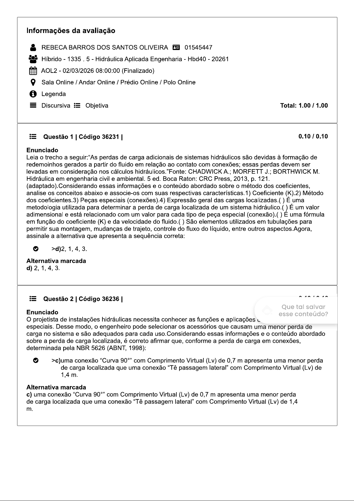 Informações da avaliação REBECA BARROS DOS SANTOS OLIVEIRA 01545447 Híbrido 1335 5 Hidráulica Aplicada Engenharia Hbd40 20261 AOL2 02/03/2026 08:00:00 (Finalizado) Sala Online / Andar Online / Prédio Online / Polo Online i Legenda Discursiva Objetiva Total: 1.00 1.00 Questão 1 Código 36231 0.10 0.10 Enunciado Leia o trecho a seguir:"As perdas de carga adicionais de sistemas hidráulicos são devidas à formação de redemoinhos gerados a partir do fluido em relação ao contato com conexões; essas perdas devem ser levadas em consideração nos cálculos hidráulicos. "Fonte: CHADWICK A.; MORFETT J.; BORTHWICK M. Hidráulica em engenharia civil e ambiental. 5 ed. Raton: CRC Press, 2013, p. 121. (adaptado). Considerando essas informações e conteúdo abordado sobre o método dos coeficientes, analise os conceitos abaixo e associe-os com suas respectivas características.1) Coeficiente (K).2) Método dos coeficientes.3) Peças especiais (conexões).4) Expressão geral das cargas É uma metodologia utilizada para determinar a perda de carga localizada de um sistema hidráulico.( É um valor adimensional e está relacionado com um valor para cada tipo de peça especial (conexão).( É uma fórmula em função do coeficiente (K) e da velocidade do São elementos utilizados em tubulações para permitir sua montagem, mudanças de trajeto, controle do fluxo do líquido, entre outros aspectos. Agora, assinale a alternativa que apresenta a sequência correta: >d)2,1,4,3. Alternativa marcada d) 2, 1, 4, 3. Questão 2 Código 36236 Que tal salvar Enunciado esse conteúdo? projetista de instalações hidráulicas necessita conhecer as funções e aplicações especiais. Desse modo, o engenheiro pode selecionar os acessórios que causam uma menor perda de carga no sistema e são adequados para cada uso.Considerando essas informações e o conteúdo abordado sobre a perda de carga localizada, é correto afirmar que, conforme a perda de carga em conexões, determinada pela NBR 5626 (ABNT, 1998): >c)uma conexão "Curva com Comprimento Virtual (Lv) de 0,7 m apresenta uma menor perda de carga localizada que uma conexão "Tê passagem lateral" com Comprimento Virtual (Lv) de 1,4 m. Alternativa marcada c) uma conexão "Curva com Comprimento Virtual (Lv) de 0,7 m apresenta uma menor perda de carga localizada que uma conexão "Tê passagem lateral" com Comprimento Virtual (Lv) de 1,4 m.Questão 3 Código 36247 0.10 0.10 Enunciado Leia o trecho a seguir:"Considere-se escoamento de um fluido real, incompressível, em regime permanente, através de uma tubulação circular de diâmetro constante e área As forças que atuam sobre fluido são: forças de pressão, gravidade e cisalhamento devido ao atrito com a parede da tubulação. "Fonte: PORTO, R. Hidráulica básica. 4 ed. São Paulo: EESC/USP, 2006, p. Considerando essas informações e o conteúdo abordado equação da energia, analise as afirmativas a seguir e assinale V para a(s) verdadeira(s) e F para a(s) A equação da energia para um fluido ideal (fluido perfeito) impõe que o fluido é incompressível e não possui A consideração de um fluido ideal (fluido perfeito) é uma abstração para simplificar a equação da energia.III. A equação da energia resulta na energia total de um sistema hidráulico, assim como pode ser a diferença de energia total entre duas seções diferentes do mesmo tubo.IV. Os fluidos observados na realidade, como a água, são os fluidos ideais (fluidos perfeitos). Agora, assinale a alternativa que apresenta a sequência correta: >b)V,V,V,F. Alternativa marcada b) V, V, V, F. Questão 4 Código 36233 0.10 0.10 Enunciado Leia o trecho a seguir:"Para o cálculo da perda de carga localizada utiliza-se, além da expressão geral, outro processo denominado Método dos Comprimentos Virtuais. Este processo consiste, para efeito de cálculo somente, na substituição das singularidades presentes [...]."Fonte: BAPTISTA, M.; LARA, M. Fundamentos da engenharia hidráulica. 4. ed. Belo Horizonte: UFMG, 2016, p. Considerando essas informações e o conteúdo abordado sobre os conceitos de método dos comprimentos virtuais, é correto afirmar que os comprimentos virtuais: >d)são comprimentos fictícios, correspondentes à perda de carga localizada que ocorrem em peças especiais (conexões). Alternativa marcada d) são comprimentos fictícios, correspondentes à perda de carga localizada que ocorrem em peças especiais (conexões). Que tal salvar esse conteúdo? Questão 5 Código 36243 Enunciado As instalações hidráulicas possuem grande importância em uma edificação, uma vez que é indispensável a sua aplicação e bom funcionamento para que sejam atendidas as condições mínimas de habitabilidade, higiene e conforto do usuário. Considerando essas informações e conteúdo abordado sobre os conceitos de condutos forçados e livres, analise as asserções a seguir e a relação proposta entre elas.l. No método dos comprimentos virtuais, é preciso consultar na norma NBR 5626 tabelas de referência que relacionam a perda de carga da peça especial com o comprimento virtual. A perda de carga unitária multiplicada pelo comprimento virtual da tubulação resulta na perda de carga localizada do sistema.Agora, assinale a alternativa correta: >d)As asserções I e são proposições verdadeiras, e a é uma justificativa correta da I. Alternativa marcada d) As asserções e II são proposições verdadeiras, e a II é uma justificativa correta da I.Questão 6 Código 36244 0.10 0.10 Enunciado Leia o trecho a seguir:"A fórmula empírica consagrada pelo uso é a fórmula de Hazen-Williams (ou Williams- Hazen) que, pela tradição de bons resultados e simplicidade de uso via tabelas, há de permanecer em uso por muito tempo no meio dos engenheiros. "Fonte: NETTO. Manual de hidráulica. 9. ed. São Paulo: Blucher, 2015, 141. Considerando essas informações e o conteúdo abordado sobre a perda de carga, é correto afirmar q