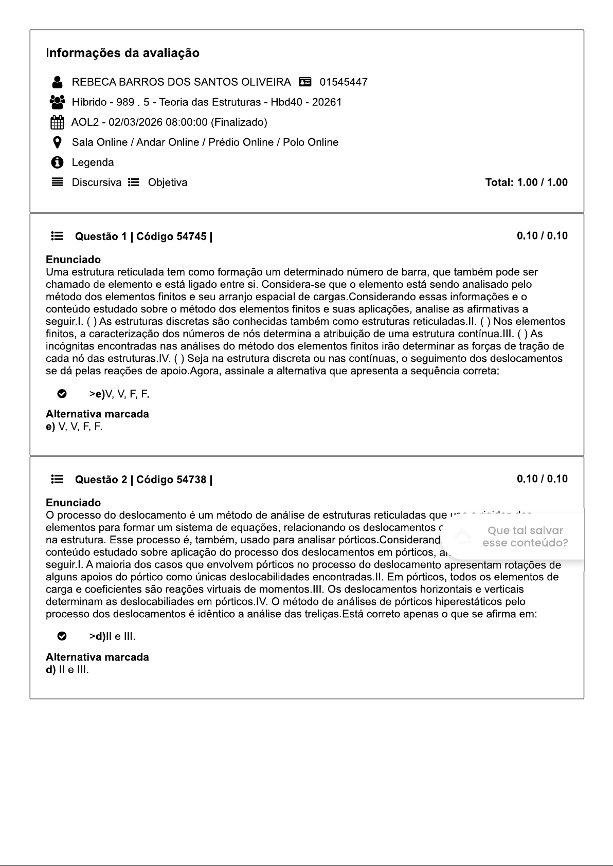 Informações da avaliação REBECA BARROS DOS SANTOS OLIVEIRA 01545447 Híbrido 989 5 Teoria das Estruturas Hbd40 20261 AOL2 02/03/2026 08:00:00 (Finalizado) Sala Online / Andar Online / Prédio Online / Polo Online i Legenda Discursiva Objetiva Total: 1.00 1.00 Questão 1 Código 54745 0.10 0.10 Enunciado Uma estrutura reticulada tem como formação um determinado número de barra, que também pode ser chamado de elemento e está ligado entre si. Considera-se que elemento está sendo analisado pelo método dos elementos finitos e seu arranjo espacial de cargas. Considerando essas informações e o conteúdo estudado sobre o método dos elementos finitos e suas aplicações, analise as afirmativas a seguir.l. As estruturas discretas são conhecidas também como estruturas reticuladas.II. Nos elementos finitos, a caracterização dos números de nós determina a atribuição de uma estrutura As incógnitas encontradas nas análises do método dos elementos finitos irão determinar as forças de tração de cada nó das Seja na estrutura discreta ou nas contínuas, o seguimento dos deslocamentos se dá pelas reações de apoio.Agora, assinale a alternativa que apresenta a sequência correta: Alternativa marcada Questão 2 Código 54738 0.10 0.10 Enunciado processo do deslocamento é um método de análise de estruturas reticuladas que elementos para formar um sistema de equações, relacionando os deslocamentos Que tal salvar na estrutura. Esse processo é, também, usado para analisar pórticos. Considerand esse conteúdo? conteúdo estudado sobre aplicação do processo dos deslocamentos em pórticos, a seguir.l. A maioria dos casos que envolvem pórticos no processo do deslocamento apresentam rotações de alguns apoios do pórtico como únicas deslocabilidades encontradas.II. Em pórticos, todos os elementos de carga e coeficientes são reações virtuais de momentos.III. Os deslocamentos horizontais e verticais determinam as deslocabiliades em pórticos.IV. método de análises de pórticos hiperestáticos pelo processo dos deslocamentos é idêntico a análise das treliças. Está correto apenas o que se afirma em: >d)II e III. Alternativa marcada d) e III.Questão 3 Código 54752 0.10 0.10 Enunciado elemento isoparamétrico Q4 apresenta quatro nós dispostos nas arestas dessa estrutura. Tal elemento determina campo quadrado ou retangular de interpolaridade linear, ou seja, os valores médios que são dados para os nós têm que apresentar posições já solicitadas dentro do elemento, dadas pelas funções interpolares de primeiro grau.Considerando essas informações e conteúdo estudo do método dos elementos finitos em aplicações em estruturas formadas por elementos bidimensionais, os valores dados para os nós nos elementos isoparamétricos Q4 determinam: >a)tensão, deslocamento e deformação. Alternativa marcada a) tensão, deslocamento e deformação. Questão 4 Código 54747 0.10 0.10 Enunciado estudo dos elementos finitos é um método numérico usado em computadores, para solucionar problemas de engenharia. As funções são montadas por interpolação para diminuir o comportamento de um campo infinito de pontos para um número finito de pontos. Considerando essas informações e o conteúdo estudado sobre o método dos elementos finitos e suas aplicações, a principal diferença entre método dos elementos finitos e os processos tradicionais utilizados na teoria das estruturas se dá: >a)pelo cálculo da matriz de rigidez, o vetor solicitante e os esforços e tensões dos elementos. Alternativa marcada a) pelo cálculo da matriz de rigidez, o vetor solicitante e os esforços e tensões dos elementos. Questão 5 Código 54742 0.10 0.10 Enunciado método que determina o estado de tensão e deformação de um sólido e geometria aleatório se chama método dos elementos finitos. Este método determina estado de tensão e deformação pelas ações externas. Essa análise é determinada através das estruturas de edifícios, pontes, etc.Considerando essas informações e o conteúdo estudado sobre conceitos básic Que tal salvar elementos finitos, analise as afirmativas a Quando se quer analisar um esse conteúdo? necessário fazer várias análises e mudanças em suas tensão, equilibro, relações entre deformação e tensão, etc., são termos comuns, associados as analises das estruturas reticuladas.III. A resolução do método dos elementos finitos se dá através do processo dos esforços.IV. Antes da utilização do método dos elementos finitos, os cálculos das estruturas eram realizados por meio de um sistema de equações de integrais parciais.Agora, assinale a alternativa que apresenta a sequência correta: >b)V, V, F, F. Alternativa marcada b) V, V, F, F.Questão 6 Código 54749 0.10 0.10 Enunciado comportamento mecânico de uma estrutura pode ser analisado pelo método dos elementos finitos e, para isso, é necessário escolher de forma correta a extensão dos deslocamentos que vão ser utilizados para classificar qual o tipode elemento finito precisa ser usado para melhorar as análises dos deslocamentos. Considerando essas informações e o conteúdo estudado sobre método dos elementos finitos e sua aplicação em estruturas formadas por elementos bidimensionais e tridimensionais, analise as afirmativas a Os elementos do tipo casca apresentam de três a nove graus de liberdade em cada nó.ll. Os elementos bidimensionais apresentam quatro graus de liberdade em cada Os elementos não planos apresentam de três graus de liberdade em cada nó.IV. Os elementos tridimensionais apresentem cinco a dez nós de graus de liberdade em cada nó.Está correto apenas que se afirma em: e III. Alternativa marcada a) e III. Questão 7 Código 54736 0.10 0.10 Enunciado Analisando uma estrutura por meio do processo dos deslocamentos, é preciso observar mais detalhadamente seu uso no caso de vigas hiperestáticas. Mas, para o uso desse processo, é preciso estabelecer os v