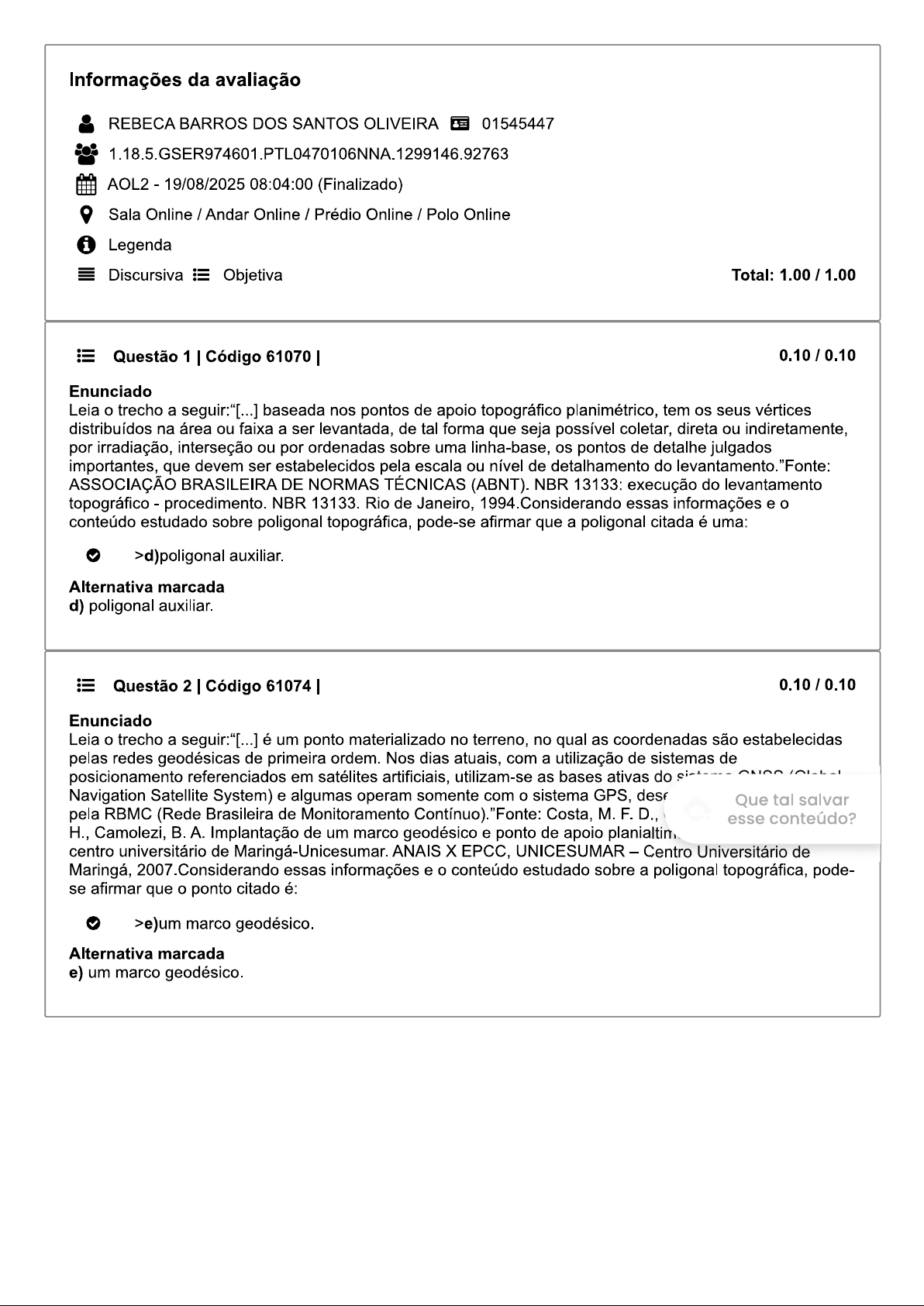 Informações da avaliação REBECA BARROS DOS SANTOS OLIVEIRA 01545447 1.18.5.GSER974601.PTL0470106NNA.1299146.92763 AOL2 19/08/2025 08:04:00 (Finalizado) Sala Online / Andar Online / Prédio Online / Polo Online i Legenda Discursiva Objetiva Total: Questão 1 Código 61070 0.10 0.10 Enunciado Leia o trecho a seguir:"[...] baseada nos pontos de apoio topográfico planimétrico, tem os seus vértices distribuídos na área ou faixa a ser levantada, de tal forma que seja possível coletar, direta ou indiretamente, por irradiação, interseção ou por ordenadas sobre uma linha-base, os pontos de detalhe julgados importantes, que devem ser estabelecidos pela escala ou nível de detalhamento do levantamento. "Fonte: ASSOCIAÇÃO BRASILEIRA DE NORMAS TÉCNICAS (ABNT). NBR 13133: execução do levantamento topográfico procedimento. NBR 13133. Rio de Janeiro, 1994. Considerando essas informações e o conteúdo estudado sobre poligonal topográfica, pode-se afirmar que a poligonal citada é uma: >d)poligonal auxiliar. Alternativa marcada d) poligonal auxiliar. Questão 2 Código 61074 0.10 0.10 Enunciado Leia o trecho a seguir:"[...] é um ponto materializado no terreno, no qual as coordenadas são estabelecidas pelas redes geodésicas de primeira ordem. Nos dias atuais, com a utilização de sistemas de posicionamento referenciados em satélites artificiais, utilizam-se as bases ativas do Navigation Satellite System) e algumas operam somente com o sistema GPS, Que tal salvar pela RBMC (Rede Brasileira de Monitoramento Contínuo). "Fonte: Costa, M.F.D., esse conteúdo? H., Camolezi, Implantação de um marco geodésico e ponto de apoio centro universitário de Maringá-Unicesumar. ANAIS X UNICESUMAR Centro Universitário de Maringá, Considerando essas informações e conteúdo estudado sobre a poligonal topográfica, pode- se afirmar que ponto citado é: >e)um marco geodésico. Alternativa marcada e) um marco geodésico.Questão 3 Código 61073 0.10 0.10 Enunciado Uma poligonal topográfica consiste em uma série de linhas retas de comprimento conhecido, relacionadas umas às outras por ângulos conhecidos entre as linhas. Os pontos que definem as extremidades das linhas das poligonais são chamados de estações ou vértices. Considerando essas informações e conteúdo estudado sobre a poligonal topográfica, analise as asserções a seguir e a relação proposta entre elas.l. Para estabelecer pontos de controle, uma poligonal fechada é preferível. Fornece diferentes possibilidades de verificações para ângulos internos, ângulos de deflexão e ângulos de orientação.A seguir, assinale a alternativa correta: >b)As asserções e são proposições verdadeiras, e a é uma justificativa correta da I. Alternativa marcada b) As asserções I e são proposições verdadeiras, e a é uma justificativa correta da I. Questão 4 Código 61084 0.10 0.10 Enunciado Existem diversas formas de classificar os métodos de nivelamento topográfico, agrupando-os pelos equipamentos utilizados, pela presença de movimentação vertical da luneta do instrumento topográfico ou, ainda, pelo tempo de operação em campo e os níveis de precisão obtidos. Considerando essas informações e o conteúdo estudado em método de nivelamento trigonométrico, analise as asserções a seguir e a relação proposta entre elas:l. nivelamento utilizando equipamentos topográficos, como teodolito e estação total, pode ser caracterizado como nivelamento geométrico simples. Através da medição dos ângulos verticais e das distâncias, será possível calcular a variação altimétrica do terreno.A seguir, assinale a alternativa correta. >c)A asserção é uma proposição falsa, e a é uma proposição verdadeira. Alternativa marcada c) A asserção é uma proposição falsa, e a é uma proposição verdadeira. Questão 5 Código 61077 0.10 0.10 Enunciado Que tal salvar A topografia é uma ciência baseada em princípios matemáticos e que utiliza inform esse conteúdo? finalidade de representar, em projeção ortogonal sobre um plano de referência, os apresentar o perfil, as dimensões verticais e acidentes naturais e artificiais de uma porçao limitada do terreno. Considerando essas informações e conteúdo estudado sobre histórico e importância da altimetria, assinale a alternativa que correspondente aos princípios apresentados: Levantamento altimétrico. Alternativa marcada a) Levantamento altimétrico.Questão 6 Código 61071 0.10 0.10 Enunciado Leia o trecho a seguir:"[...] é um conjunto de alinhamentos consecutivos constituídos de ângulos e distâncias, em que os pontos de partida e de chegada têm suas coordenadas conhecidas, permitindo determinar os erros de fechamento, tanto lineares quanto angulares. "Fonte: VENANCIO, K. K.; GIRELI, T. Z.; GARCIA, P.D. Evolução da linha de costa na região da Ponta da Praia em Santos-SP. In: XXII SIMPÓSIO BRASILEIRO DE RECURSOS HÍDRICOS, 2017, Florianópolis, Santa Catarina. ABRH Brasil. Florianópolis, 2017. Considerando essas informações e conteúdo estudado sobre poligonal topográfica, pode-se afirmar que a poligonal citada é uma: >c)poligonal apoiada. Alternativa marcada c) poligonal apoiada. Questão 7 Código 61080 0.10 0.10 Enunciado Sabe-se que, pela curva de nível, é possível interpretar a distância vertical (dh) de uma área sobre um plano horizontal (dH) por meio das isolinhas. Diante disso, tem-se um terreno em que as curvas de nível se encontram representadas de 30 em 30 metros, e que a distância entre 5 curvas, medida na horizontal, é de 500 metros. Considere a seguinte fórmula: Declividade d(%) = dh/dH x100Considerando essas informações e o conteúdo estudado sobre métodos de nivelamento, assinale a alternativa que apresenta o valor correspondente à declividade desse terreno. >d)30%. Alternativa marcada d) 30%. Questão 8 Código 61076 0.10 / 0.10 Enunciado Um dos grandes desafios que o responsável técnico enfrenta ao realizar m