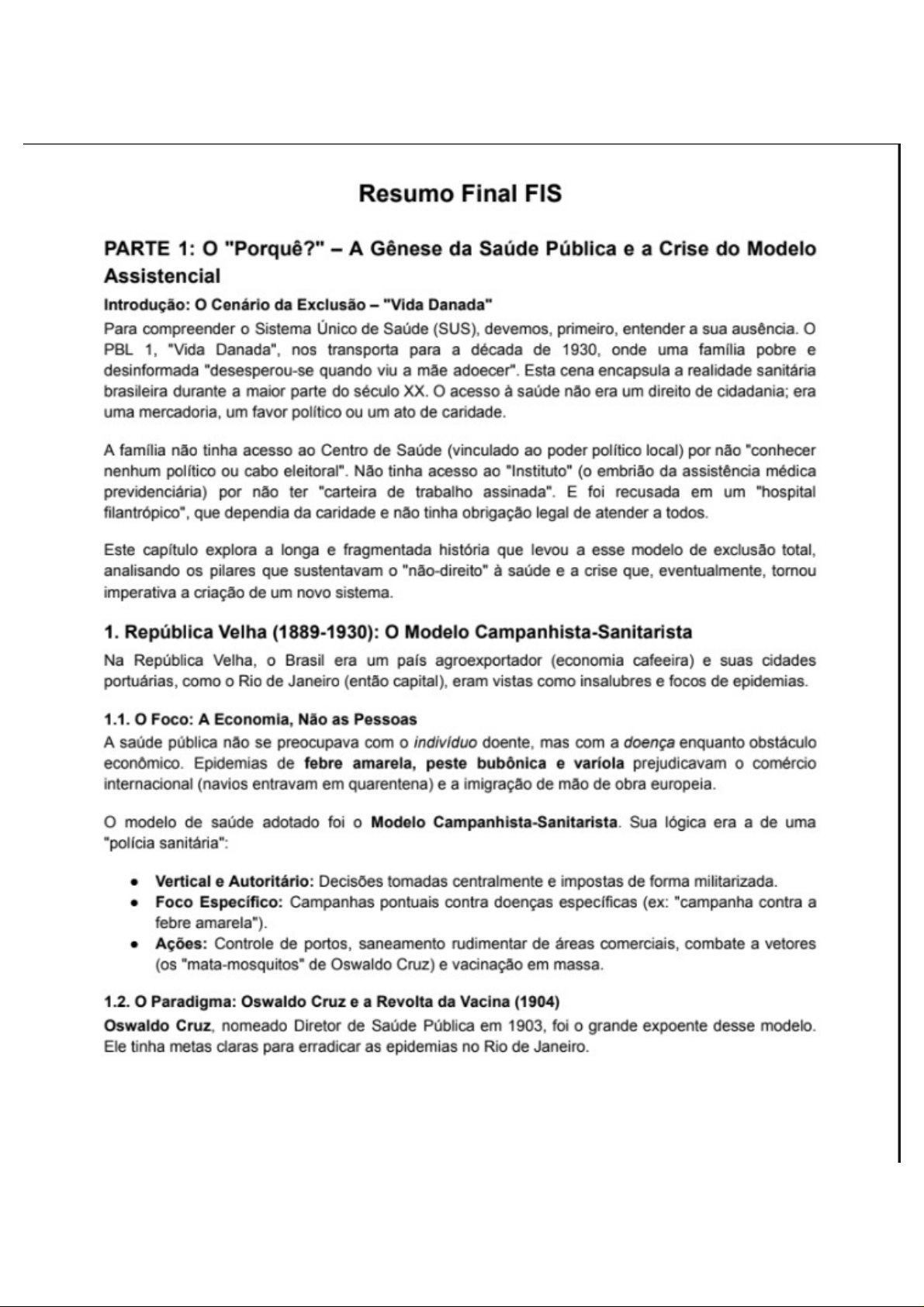 Resumo Final FIS PARTE 1: "Porquê?" A Gênese da Saúde Pública e a Crise do Modelo Assistencial Introdução: Cenário da Exclusão "Vida Danada" Para compreender o Sistema Único de Saúde (SUS), devemos, primeiro, entender a sua ausência. PBL 1, "Vida Danada", nos transporta para a década de 1930, onde uma família pobre e desinformada "desesperou-se quando viu a mãe adoecer". Esta cena encapsula a realidade sanitária brasileira durante a maior parte do século XX. acesso à saúde não era um direito de cidadania; era uma mercadoria, um favor político ou um ato de caridade. A família não tinha acesso ao Centro de Saúde (vinculado ao poder político local) por não "conhecer nenhum político ou cabo eleitoral". Não tinha acesso ao "Instituto" (o embrião da assistência médica previdenciária) por não ter "carteira de trabalho assinada". E foi recusada em um "hospital que dependia da caridade e não tinha obrigação legal de atender a todos. Este capítulo explora a longa e fragmentada história que levou a esse modelo de exclusão total, analisando os pilares que sustentavam o "não-direito" à saúde e a crise que, eventualmente, tornou imperativa a criação de um novo sistema. 1. República Velha (1889-1930): o Modelo Na República Velha, o Brasil era um país agroexportador (economia cafeeira) e suas cidades portuárias, como o Rio de Janeiro (então capital), eram vistas como insalubres e focos de epidemias. 1.1. Foco: A Economia, Não as Pessoas A saúde pública não se preocupava com individuo doente, mas com a doença enquanto obstáculo econômico. Epidemias de febre amarela, peste bubônica e varíola prejudicavam comércio internacional (navios entravam em quarentena) e a imigração de mão de obra europeia. modelo de saúde adotado foi Modelo Sua lógica era a de uma "polícia sanitária": Vertical e Autoritário: Decisões tomadas centralmente e impostas de forma militarizada. Foco Específico: Campanhas pontuais contra doenças específicas (ex: "campanha contra a febre amarela"). Ações: Controle de portos, saneamento rudimentar de áreas comerciais, combate a vetores (os "mata-mosquitos" de Oswaldo Cruz) e vacinação em massa. 1.2. o Paradigma: Oswaldo Cruz e a Revolta da Vacina (1904) Oswaldo nomeado Diretor de Saúde Pública em 1903, foi 0 grande expoente desse modelo. Ele tinha metas claras para erradicar as epidemias no Rio de Janeiro.Sua ação mais notória foi a instituição da vacinação obrigatória contra a variola (Lei 1.261/1904). Isso culminou na Revolta da Vacina (1904). Análise Crítica (Pegadinha de Prova): A revolta não foi um movimento "antivax" no sentido moderno. Ela foi uma explosão popular complexa causada por: 1. Autoritarismo: As brigadas sanitárias, acompanhadas pela polícia, invadiam as casas à força para vacinar. 2. Desinformação: A população não compreendia benefício da vacina, apenas a violência do Estado. 3. Contexto Social: A vacinação foi o estopim de uma insatisfação generalizada com as reformas urbanas de Pereira Passos, que demolia cortiços (higienização social) e expulsava os pobres do centro. 4. Moralidade: A aplicação da vacina (injeção) era vista como uma violação da honra e da privacidade, especialmente das mulheres. 1.3. Acesso ao Cuidado Individual: A Dualidade Neste modelo, o indivíduo doente estava por conta própria. acesso se dividia: 1. Quem Podia Pagar: Medicina liberal (consultórios e hospitais privados). 2. Quem Não Podia Pagar: Caridade. Instituições como as Santas Casas de Misericórdia (Hospitais Filantrópicos) eram o único recurso. Sendo filantrópicas, não tinham obrigação legal universal e podiam recusar atendimento, como fizeram com a mãe no PBL 1. 2. A Gênese da Previdência (1923-1964): 0 Modelo Previdenciário A industrialização incipiente e a urbanização trouxeram novas demandas: os trabalhadores organizados. A saúde começa a ser vista como um benefício atrelado à capacidade produtiva. 2.1. o Marco: Decreto 4.682/1923 (Lei Eloy Chaves) Este é o marco legal do nascimento da Previdência Social no Brasil, ocorrido ainda na República Velha. o quê: Criou as Caixas de Aposentadoria e Pensões (CAPs). Para quem: Inicialmente, apenas para trabalhadores das empresas ferroviárias. Financiamento: Bipartite (contribuição do empregado e do empregador). Gestão: Por empresa. Benefícios: Foco em Aposentadoria e Pensão, mas incluía alguma assistência médica (assistência cirúrgica, farmacêutica). 2.2. A Era Vargas e a Expansão: Os IAPs Getúlio Vargas, a partir de 1930, centraliza poder e expande modelo previdenciário, substituindo as CAPs (por empresa) pelos Institutos de Aposentadoria e Pensões (IAPs) (por categoria profissional). Exemplos: IAPM IAPC (Comerciários), IAPI (Industriários).Financiamento: Torna-se Tripartite (contribuição do Empregado, do Empregador e do Estado). Mudança de Foco: Os IAPs começam a investir fortemente na assistência médica para manter a força de trabalho ativa. Eles constroem hospitais próprios e começam a contratar serviços privados. Respondendo ao PBL 1: Nos anos 30, o cenário era este: Ministério da Saúde (criado em 1930): Fraco, focado em ações campanhistas e preventivas, muitas vezes usado como ferramenta política (o "cabo eleitoral" para Centro de Saúde). IAPs: Em expansão, focados no cuidado médico-curativo, mas exclusivos para quem tinha carteira assinada naquela categoria. A família do PBL estava no limbo: Ministério da Saúde não cuidava de doentes individuais, e os IAPs não os aceitavam por não serem trabalhadores formais. 3. Regime Militar (1964-1985): Unificação, Auge e Crise do INAMPS regime militar modernizou a gestão da previdência, centralizando-a e expandindo o modelo assistencial, que, paradoxalmente, levou à sua falência. 3.1. A Unificação: INPS (1966) Em 1966, o governo unifica todos os IAPs no Instituto Nacional da Previdência Social (INPS). Isso central