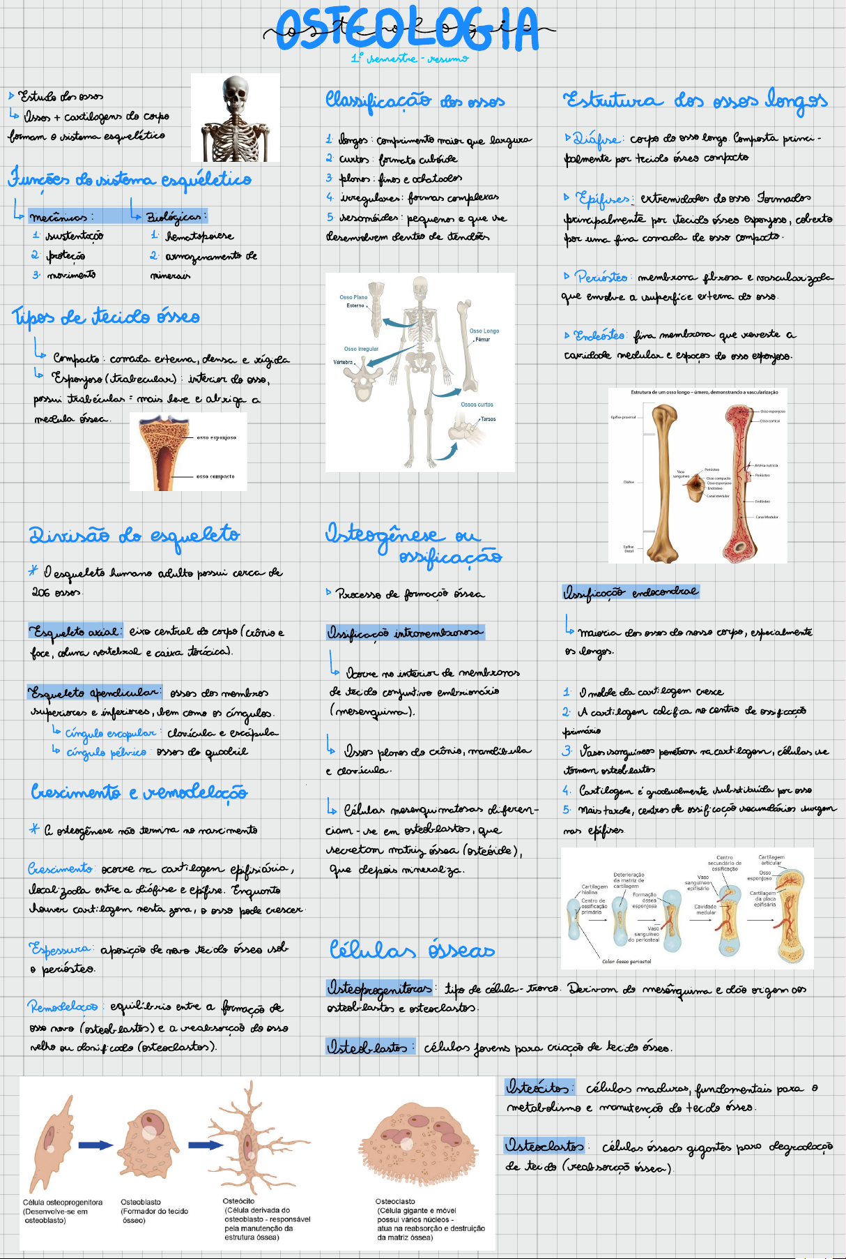 O E O L O G r 1 º s e m e s t r e - r e s u m o Δ E s t u d o d o s o s s o s O s s o s + c a r t i l a g e n s d o c o r p o f o r m a m o s i s t e m a e s q u e l é t i c o F u n ç õ e s d o s i s t e m a e s q u e l é t i c o m e c â n i c a s : B i o l ó g i c a s : 1 . s u s t e n t a ç ã o 1 h e m a t o p o i e s e 2 . p r o t e ç ã o 2 . a r m a z e n a m e n t o d e 3 . m o v i m e n t o m i n e r a i s T i p o s d e t e c i d o ó s s e o C o m p a c t o : c a m a d a e x t e r n a , d e n s a e r í g i d a ↳ E s p o n j o s o ( t r a b e c u l a r ) : i n t e r i o r d o o s s o , p o s s u i t r a b é c u l a s = m a i s l e v e e a b r i g a a m e d u l a ó s s e a . C l a s s i f i c a ç ã o d o s o s s o s 1 . l o n g o s : c o m p r i m e n t o m a i o r q u e l a r g u r a 2 . c u r t o s : f o r m a t o c u b ó i d e 3 . p l a n o s : f i n o s e a c h a t a d o s 4 . i r r e g u l a r e s : f o r m a s c o m p l e x a s 5 . s e s a m ó i d e s : p e q u e n o s e q u e s e d e s e n v o l v e m d e n t r o d e t e n d õ e s E s t r u t u r a d o s o s s o s l o n g o s ☐ D i á f i s e : c o r p o d o o s s o l o n g o . C o m p o s t a p r i n c i p a l m e n t e p o r t e c i d o ó s s e o c o m p a c t o Δ E p í f i s e s : e x t r e m i d a d e s d o o s s o . F o r m a d o s p r i n c i p a l m e n t e p o r t e c i d o ó s s e o e s p o n j o s o , c o b e r t o p o r u m a f i n a c a m a d a d e o s s o c o m p a c t o . P e r i ó s t e o : m e m b r a n a f i b r o s a e v a s c u l a r i z a d a q u e e n v o l v e a s u p e r f í c i e e x t e r n a d o o s s o . ☐ E n d ó s t e o : f i n a m e m b r a n a q u e r e v e s t e a c a v i d a d e m e d u l a r e e s p a ç o s d o o s s o e s p o n j o s o . D i v i s ã o d o e s q u e l e t o * O e s q u e l e t o h u m a n o a d u l t o p o s s u i c e r c a d e 2 0 6 o s s o s . E s q u e l e t o a x i a l : e i x o c e n t r a l d o c o r p o / c r â n i o e f a c e , c o l u n a v e r t e b r a l e c a i x a t o r á c i c a . E s q u e l e t o a p e n d i c u l a r : o s s o s d o s m e m b r o s s u p e r i o r e s e i n f e r i o r e s , b e m c o m o o s â n g u l o s . ↳ c í n g u l o e s c o p u l a r : c l a v í c u l a e e s c á p u l a ↳ c í n g u l o p é l v i c o : o s s o s d o q u a d r i l O s t e o g ê n e s e o u o s s i f i c a ç ã o Δ P r o c e s s o d e f o r m a ç ã o ó s s e a O s s i f i c a ç ã o i n t r o m e m b r a n o s a O c o r r e n o i n t e r i o r d e m e m b r a n a s d e t e c i d o c o n j u n t i v o e m b r i o n á r i o ( m e s e n q u i m a ) . O s s o s p l a n o s d o c r â n i o , m a n d í b u l a e c l a v í c u l a . ↳ C é l u l a s m e s e n q u i m a t o s a s d i f e r e m - c i a m - s e e m o s t e o b l a s t o s , q u e s e c r e t a m m a t r i z ó s s e a ( o s t e ó i d e ) , q u e d e p o i s m i n e r a l i z a . O s s i f i c a ç ã o e n d o c o n d r a l m a i o r i a d o s o s s o s d o n o s s o c o r p o , e s p e c i a l m e n t e o s l o n g o s . 1 . O m o l d e d a c a r t i l a g e m c r e s c e 2 . A c a r t i l a g e m c o l i f i c a n o c e n t r o d e o s s i f i c a ç ã o p r i m á r i o 3 . V a s o s s a n g u í n e o s p e n e t r a m n a c a r t i l a g e m , c é l u l a s s e t o r n a m o s t e o b l a s t o s 4 . C a r t i l a g e m é g r a d u a l m e n t e s u b s t i t u í d a p o r o s s o 5 . M a i s t a r d e , c e n t r o s d e o s s i f i c a ç ã o s e c u n d á r i o s s u r g e m n a s e p í f i s e s . C r e s c i m e n t o e r e m o d e l a ç ã o * A o s t e o g ê n e s e n ã o t e r m i n a n o n a s c i m e n t o C r e s c i m e n t o : o c o r r e n a c a r t i l a g e m e p i f i s i á r i a , l o c a l i z a d a e n t r e a d i á l i s e e e p í f i s e . E n q u a n t o h o u v e r c a r t i l a g e m n e s t a z o n a , o o s s o p o d e c r e s c e r . E s p e s s u r a : a p o s i ç ã o d e n o v o t e c i d o ó s s e o s o b o p e r i ó s t e o . R e m o d e l a ç ã o : e q u i l í b r i o e n t r e a f o r m a ç ã o d e o s s o n o v o ( o s t e o b l a s t o s ) e a r e a b s o r ç ã o d o o s s o v e l h o o u d a n i f i c a d o ( o s t e o c l a s t o s ) . C é l u l a s ó s s e a s O s t e o p r o g e n i t o r a s : t i p o d e c é l u l a - t r o n c o . D e r i v a m d o m e s ê n q u i m a e d ã o o r i g e m a o s o s t e o b l a s t o s e o s t e o c l a s t o s . O s t e o b l a s t o s : c é l u l a s j o v e n s p a r a c r i a ç ã o d e t e c i d o ó s s e o . O s t e ó c i t o s : c é l u l a s m a d u r a s , f u n d a m e n t a i s p a r a o m e t a b o l i s m o e m a n u t e n ç ã o d o t e c i d o ó s s e o . O s t e o c l a s t o s : c é l u l a s ó s s e a s g i g a n t e s p a r a d e g r a d a ç ã o d e t e c i d o ( r e a b s o r ç ã o ó s s e a ) .