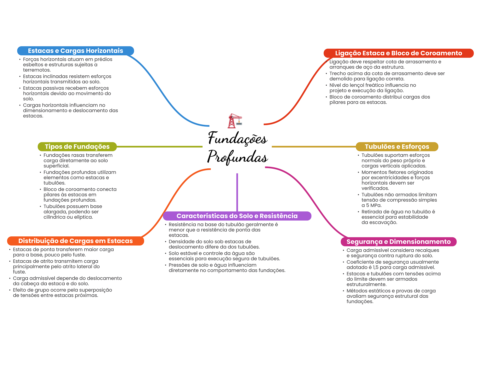 Estacas e Cargas Horizontais Ligação Estaca e Bloco de Coroamento Forças horizontais atuam em prédios Ligação deve respeitar cota de arrasamento e esbeltos e estruturas sujeitas a arranques de aço da estrutura. terremotos. Trecho acima da cota de arrasamento deve ser Estacas inclinadas resistem esforços horizontais transmitidos ao solo. demolido para ligação correta. Nível do lençol freático influencia no Estacas passivas recebem esforços horizontais devido ao movimento do projeto e execução da ligação. solo. Bloco de coroamento distribui cargas dos pilares para as estacas. Cargas horizontais influenciam no dimensionamento e deslocamento das estacas. Fundações Tipos de Fundações Tubulões e Esforços Fundações rasas transferem carga diretamente ao solo Profundas Tubulões suportam esforços normais do peso próprio e superficial. cargas verticais aplicadas. Fundações profundas utilizam Momentos fletores originados elementos como estacas e por excentricidades e forças tubulões. horizontais devem ser Bloco de coroamento conecta verificados. pilares às estacas em Tubulões não armados limitam fundações profundas. tensão de compressão simples Tubulões possuem base a 5 MPa. alargada, podendo ser Retirada de água no tubulão é cilíndrica ou elíptica. Características do Solo e Resistência essencial para estabilidade Resistência na base do tubulão geralmente é da escavação. menor que a resistência de ponta das estacas. Distribuição de Cargas em Estacas Densidade do solo sob estacas de Segurança e Dimensionamento deslocamento difere da dos tubulões. Estacas de ponta transferem maior carga Carga admissível considera recalques para a base, pouco pelo fuste. Solo estável e controle da água são e segurança contra ruptura do solo. Estacas de atrito transmitem carga essenciais para execução segura de tubulões. Coeficiente de segurança usualmente principalmente pelo atrito lateral do Pressões de solo e água influenciam adotado é 1,5 para carga admissível. fuste. diretamente no comportamento das fundações. Estacas e tubulões com tensões acima Carga admissível depende do deslocamento do limite devem ser armados da cabeça da estaca e do solo. estruturalmente. Efeito de grupo ocorre pela superposição Métodos estáticos e provas de carga de tensões entre estacas próximas. avaliam segurança estrutural das fundações.