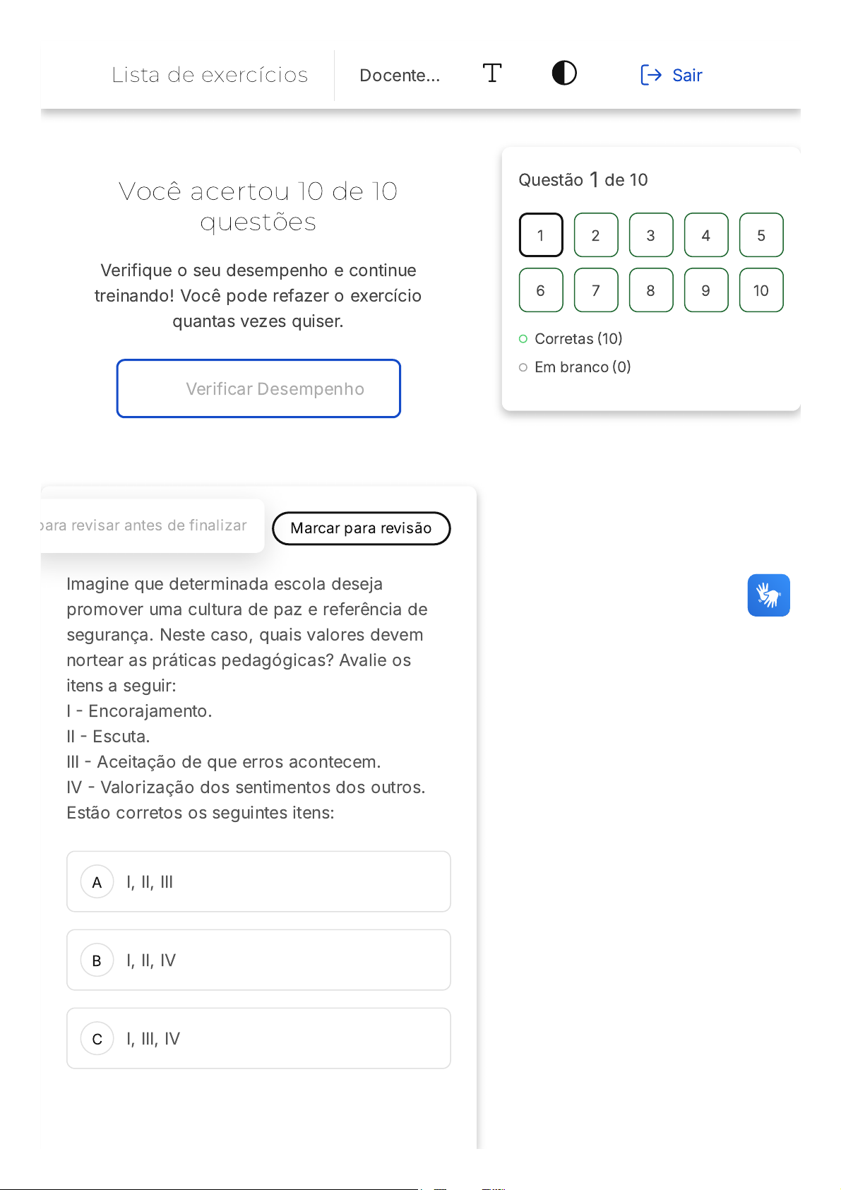 21/03/2026 19:18 https://estacio.saladeavaliacoes.com.br/exercicio/69bf1908d7f597bfea92561c/gabarito/ https://estacio.saladeavaliacoes.com.br/exercicio/69bf1908d7f597bfea92561c/gabarito/ 1/14 Você acertou 10 de 10 questões Verifique o seu desempenho e continue treinando! Você pode refazer o exercício quantas vezes quiser. Verificar Desempenho A B C 1 Marcar para revisãopara revisar antes de finalizar Imagine que determinada escola deseja promover uma cultura de paz e referência de segurança. Neste caso, quais valores devem nortear as práticas pedagógicas? Avalie os itens a seguir: I � Encorajamento. II � Escuta. III � Aceitação de que erros acontecem. IV � Valorização dos sentimentos dos outros. Estão corretos os seguintes itens: I, II, III I, II, IV I, III, IV Questão 1 de 10 Corretas �10� Em branco �0� 1 2 3 4 5 6 7 8 9 10 Lista de exercícios Docente… Sair 21/03/2026 19:18 https://estacio.saladeavaliacoes.com.br/exercicio/69bf1908d7f597bfea92561c/gabarito/ https://estacio.saladeavaliacoes.com.br/exercicio/69bf1908d7f597bfea92561c/gabarito/ 2/14 D E II, III, IV I, II, III, IV Resposta correta Parabéns, você selecionou a alternativa correta. Confira o gabarito comentado! Gabarito Comentado Para promover uma cultura de paz e segurança em um ambiente escolar, é fundamental que as práticas pedagógicas sejam norteadas por valores como encorajamento, escuta, aceitação de erros e valorização dos sentimentos dos outros. O encorajamento ajuda a motivar os alunos a se esforçarem e acreditarem em suas capacidades. A escuta ativa permite que os alunos se sintam ouvidos e compreendidos, promovendo um ambiente de respeito mútuo. A aceitação de que erros acontecem contribui para um ambiente de aprendizado seguro, onde os alunos não têm medo de errar e, portanto, estão mais dispostos a tentar e aprender. Por fim, a valorização dos sentimentos dos outros ajuda a criar um ambiente de empatia e respeito. Portanto, todos os itens �I, II, III, IV) estão corretos, tornando a alternativa E a resposta correta. 2 Marcar para revisão 21/03/2026 19:18 https://estacio.saladeavaliacoes.com.br/exercicio/69bf1908d7f597bfea92561c/gabarito/ https://estacio.saladeavaliacoes.com.br/exercicio/69bf1908d7f597bfea92561c/gabarito/ 3/14 A B C D E O fato de uma escola contar com um(a) psicopedagogo(a) não significa que a função de mediação cabe exclusivamente a ele(a). A prática relacionada à mediação deve ser associada ao(à): Família, exclusivamente. Corpo docente, exclusivamente. Equipe gestora, exclusivamente. Equipe pedagógica, exclusivamente. Comunidade escolar. Resposta correta Parabéns, você selecionou a alternativa correta. Confira o gabarito comentado! Gabarito Comentado A prática de mediação não deve ser uma responsabilidade isolada de um único profissional, como o psicopedagogo. Isso porque o compromisso com a aprendizagem dos estudantes é uma responsabilidade coletiva. Quando se atribui a um único profissional a tarefa de atender às necessidades específicas de um estudante que necessita de mediação, acaba-se por responsabilizar o estudante pela sua própria dificuldade de aprendizagem. Portanto, é fundamental que se mobilizem esforços conjuntos e articulados, tanto dentro quanto fora do 21/03/2026 19:18 https://estacio.saladeavaliacoes.com.br/exercicio/69bf1908d7f597bfea92561c/gabarito/ https://estacio.saladeavaliacoes.com.br/exercicio/69bf1908d7f597bfea92561c/gabarito/ 4/14 A B ambiente escolar, para favorecer os processos de aprendizagem. Essa é a intervenção mais eficaz para garantir que todos os estudantes possam, de fato, exercer plenamente o seu direito à educação. A alternativa correta é a "E", que indica que a prática de mediação deve ser associada à comunidade escolar como um todo, e não a um único profissional ou grupo. 3 Marcar para revisão A mediação exige várias ações que, apesar de parecerem contraditórias, na realidade, dialogam entre si. Sobre o tema, leia as afirmativas abaixo: I. Ações generalizantes podem ser úteis para colocar no centro algumas questões. II. Ações individualizadas são necessárias para compreender a necessidade de algumas adaptações. III. Estudar casos parecidos e propor comparações na busca de solução é uma prática útil. IV. Estudar as demandas práticas e específicas, registrando os problemas, é importante para o amadurecimento da instituição escolar. No que tange a mediação pedagógica no ambiente escolar, assinale a alternativa correta. As afirmativas não guardam relação com a mediação. As afirmativas são contraditórias e inaplicáveis no campo da mediação. 21/03/2026 19:18 https://estacio.saladeavaliacoes.com.br/exercicio/69bf1908d7f597bfea92561c/gabarito/ https://estacio.saladeavaliacoes.com.br/exercicio/69bf1908d7f597bfea92561c/gabarito/ 5/14 C D E Apenas as afirmativas I e II dizem respeito à mediação. Apenas as afirmativas III e IV dizem respeito à mediação. As afirmativas dialogam com a mediação pedagógica e estão corretas. Resposta correta Parabéns, você selecionou a alternativa correta. Confira o gabarito comentado! Gabarito Comentado A aparente contradição entre as ações generalizantes e individualizadas, bem como o estudo de casos semelhantes e a análise de demandas práticas e específicas, na verdade, são aspectos complementares e fundamentais na prática da mediação pedagógica. Essas ações, embora distintas, dialogam entre si e contribuem para uma compreensão mais ampla e efetiva das necessidades educacionais, possibilitando a implementação de estratégias de ensino mais eficazes e adaptadas à realidade de cada aluno. Portanto, todas as afirmativas estão corretas e são pertinentes ao contexto da mediação pedagógica. 4 Marcar para revisão 21/03/2026 19:18 https://estacio.saladeavaliacoes.com.br/exercicio/69bf1908d7f597bfea92561c/gabarito/ https://estacio.saladeavaliacoes.com.br/exercicio/69bf1908d7f