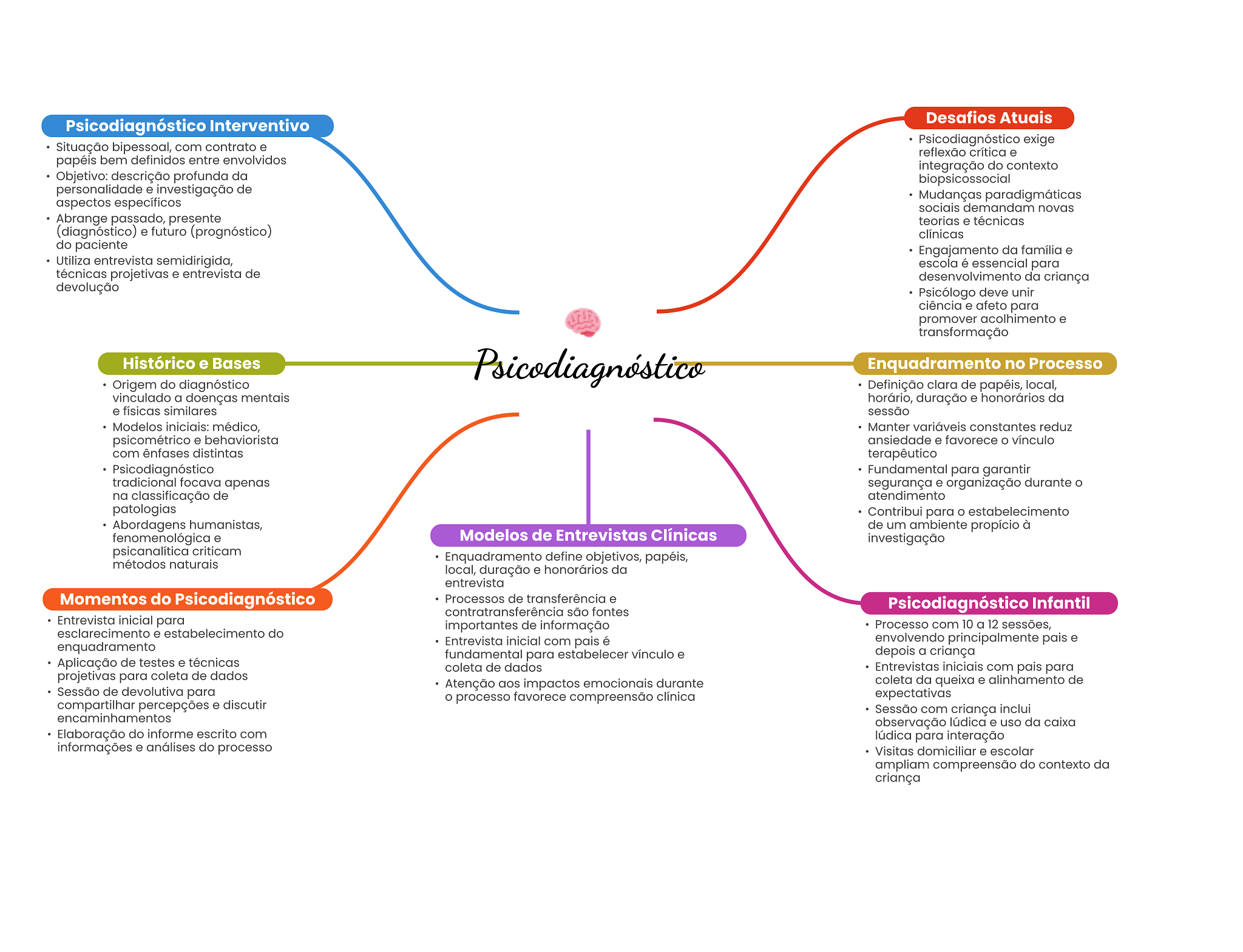 Desafios Atuais Psicodiagnóstico Interventivo Psicodiagnóstico exige Situação bipessoal, com contrato e reflexão crítica e papéis bem definidos entre envolvidos integração do contexto Objetivo: descrição profunda da biopsicossocial personalidade e investigação de Mudanças paradigmáticas aspectos específicos sociais demandam novas Abrange passado, presente teorias e técnicas (diagnóstico) e futuro (prognóstico) clínicas do paciente Engajamento da família e Utiliza entrevista semidirigida, escola é essencial para técnicas projetivas e entrevista de desenvolvimento da criança devolução Psicólogo deve unir ciência e afeto para promover acolhimento e transformação Histórico e Bases Psicodiagnóstico Enquadramento no Processo Origem do diagnóstico Definição clara de papéis, local, vinculado a doenças mentais horário, duração e honorários da e físicas similares sessão Modelos iniciais: médico, Manter variáveis constantes reduz psicométrico e behaviorista ansiedade e favorece O vínculo com ênfases distintas terapêutico Psicodiagnóstico Fundamental para garantir tradicional focava apenas segurança e organização durante na classificação de atendimento patologias Contribui para estabelecimento Abordagens humanistas, de um ambiente propício à fenomenológica e Modelos de Entrevistas Clínicas investigação psicanalítica criticam Enquadramento define objetivos, papéis, métodos naturais local, duração e honorários da entrevista Momentos do Psicodiagnóstico Processos de transferência e Psicodiagnóstico Infantil contratransferência são fontes Entrevista inicial para importantes de informação Processo com 10 a 12 sessões, esclarecimento e estabelecimento do Entrevista inicial com pais é envolvendo principalmente pais e enquadramento fundamental para estabelecer vínculo e depois a criança Aplicação de testes e técnicas coleta de dados Entrevistas iniciais com pais para projetivas para coleta de dados Atenção aos impactos emocionais durante coleta da queixa e alinhamento de Sessão de devolutiva para processo favorece compreensão clínica expectativas compartilhar percepções e discutir Sessão com criança inclui encaminhamentos observação lúdica e uso da caixa Elaboração do informe escrito com lúdica para interação informações e análises do processo Visitas domiciliar e escolar ampliam compreensão do contexto da criança