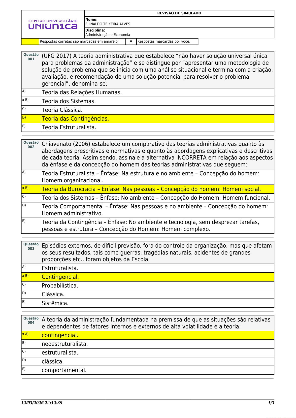 12/03/2026 22:42:39 1/3 REVISÃO DE SIMULADO Nome: ELINALDO TEIXEIRA ALVES Disciplina: Administração e Economia Respostas corretas são marcadas em amarelo X Respostas marcardas por você. Questão 001 (UFG 2017) A teoria administrativa que estabelece “não haver solução universal única para problemas da administração” e se distingue por “apresentar uma metodologia de solução de problema que se inicia com uma análise situacional e termina com a criação, avaliação, e recomendação de uma solução potencial para resolver o problema gerencial”, denomina-se: A) Teoria das Relações Humanas. X B) Teoria dos Sistemas. C) Teoria Clássica. D) Teoria das Contingências. E) Teoria Estruturalista. Questão 002 Chiavenato (2006) estabelece um comparativo das teorias administrativas quanto às abordagens prescritivas e normativas e quanto às abordagens explicativas e descritivas de cada teoria. Assim sendo, assinale a alternativa INCORRETA em relação aos aspectos da ênfase e da concepção do homem das teorias administrativas que seguem: A) Teoria Estruturalista – Ênfase: Na estrutura e no ambiente – Concepção do homem: Homem organizacional. X B) Teoria da Burocracia – Ênfase: Nas pessoas – Concepção do homem: Homem social. C) Teoria dos Sistemas – Ênfase: No ambiente – Concepção do Homem: Homem funcional. D) Teoria Comportamental – Ênfase: Nas pessoas e no ambiente – Concepção do homem: Homem administrativo. E) Teoria da Contingência – Ênfase: No ambiente e tecnologia, sem desprezar tarefas, pessoas e estrutura – Concepção do Homem: Homem complexo. Questão 003 Episódios externos, de difícil previsão, fora do controle da organização, mas que afetam os seus resultados, tais como guerras, tragédias naturais, acidentes de grandes proporções etc., foram objetos da Escola A) Estruturalista. X B) Contingencial. C) Probabilística. D) Clássica. E) Sistêmica. Questão 004 A teoria da administração fundamentada na premissa de que as situações são relativas e dependentes de fatores internos e externos de alta volatilidade é a teoria: X A) contingencial. B) neoestruturalista. C) estruturalista. D) clássica. E) comportamental. 12/03/2026 22:42:39 2/3 Questão 005 (FCC 2020) A abordagem da administração orientada pelo entendimento de que as características ambientais condicionam as características organizacionais é baseada na teoria X A) da contingência. B) das relações humanas. C) clássica. D) da burocracia. E) neoclássica. Questão 006 (ENADE TEC. DA QUALIDADE 2018) As bases teóricas da Administração ainda estão em formação, tendo os estudos pioneiros de Taylor e Fayol, por exemplo, sido ampliados, de forma significativa, nos anos posteriores à sua publicação. No que se refere a essas bases teóricas, avalie as afirmações a seguir. I.No âmbito da burocracia, o trabalho realiza-se por meio de funcionários que ocupam cargos, os quais têm atribuições oficiais, fixas e ordenadas por meio de leis, normas e resoluções. II.No âmbito da administração científica, enfatizam-se o estudo das tarefas, a seleção e o treinamento de trabalhadores e a busca pela eficiência operacional. III.A reengenharia de processos prevê um esforço deliberado de se obter uma visão sistêmica da empresa, lastreado em estruturas organizacionais verticalizadas. IV.Sob o ponto de vista contingencial, procura-se analisar como as condições ambientais da empresa afetam as possibilidades de escolha nas decisões organizacionais. V.Segundo a abordagem comportamentalista, a eficácia organizacional é promovida pela aplicação de análise quantitativa aos problemas e às decisões administrativas. É correto apenas o que se afirma em: A) III, IV e V. B) I, II e III. C) I e V. X D) I, II e IV. E) II, III, IV e V. Questão 007 A abordagem da administração orientada pelo entendimento de que as características ambientais condicionam as características organizacionais é baseada na teoria A) neoclássica. X B) da contingência. C) clássica. D) da burocracia. E) das relações humanas. 12/03/2026 22:42:39 3/3 Questão 008 (ENADE ADMINISTRAÇÃO 2015) As organizações, enquanto fenômenos complexos, são influenciadas por alterações que ocorrem ao longo do tempo em função das demandas sociais, políticas, econômicas, culturais e, mais precisamente no contexto atual, tecnológicas. Essas mutações demandam entendimento dos processos que envolvem o ciclo de vida dessas entidades e as formar pelas quais elas devem ser gerenciadas, considerando a articulação entre os elementos de seu planejamento estratégico. Além de se tornar substancial para o fomento e a formulação de estratégias, compreender os aspectos históricos, econômicos, contextuais e políticos de uma organização é fator preponderante para o seu sucesso. (JUNQUEIRA, E.; FREZATTI, F. Perfil do sistema de controle gerencial das empresas brasileiras (adaptado). A partir das ideias apresentadas no texto, assinale a opção que descreve a corrente teórica mais adequada à interpretação do cenário apresentado. A) Escola burocrática, que postula a necessidade de modelos racionais, para a criação da estrutura organizacional, à luz do planejamento estratégico da organização. B) Escola Clássica da Administração, que propõe que a mudança organizacional se estabeleça por meio de métodos e técnicas que busquem a máxima eficiência das atividades organizacionais e, assim, se constitua como organização racional do trabalho. C) Abordagem das Relações Humanas, que postula que a estrutura da organização se fortalece com a criação de sistemas organizacionais interdependentes, cuja principal característica é a estrutura técnica. D) Escola Comportamentalista, que prevê a adaptação organizacional associada á classificação dos profissionais por aspectos relacionados à motivação, o que torna a mudança organizacional independente das pessoa