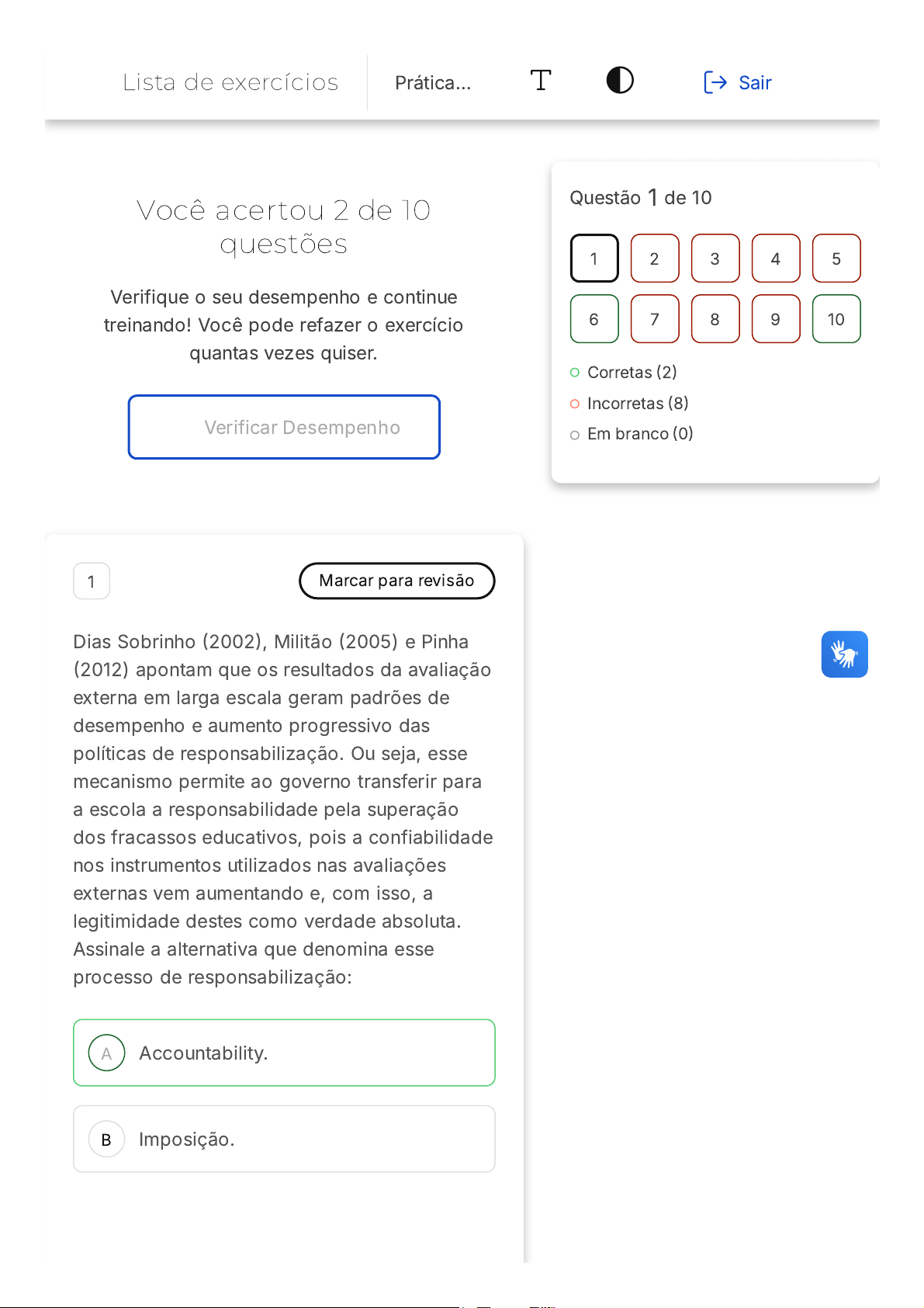 24/03/2026 15:50 https://estacio.saladeavaliacoes.com.br/exercicio/69c2dcc8d7f597bfeaf16b72/gabarito/ https://estacio.saladeavaliacoes.com.br/exercicio/69c2dcc8d7f597bfeaf16b72/gabarito/ 1/14 Você acertou 2 de 10 questões Verifique o seu desempenho e continue treinando! Você pode refazer o exercício quantas vezes quiser. Verificar Desempenho A B 1 Marcar para revisão Dias Sobrinho �2002�, Militão �2005) e Pinha �2012) apontam que os resultados da avaliação externa em larga escala geram padrões de desempenho e aumento progressivo das políticas de responsabilização. Ou seja, esse mecanismo permite ao governo transferir para a escola a responsabilidade pela superação dos fracassos educativos, pois a confiabilidade nos instrumentos utilizados nas avaliações externas vem aumentando e, com isso, a legitimidade destes como verdade absoluta. Assinale a alternativa que denomina esse processo de responsabilização: Accountability. Imposição. Questão 1 de 10 Corretas �2� Incorretas �8� Em branco �0� 1 2 3 4 5 6 7 8 9 10 Lista de exercícios Prática… Sair 24/03/2026 15:50 https://estacio.saladeavaliacoes.com.br/exercicio/69c2dcc8d7f597bfeaf16b72/gabarito/ https://estacio.saladeavaliacoes.com.br/exercicio/69c2dcc8d7f597bfeaf16b72/gabarito/ 2/14 C D E Informação. Prestação. Justificação. Resposta incorreta Opa! A alternativa correta é a letra A. Confira o gabarito comentado! Gabarito Comentado O termo "Accountability" é a denominação correta para o processo de responsabilização descrito no enunciado. Este termo, de origem inglesa, é frequentemente utilizado para se referir à responsabilidade de entidades (como escolas, neste caso) por suas ações e decisões, especialmente em relação à gestão e aos resultados alcançados. Portanto, no contexto da questão, "Accountability" se refere à transferência de responsabilidade para a escola pela superação dos fracassos educativos, um processo que tem ganhado legitimidade com o aumento da confiabilidade nos instrumentos de avaliação externa. 2 Marcar para revisão A avaliação institucional abrange dimensões qualitativas e quantitativas. Assinale a alternativa que descreve o principal motivo 24/03/2026 15:50 https://estacio.saladeavaliacoes.com.br/exercicio/69c2dcc8d7f597bfeaf16b72/gabarito/ https://estacio.saladeavaliacoes.com.br/exercicio/69c2dcc8d7f597bfeaf16b72/gabarito/ 3/14 A B C D E para haver uma avaliação qualitativa nas/das escolas: Revisar a composição do Conselho Escola-Comunidade. Melhorar a infraestrutura escolar. Aumentar o IDEB da escola. Revisar as metas estipuladas para a Prova Brasil. Revisar constantemente o PPP. Resposta incorreta Opa! A alternativa correta é a letra E. Confira o gabarito comentado! Gabarito Comentado A alternativa correta é a E, que menciona a revisão constante do PPP �Projeto Político Pedagógico). A avaliação qualitativa nas escolas é fundamental para a revisão e atualização constante do PPP, que é um documento que define os objetivos, metas e estratégias de ação da escola, considerando sua realidade e seu contexto. Portanto, a avaliação qualitativa contribui para a melhoria contínua do processo educacional, permitindo ajustes e melhorias no PPP conforme as necessidades identificadas. 24/03/2026 15:50 https://estacio.saladeavaliacoes.com.br/exercicio/69c2dcc8d7f597bfeaf16b72/gabarito/ https://estacio.saladeavaliacoes.com.br/exercicio/69c2dcc8d7f597bfeaf16b72/gabarito/ 4/14 A B C D E 3 Marcar para revisão A partir dos princípios da autonomia, da ideia de descentralização dos procedimentos e da tomada de decisão colegiada, uma avaliação institucional das atividades da escola deve ser desenvolvida tendo em vista a aceitação ou conscientização da necessidade da avaliação por todos os segmentos envolvidos, dos executores aos beneficiários; o reconhecimento da legitimidade e pertinência dos critérios a serem adotados; o envolvimento direto de todos os segmentos da comunidade escolar - interna e externa - na execução e na implementação de melhoria do desempenho escolar. Lendo o trecho acima, percebe-se que as avaliações "forçam", de alguma forma, a melhoria do desempenho escolar. Assinale a alternativa que abrange as áreas que podem/devem melhorar com as avaliações na camada escolar: A gestão e o ensino. A gestão e o currículo. O currículo e o ensino. A infraestrutura predial e a disponibilização de materiais escolares. A formação docente e a merenda escolar Resposta incorreta 24/03/2026 15:50 https://estacio.saladeavaliacoes.com.br/exercicio/69c2dcc8d7f597bfeaf16b72/gabarito/ https://estacio.saladeavaliacoes.com.br/exercicio/69c2dcc8d7f597bfeaf16b72/gabarito/ 5/14 Opa! A alternativa correta é a letra A. Confira o gabarito comentado! Gabarito Comentado A resposta correta é: A gestão e o ensino. As avaliações escolares são importantes para que a escola possa identificar os pontos fortes e fracos de seu trabalho e, assim, melhorar a qualidade do ensino. As avaliações também podem ajudar a identificar alunos que estão com dificuldades e precisam de mais apoio. A gestão e o ensino são duas áreas que podem ser melhoradas com as avaliações escolares. A gestão escolar pode ser melhorada por meio de avaliações que identifiquem os pontos fortes e fracos da gestão e que ajudem a desenvolver estratégias para melhorar o desempenho da escola. O ensino pode ser melhorado por meio de avaliações que identifiquem os pontos fortes e fracos dos professores e que ajudem a desenvolver estratégias para melhorar o ensino. As avaliações escolares são uma ferramenta importante para melhorar a qualidade do ensino. Elas podem ajudar a identificar os pontos fortes e fracos da escola e dos professores e, assim, ajudar a desenvolver estratégias para melhorar o desempenho da escola. 4 Marcar para revisão O Exame Nacional de Cursos �ENC) coletou, a partir da primeira divulgação dos resultados, em 1996, 