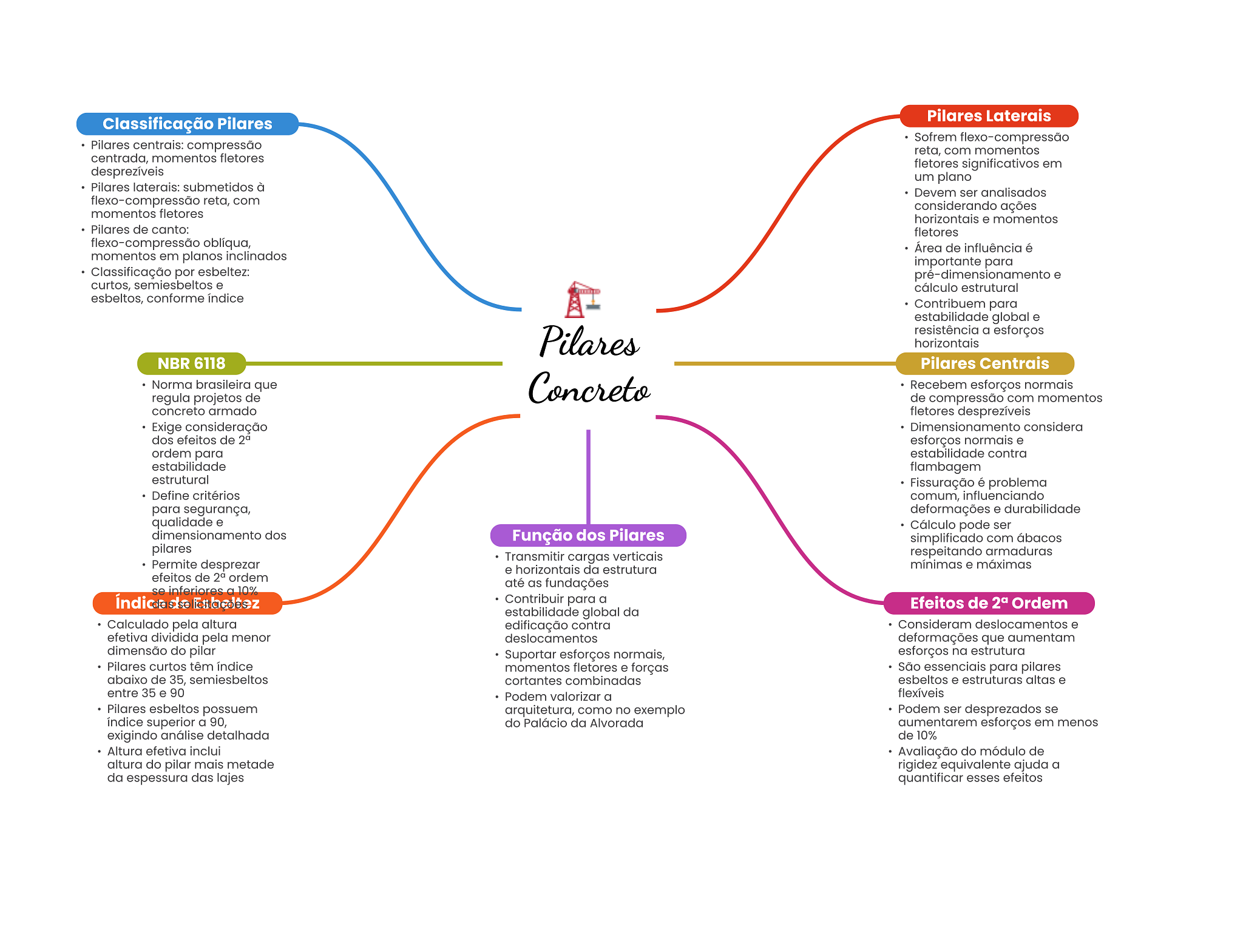 Pilares Laterais Classificação Pilares Sofrem flexo-compressão Pilares centrais: compressão reta, com momentos centrada, momentos fletores fletores significativos em desprezíveis um plano Pilares laterais: submetidos à Devem ser analisados flexo-compressão reta, com considerando ações momentos fletores horizontais e momentos Pilares de canto: fletores flexo-compressão oblíqua, Área de influência é momentos em planos inclinados importante para Classificação por esbeltez: pré-dimensionamento e curtos, semiesbeltos e cálculo estrutural esbeltos, conforme índice Contribuem para estabilidade global e Pilares resistência a esforços horizontais NBR 6118 Pilares Centrais Norma brasileira que regula projetos de Concreto Recebem esforços normais de compressão com momentos concreto armado fletores desprezíveis Exige consideração Dimensionamento considera dos efeitos de esforços normais e ordem para estabilidade contra estabilidade flambagem estrutural Fissuração é problema Define critérios comum, influenciando para segurança, deformações e durabilidade qualidade e Cálculo pode ser dimensionamento dos Função dos Pilares simplificado com ábacos pilares Transmitir cargas verticais respeitando armaduras Permite desprezar e horizontais da estrutura mínimas e máximas efeitos de ordem até as fundações se inferiores a 10% so Contribuir para a Efeitos de 2a Ordem estabilidade global da Calculado pela altura edificação contra Consideram deslocamentos e efetiva dividida pela menor deslocamentos deformações que aumentam dimensão do pilar Suportar esforços normais, esforços na estrutura Pilares curtos têm índice momentos fletores e forças São essenciais para pilares abaixo de 35, semiesbeltos cortantes combinadas esbeltos e estruturas altas e entre 35 e 90 Podem valorizar a flexíveis Pilares esbeltos possuem arquitetura, como no exemplo Podem ser desprezados se índice superior a 90, do Palácio da Alvorada aumentarem esforços em menos exigindo análise detalhada de 10% Altura efetiva inclui Avaliação do módulo de altura do pilar mais metade rigidez equivalente ajuda a da espessura das lajes quantificar esses efeitos