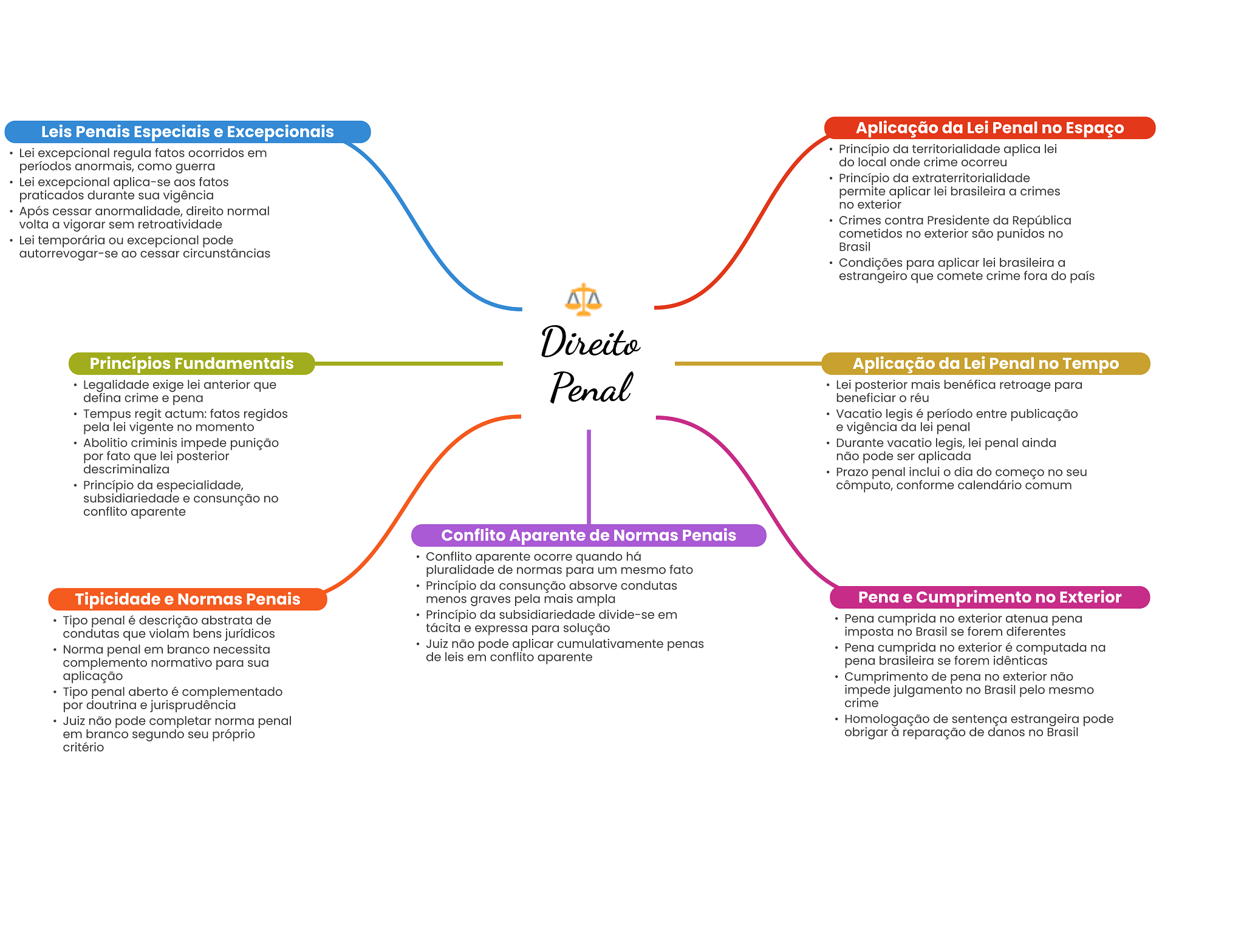 Leis Penais Especiais e Excepcionais Aplicação da Lei Penal no Espaço Lei excepcional regula fatos ocorridos em Princípio da territorialidade aplica lei períodos anormais, como guerra do local onde crime ocorreu Lei excepcional aplica-se aos fatos Princípio da extraterritorialidade praticados durante sua vigência permite aplicar lei brasileira a crimes no exterior Após cessar anormalidade, direito normal volta a vigorar sem retroatividade Crimes contra Presidente da República Lei temporária ou excepcional pode cometidos no exterior são punidos no Brasil autorrevogar-se ao cessar circunstâncias Condições para aplicar lei brasileira a estrangeiro que comete crime fora do país Direito Princípios Fundamentais Aplicação da Lei Penal no Tempo Legalidade exige lei anterior que Penal Lei posterior mais benéfica retroage para defina crime e pena beneficiar réu Tempus regit actum: fatos regidos Vacatio legis é período entre publicação pela lei vigente no momento e vigência da lei penal Abolitio criminis impede punição Durante vacatio legis, lei penal ainda por fato que lei posterior não pode ser aplicada descriminaliza Prazo penal inclui dia do começo no seu Princípio da especialidade, cômputo, conforme calendário comum subsidiariedade e consunção no conflito aparente Conflito Aparente de Normas Penais Conflito aparente ocorre quando há pluralidade de normas para um mesmo fato Princípio da consunção absorve condutas Tipicidade e Normas Penais menos graves pela mais ampla Pena e Cumprimento no Exterior Tipo penal é descrição abstrata de Princípio da subsidiariedade divide-se em Pena cumprida no exterior atenua pena condutas que violam bens jurídicos tácita e expressa para solução imposta no Brasil se forem diferentes Norma penal em branco necessita Juiz não pode aplicar cumulativamente penas Pena cumprida no exterior é computada na complemento normativo para sua de leis em conflito aparente pena brasileira se forem idênticas aplicação Cumprimento de pena no exterior não Tipo penal aberto é complementado impede julgamento no Brasil pelo mesmo por doutrina e jurisprudência crime Juiz não pode completar norma penal Homologação de sentença estrangeira pode em branco segundo seu próprio obrigar à reparação de danos no Brasil critério