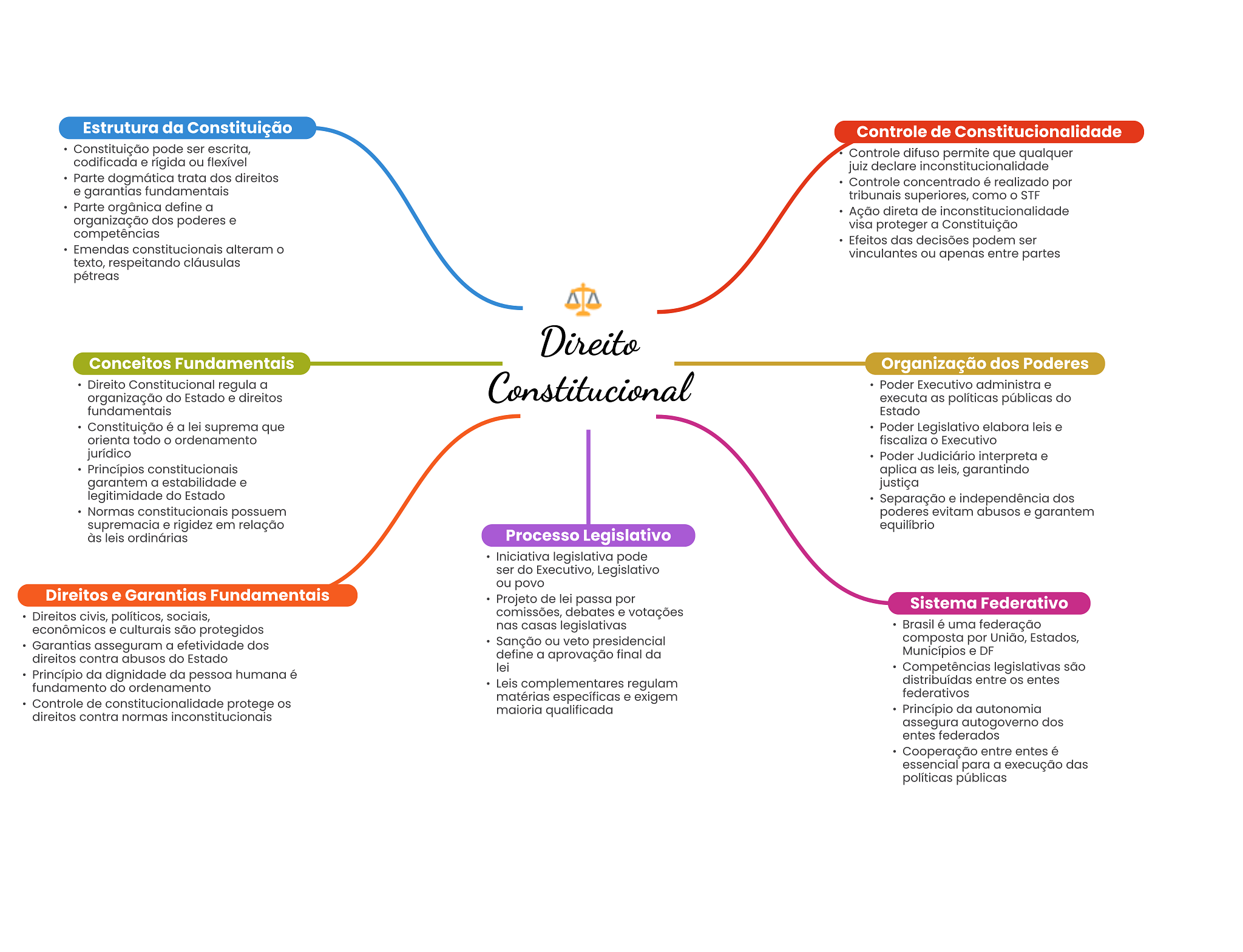 Estrutura da Constituição Controle de Constitucionalidade Constituição pode ser escrita, Controle difuso permite que qualquer codificada e rígida ou flexível juiz declare inconstitucionalidade Parte dogmática trata dos direitos Controle concentrado é realizado por e garantias fundamentais tribunais superiores, como STF Parte orgânica define a Ação direta de inconstitucionalidade organização dos poderes e visa proteger a Constituição competências Efeitos das decisões podem ser Emendas constitucionais alteram vinculantes ou apenas entre partes texto, respeitando cláusulas pétreas Direito Conceitos Fundamentais Organização dos Poderes Direito Constitucional regula a Constitucional Poder Executivo administra e organização do Estado e direitos executa as políticas públicas do fundamentais Estado Constituição é a lei suprema que Poder Legislativo elabora leis e orienta todo ordenamento fiscaliza O Executivo jurídico Poder Judiciário interpreta e Princípios constitucionais aplica as leis, garantindo garantem a estabilidade e justiça legitimidade do Estado Separação e independência dos Normas constitucionais possuem poderes evitam abusos e garantem supremacia e rigidez em relação equilíbrio às leis ordinárias Processo Legislativo Iniciativa legislativa pode ser do Executivo, Legislativo ou povo Direitos e Garantias Fundamentais Projeto de lei passa por Sistema Federativo Direitos civis, políticos, sociais, comissões, debates e votações econômicos e culturais são protegidos nas casas legislativas Brasil é uma federação Garantias asseguram a efetividade dos Sanção ou veto presidencial composta por União, Estados, define a aprovação final da Municípios e DF direitos contra abusos do Estado lei Competências legislativas são Princípio da dignidade da pessoa humana é Leis complementares regulam distribuídas entre os entes fundamento do ordenamento Controle de constitucionalidade protege matérias específicas e exigem federativos direitos contra normas inconstitucionais maioria qualificada Princípio da autonomia assegura autogoverno dos entes federados Cooperação entre entes é essencial para a execução das políticas públicas