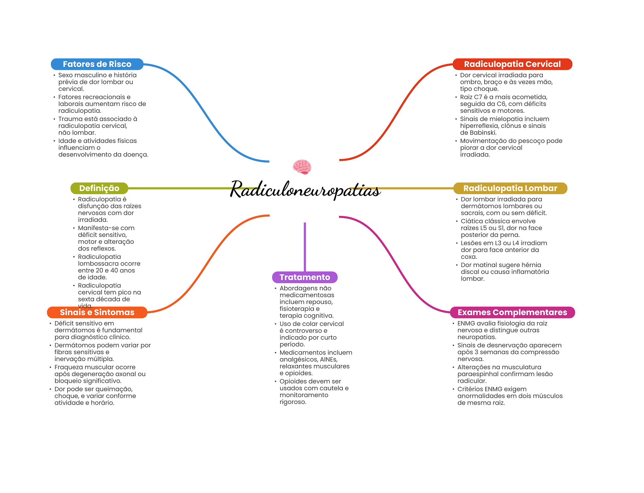 Fatores de Risco Radiculopatia Cervical Sexo masculino e história Dor cervical irradiada para prévia de dor lombar ou ombro, braço e às vezes mão, cervical. tipo choque. Fatores recreacionais e Raiz C7 é a mais acometida, laborais aumentam risco de seguida da C6, com déficits radiculopatia. sensitivos e motores. Trauma está associado à Sinais de mielopatia incluem radiculopatia cervical, hiperreflexia, clônus e sinais não lombar. de Babinski. Idade e atividades físicas Movimentação do pescoço pode influenciam piorar a dor cervical desenvolvimento da doença. irradiada. Definição Radiculoneuropatias Radiculopatia Lombar Radiculopatia é Dor lombar irradiada para disfunção das raízes dermátomos lombares ou nervosas com dor sacrais, com ou sem déficit. irradiada. Ciática clássica envolve Manifesta-se com raízes L5 ou S1, dor na face déficit sensitivo, posterior da perna. motor e alteração Lesões em L3 ou L4 irradiam dos reflexos. dor para face anterior da Radiculopatia coxa. lombossacra ocorre Dor matinal sugere hérnia entre 20 e 40 anos discal ou causa inflamatória de idade. Tratamento lombar. Radiculopatia Abordagens não cervical tem pico na medicamentosas sexta década de incluem repouso, vida Sinais e Sintomas fisioterapia e terapia cognitiva. Exames Complementares Déficit sensitivo em Uso de colar cervical ENMG avalia fisiologia da raiz dermátomos é fundamental é controverso e nervosa e distingue outras para diagnóstico clínico. indicado por curto neuropatias. Dermátomos podem variar por período. Sinais de desnervação aparecem fibras sensitivas e Medicamentos incluem após 3 semanas da compressão inervação múltipla. analgésicos, nervosa. Fraqueza muscular ocorre relaxantes musculares Alterações na musculatura após degeneração axonal ou e opioides. paraespinhal confirmam lesão bloqueio significativo. Opioides devem ser radicular. Dor pode ser queimação, usados com cautela e Critérios ENMG exigem choque, e variar conforme monitoramento anormalidades em dois músculos atividade e horário. rigoroso. de mesma raiz.