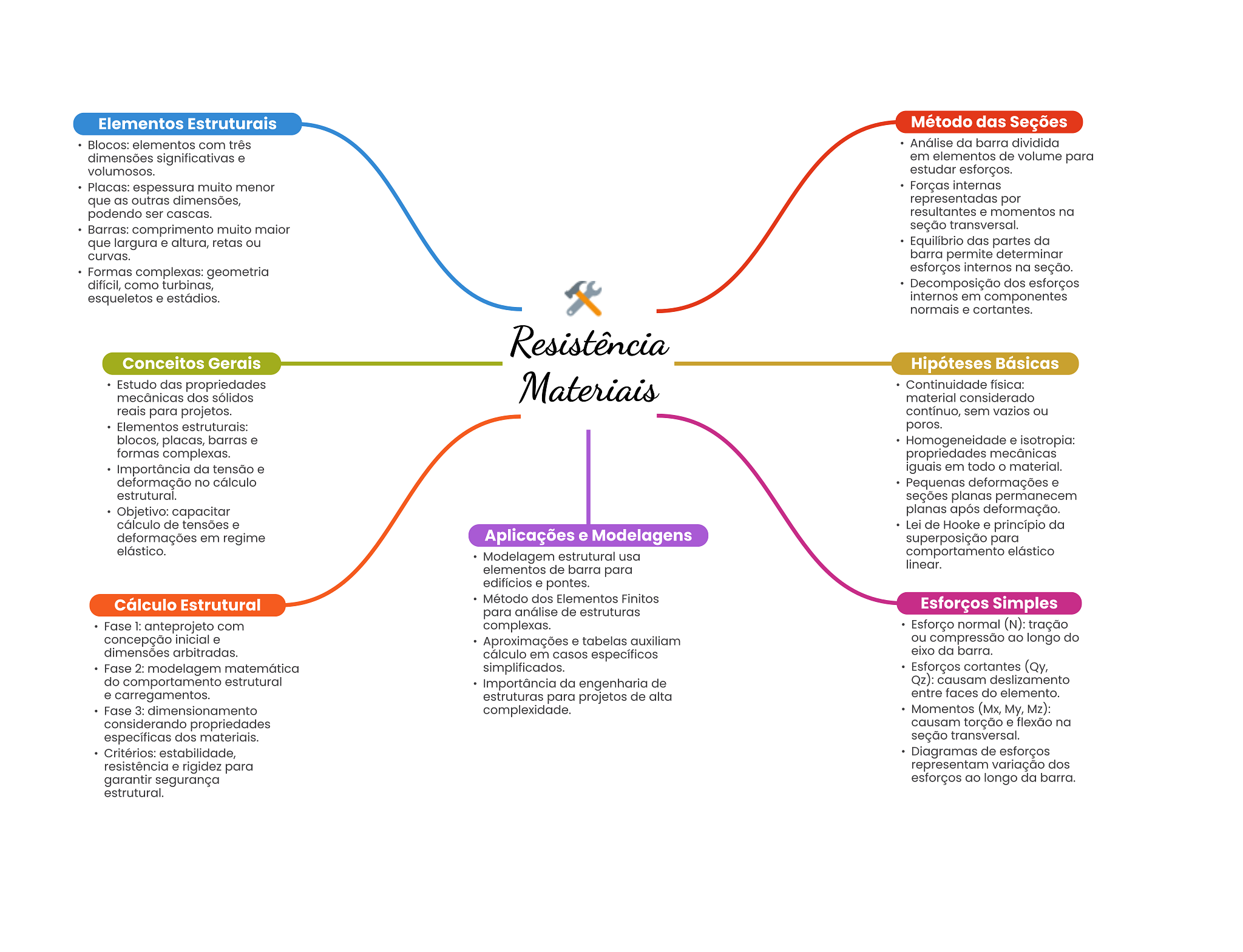 Elementos Estruturais Método das Seções Blocos: elementos com três Análise da barra dividida dimensões significativas e em elementos de volume para volumosos. estudar esforços. Placas: espessura muito menor Forças internas que as outras dimensões, representadas por podendo ser cascas. resultantes e momentos na Barras: comprimento muito maior seção transversal. que largura e altura, retas ou Equilíbrio das partes da curvas. barra permite determinar Formas complexas: geometria esforços internos na seção. difícil, como turbinas, Decomposição dos esforços esqueletos e estádios. internos em componentes normais e cortantes. Resistência Conceitos Gerais Hipóteses Básicas Estudo das propriedades mecânicas dos sólidos Materiais Continuidade física: material considerado reais para projetos. contínuo, sem vazios ou Elementos estruturais: poros. blocos, placas, barras e Homogeneidade e isotropia: formas complexas. propriedades mecânicas Importância da tensão e iguais em todo O material. deformação no cálculo Pequenas deformações e estrutural. seções planas permanecem Objetivo: capacitar planas após deformação. cálculo de tensões e Lei de Hooke e princípio da deformações em regime Aplicações e Modelagens superposição para elástico. Modelagem estrutural usa comportamento elástico linear. elementos de barra para edifícios e pontes. Cálculo Estrutural Método dos Elementos Finitos Esforços Simples para análise de estruturas Fase 1: anteprojeto com complexas. Esforço normal (N): tração concepção inicial e Aproximações e tabelas auxiliam ou compressão ao longo do dimensões arbitradas. cálculo em casos específicos eixo da barra. Fase 2: modelagem matemática simplificados. Esforços cortantes (Qy, do comportamento estrutural Importância da engenharia de Qz): causam deslizamento e carregamentos. estruturas para projetos de alta entre faces do elemento. Fase 3: dimensionamento complexidade. Momentos (Mx, My, Mz): considerando propriedades causam torção e flexão na específicas dos materiais. seção transversal. Critérios: estabilidade, Diagramas de esforços resistência e rigidez para representam variação dos garantir segurança esforços ao longo da barra. estrutural.