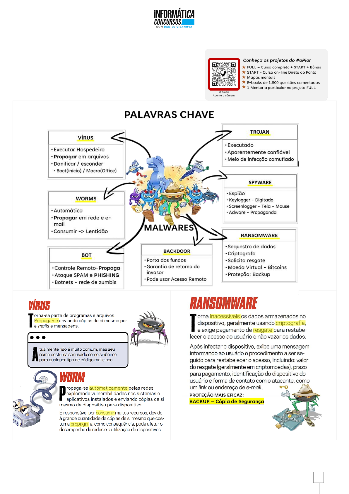 Youtube: Professor Danilo Vilanova | INFORMATICACONCURSOS.COM | @profdanilovilanovaopior 1 INFORMÁTICA COM DANILO VILANOVA https://informaticaconcursos.com TEMA DA AULA: Segurança - Malwares Malwares são códigos maliciosos. https://informaticaconcursos.com/ Youtube: Professor Danilo Vilanova | INFORMATICACONCURSOS.COM | @profdanilovilanovaopior 2 QUESTÕES QUE MAIS CAEM 1. Provas: CESPE / CEBRASPE - 2022 - MC - Técnico Malware é qualquer software intencionalmente criado para causar danos a um computador, servidor, cliente ou a uma rede de computadores. Certo ( ) Errado ( ) 2. Prova: CESPE / CEBRASPE - 2021 - BANESE Vírus é um pequeno programa de computador que propositalmente se replica e não depende de um usuário para se espalhar, uma vez que, quando ativado, se espalha automaticamente. Certo ( ) Errado ( ) 3. Provas: CESPE / CEBRASPE - 2021 - PC-AL - Escrivão A grande diferença entre vírus e worms está na forma como eles se propagam: o vírus, ao contrário do worm, não se propaga por meio da inclusão de cópias de si mesmo em outros programas, mas pela execução direta de uma de suas cópias. Certo ( ) Errado ( ) 4. Prova: CESPE / CEBRASPE - 2024 - MPE-TO - Técnico Um tipo muito comum de malware são os chamados worms, programas com capacidade de se replicar, enviando cópias do próprio worm de um computador para outro computador e explorando pontos de vulnerabilidade dos sistemas. Certo ( ) Errado ( ) 5. Prova: CESPE / CEBRASPE - 2022 - INSS – Técnico Phishing é um tipo de invasão mediante o uso de software malicioso que torna inacessíveis os dados armazenados no equipamento invadido, geralmente usando criptografia, no qual o agente invasor exige o pagamento de resgate para restabelecer o acesso do usuário aos dados afetados. Certo ( ) Errado ( ) 6. Prova: CESPE / CEBRASPE - 2022 - TCE-PB - Auditor O tipo de malware caracterizado por tornar inacessíveis os dados de usuários armazenados em um equipamento, por meio de criptografia, e que geralmente requer acesso a rede para se instalar e executar é denominado ransomware. Certo ( ) Errado ( ) 7. Provas: CESPE / CEBRASPE - 2025 - ANM - Analista Spyware é um golpe em que criminosos se passam por organizações confiáveis para obter informações sensíveis, como senhas e dados bancários, por meio de e-mails ou sites falsos. Certo ( ) Errado ( ) 8. Prova: CESPE / CEBRASPE - 2023 - FUB - Analista Spyware é um código malicioso (malware) que se propaga automaticamente por várias redes de computadores, enviando cópias de si mesmo para cada computador. Certo ( ) Errado ( ) 9. Provas: CESPE / CEBRASPE - 2024 Enfermeiro Keylogger é um tipo de spyware projetado para monitorar as atividades de um sistema por meio da captura e do armazenamento das teclas digitadas. Certo ( ) Errado ( )