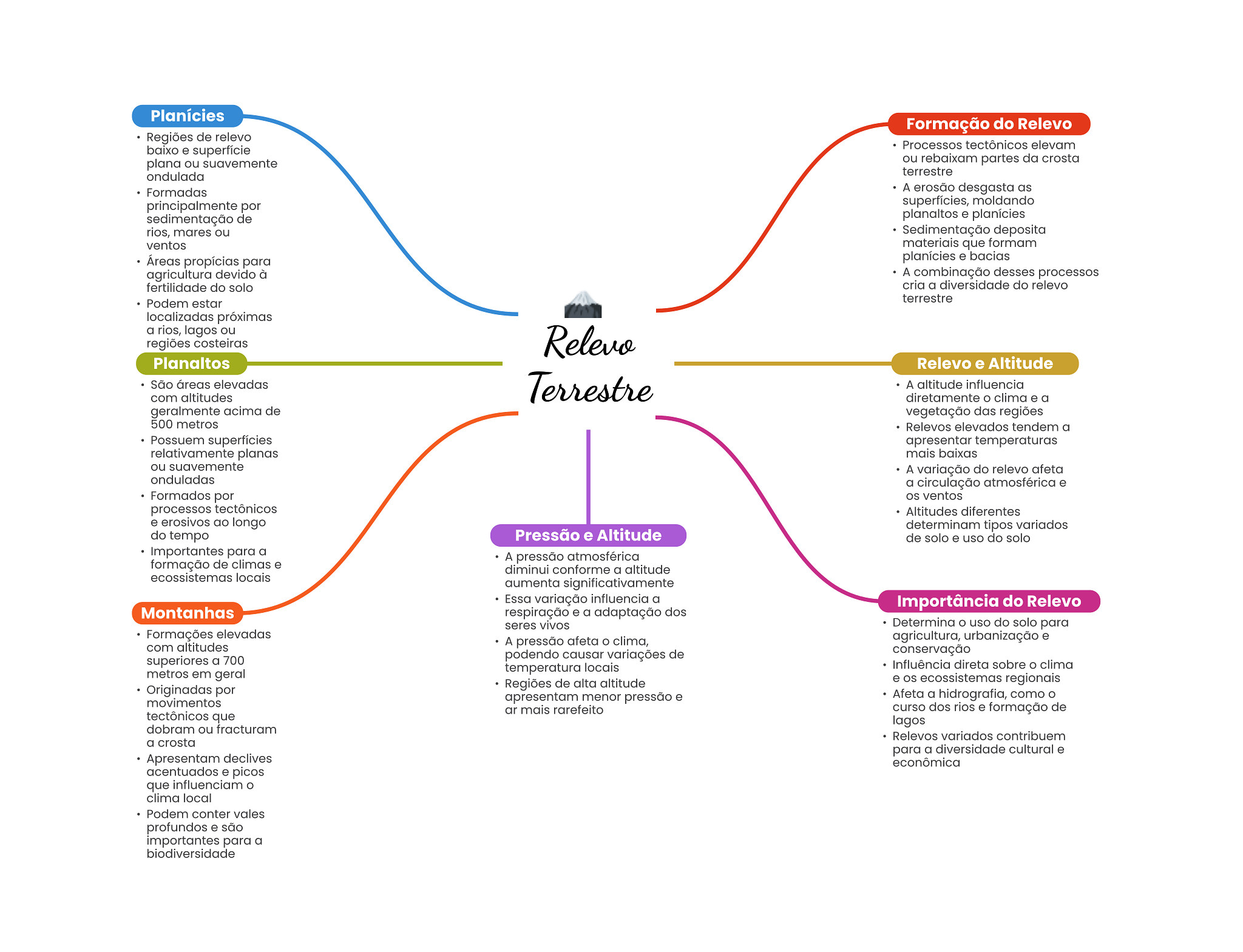 Planícies Formação do Relevo Regiões de relevo Processos tectônicos elevam baixo e superfície plana ou suavemente ou rebaixam partes da crosta ondulada terrestre Formadas A erosão desgasta as principalmente por superfícies, moldando sedimentação de planaltos e planícies rios, mares ou Sedimentação deposita ventos materiais que formam Áreas propícias para planícies e bacias agricultura devido à A combinação desses processos fertilidade do solo cria a diversidade do relevo Podem estar terrestre localizadas próximas a rios, lagos ou regiões costeiras Relevo Planaltos Relevo e Altitude São áreas elevadas Terrestre A altitude influencia com altitudes diretamente clima e a geralmente acima de vegetação das regiões 500 metros Relevos elevados tendem a Possuem superfícies apresentar temperaturas relativamente planas mais baixas ou A variação do relevo afeta onduladas a circulação atmosférica e Formados por OS ventos processos tectônicos Altitudes diferentes e erosivos ao longo determinam tipos variados do tempo Pressão e Altitude de solo e uso do solo Importantes para a A pressão atmosférica formação de climas e diminui conforme a altitude ecossistemas locais aumenta significativamente Essa variação influencia a Importância do Relevo Montanhas respiração e a adaptação dos seres vivos Determina uso do solo para Formações elevadas com altitudes A pressão afeta clima, agricultura, urbanização e podendo causar variações de conservação superiores a 700 temperatura locais Influência direta sobre clima metros em geral Originadas por Regiões de alta altitude e ecossistemas regionais movimentos apresentam menor pressão e Afeta a hidrografia, como O ar mais rarefeito curso dos rios e formação de tectônicos que lagos dobram ou fracturam Relevos variados contribuem a crosta para a diversidade cultural e Apresentam declives econômica acentuados e picos que influenciam clima local Podem conter vales profundos e são importantes para a biodiversidade