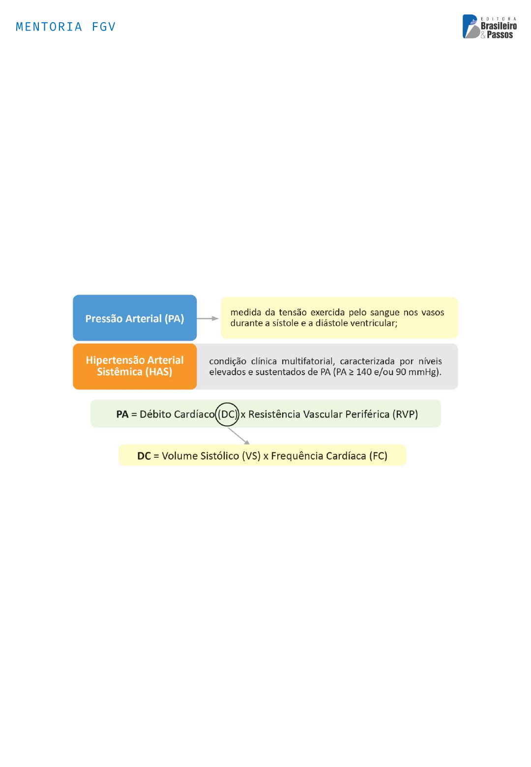 <p>www.romulopassos.com.br 1</p><p>Segunda-feira, às 20h</p><p>FGV/ENARE</p><p>Hipertensão e</p><p>Diabetes Mellitus</p><p>Hipertensão</p><p>Considerações iniciais</p><p>1. (Prefeitura de Manaus-AM/FGV/2022) O débito cardíaco de um paciente é determinado por</p><p>a) pré-carga x pós-carga.</p><p>b) volume sistólico + pré-carga.</p><p>c) pós-carga x frequência cardíaca.</p><p>d) frequência cardíaca x volume sistólico.</p><p>e) volume diastólico + volume sistólico.</p><p>2. (Secretaria de Educação do Estado de Pernambuco – SEE – PE/FGV/2016) O controle das</p><p>doenças não transmissíveis passa pelo conhecimento e combate aos fatores de risco. No caso da</p><p>hipertensão arterial esses fatores de risco podem ser classificados em modificáveis e não</p><p>modificáveis. A esse respeito, assinale a opção que indica um fator de risco não modificável.</p><p>a) Etilismo.</p><p>b) Tabagismo.</p><p>c) Sedentarismo.</p><p>d) Alimentação.</p><p>e) Hereditariedade.</p><p>www.romulopassos.com.br 2</p><p>Principais etapas para a realização da medição da PA:</p><p>- Determinar a circunferência do braço no ponto médio entre acrômio e olécrano.</p><p>- Colocar o manguito, sem deixar folgas, 2 a 3 cm acima da fossa cubital.</p><p>- Estimar o nível da PAS pela palpação do pulso radial.</p><p>- Palpar a artéria braquial na fossa cubital e colocar a campânula ou o diafragma do estetoscópio</p><p>sem compressão excessiva.</p><p>- Inflar rapidamente até ultrapassar 20 a 30 mmHg o nível estimado da PAS obtido pela palpação.</p><p>- Proceder à deflação lentamente (velocidade de 2 mmHg por segundo).</p><p>- Determinar a PAS pela ausculta do primeiro som (fase 1 de Korotkoff) e, depois, aumentar</p><p>ligeiramente a velocidade de deflação.</p><p>- Determinar a PAD no desaparecimento dos sons (fase 5 de Korotkoff).</p><p>- Auscultar cerca de 20 a 30 mmHg abaixo do último som para confirmar seu desaparecimento e</p><p>depois proceder à deflação rápida e completa.</p><p>- Se os batimentos persistirem até o nível zero, determinar a PAD no abafamento dos sons (fase 4</p><p>de Korotkoff) e anotar valores da PAS/PAD/zero.</p><p>- Realizar 3 medidas da PA, com intervalo de 1 a 2 minutos; e medidas adicionais somente se as</p><p>duas primeiras leituras diferirem em mais de 10 mmHg. Deve-se registrar em prontuário a média</p><p>das duas últimas leituras da PA, sem “arredondamentos” e o braço em que a PA foi medida.</p><p>3. (SES-MT/FGV/2024) De acordo com as Diretrizes Brasileiras de Hipertensão, a respeito das</p><p>etapas para realização da medida da pressão arterial usando a técnica auscultatória, analise as</p><p>afirmativas a seguir e assinale (V) para a verdadeira e (F) para a falsa.</p><p>(_) Deve-se colocar o manguito, sem deixar folgas, 4 a 5cm acima da fossa cubital.</p><p>(_) Recomenda-se estimar o nível da Pressão Arterial Sistólica pela palpação do pulso radial.</p><p>(_) O manguito deve ser Inflado rapidamente até ultrapassar 30 a 40mmHg, o nível estimado da</p><p>PAS obtido pela palpação.</p><p>As afirmativas são, respectivamente,</p><p>a) V - V - F.</p><p>b) F - V - F.</p><p>c) V - V - V.</p><p>d) F - F - V.</p><p>www.romulopassos.com.br 3</p><p>4. (Prefeitura de São José dos Campos-SP/FGV/2023) Considerando todos os critérios</p><p>recomendados para o diagnóstico, um dos valores definidores da hipertensão arterial é</p><p>a) PAD maior igual que 80.</p><p>b) PAD maior igual que 85.</p><p>c) PAS maior igual que 130mmHg.</p><p>d) PAS maior igual que 135mmHg.</p><p>e) PAS maior igual que 140mmHg.</p><p>5. (Câmara Municipal de Aracajú-SE/FGV/2021) Um paciente adulto, 50 anos, apresentou valores</p><p>seguidos de Pressão Arterial (PA) com a seguinte variação: PAS entre 140- 159mmHg e PAD entre</p><p>90-99mmHg.</p><p>Considerando que foram seguidos os critérios de validação e confirmação preconizados pela</p><p>Sociedade Brasileira de Cardiologia, esses valores indicam:</p><p>a) PA normal. d) hipertensão estágio 2.</p><p>b) pré-hipertensão. e) hipertensão estágio 3.</p><p>c) hipertensão estágio 1.</p><p>6. (Prefeitura de Paulínia-SP/FGV/2021) Considerando os critérios usados para a classificação da</p><p>pressão arterial (PA), um paciente adulto com PA de 165 x 100 mmHg apresenta</p><p>a) pressão limítrofe. d) hipertensão estágio 3.</p><p>b) hipertensão estágio 1. e) hipertensão estágio 4.</p><p>c) hipertensão estágio 2.</p><p>www.romulopassos.com.br 4</p><p>7. (TJ-DFT/FGV/2022) Paciente de 30 anos foi diagnosticado com hipertensão arterial estágio 3.</p><p>Esse estágio é compatível com o seguinte valor:</p><p>a) PAS = 157 mmHg.</p><p>b) PAD = 108 mmHg.</p><p>c) PAS = 178 mmHg.</p><p>d) PAD = 110 mmHg.</p><p>e) PAS = 160 mmHg.</p><p>8. (Prefeitura de Manaus-AM/FGV/2022) De acordo com as Diretrizes Brasileiras de Hipertensão</p><p>Arterial, a hipertensão gestacional é definida como</p><p>a) PAS maior igual que 130 mmHg e/ou PAD maior igual que 85 mmHg, ou ambos, medida em duas</p><p>ocasiões com pelo menos 6 horas de intervalo.</p><p>b) PAS maior igual que 140 mmHg e/ou PAD maior igual que 90 mmHg, ou ambos, medida em duas</p><p>ocasiões com pelo menos 4 horas de intervalo.</p><p>c) PAS maior igual que 150 mmHg e/ou PAD maior igual que 95 mmHg, ou ambos, medida em duas</p><p>ocasiões com pelo menos 8 horas de intervalo.</p><p>d) PAS maior igual que 160 mmHg e/ou PAD maior igual que 100 mmHg, ou ambas, medidas em</p><p>duas ocasiões com, pelo menos, 4 horas de intervalo.</p><p>e) PAS maior igual que 170 mmHg e/ou PAD maior igual que 110 mmHg, ou ambos, medida em</p><p>duas ocasiões com pelo menos 6 horas de intervalo.</p><p>Diretrizes Brasileiras de Hipertensão Arterial – 2020</p><p>9. (FHEMIG/FGV/2023) Uma Gestante de 27 anos, 21ª semana de gestação, foi internada em</p><p>uma unidade hospitalar apresentando um quadro de Hipertensão Gestacional Grave.</p><p>Assinal