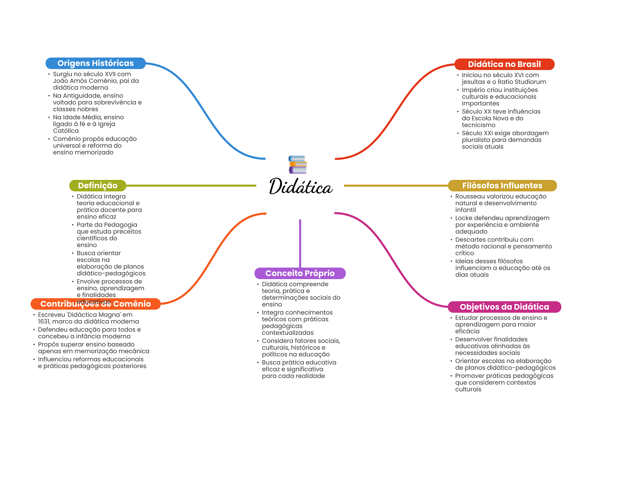 Origens Históricas Didática no Brasil Surgiu no século XVII com Iniciou no século XVI com João Amós Comênio, pai da jesuítas e Ratio Studiorum didática moderna Império criou instituições Na Antiguidade, ensino culturais e educacionais voltado para sobrevivência e importantes classes nobres Século teve influências Na Idade Média, ensino da Escola Nova e do ligado à fé e à Igreja tecnicismo Católica Século XXI exige abordagem Comênio propôs educação pluralista para demandas universal e reforma do sociais atuais ensino memorizado Definição Didática Filósofos Influentes Didática integra Rousseau valorizou educação teoria educacional e natural e prática docente para infantil ensino eficaz Locke defendeu aprendizagem Parte da Pedagogia por experiência e ambiente que estuda preceitos adequado científicos do Descartes contribuiu com ensino método racional e pensamento Busca orientar crítico escolas na Ideias desses filósofos elaboração de planos influenciam a educação até didático-pedagógicos Conceito Próprio dias atuais Envolve processos de Didática compreende ensino, aprendizagem teoria, prática e e finalidades determinações sociais do Contribuições de Comênio ensino Objetivos da Didática Escreveu Didáctica em Integra conhecimentos 1631, marco da didática moderna teóricos com práticas Estudar processos de ensino e pedagógicas aprendizagem para maior Defendeu educação para todos e contextualizadas eficácia concebeu a infância moderna Considera fatores sociais, Desenvolver finalidades Propôs superar ensino baseado culturais, históricos e educativas alinhadas às apenas em memorização mecânica políticos na educação necessidades sociais Influenciou reformas educacionais e práticas pedagógicas posteriores Busca prática educativa Orientar escolas na elaboração eficaz e significativa de planos didático-pedagógicos para cada realidade Promover práticas pedagógicas que considerem contextos culturais