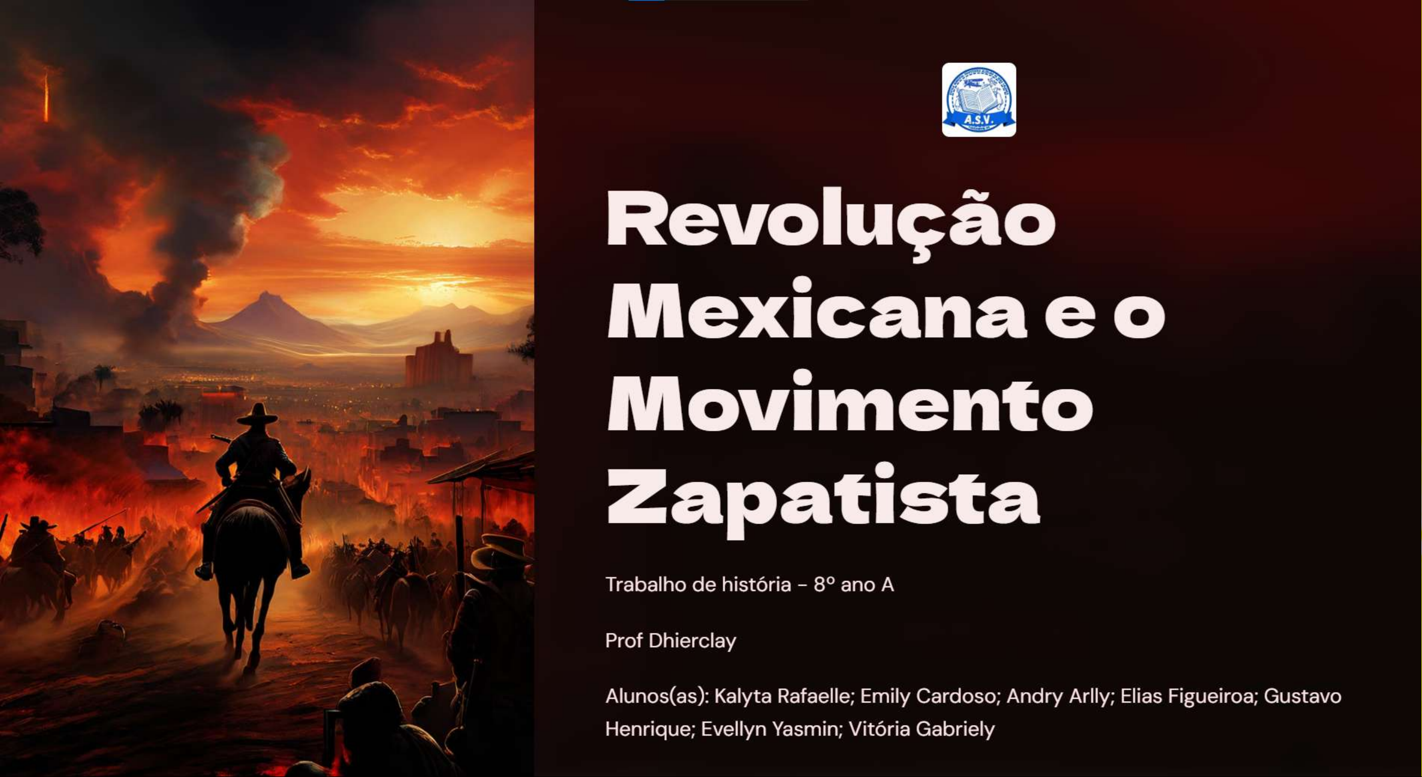 A.S.V. Revolução Mexicana Movimento Zapatista Trabalho de história - 8° ano A Prof Dhierclay Alunos(as): Kalyta Rafaelle; Emily Cardoso; Andry Arlly; Elias Figueiroa; Henrique; Evellyn Yasmin; Vitória GabrielyCausas da Revolução Mexicana 1 Desigualdade 2 Ditadura de 3 Questão Agrária Social Porfirio Díaz Concentração de terras nas Profundas disparidades Período de 35 anos de governo mãos de poucos latifundiários, econômicas e sociais entre a autoritário e centralizado, que marginalizando pequenos elite e as classes trabalhadoras ignorou as demandas da agricultores e camponeses. e camponesas. população.Início da Revolução 1 Eleição de 1910 A candidatura de Francisco Madero desafiou o domínio de Porfirio Díaz, levando a eleições contestadas. 2 Plano de San Luis Potosí Madero convocou a população a se levantar contra o governo, dando início à Revolução Mexicana. 3 Derrubada de Díaz As forças revolucionárias, incluindo os zapatistas, conseguiram derrubar o regime de Díaz em 1911.Principais Líderes da Revolução Francisco Madero Emiliano Zapata Venustiano Carranza Líder da revolta inicial contra Díaz, Líder camponês do sul que lutou foi eleito presidente em 1911, mas pela reforma agrária e justiça Chefe do Exército logo depois deposto e social. Criou o Exército Libertador Constitucionalista, conseguiu assassinado. do Sul. consolidar o poder após a derrubada de Díaz.Emiliano Zapata Biografia Líder camponês e revolucionário, nascido em Anenecuilco, Morelos, em 1879. Visão Zapatista Luta pela reforma agrária e justiça social, representada no Plano de Ayala. Exército Libertador Comandou Exército Libertador do Sul, liderando as forças zapatistas. Morte Assassinado em uma emboscada em 1919, tornando-se um mártir da Revolução.Movimento Zapatista Reforma Agrária Luta Armada Plano de Ayala movimento zapatista lutava pela Os zapatistas participaram Documento fundamental que redistribuição de terras e justiça ativamente dos combates durante expressava as reivindicações do social. a Revolução Mexicana. movimento zapatista.A Constituição de 1917 Mudanças Constitucionais 1 A nova Constituição trouxe importantes transformações políticas e sociais. Influência da Revolução 2 As demandas e lutas da Revolução Mexicana foram refletidas na Carta Magna. Impacto Agrário 3 A Constituição abordou questões fundiárias, beneficiando pequenos produtores.Legado de Zapata Símbolo Zapata tornou-se um ícone revolucionário, representando a luta camponesa. Reforma Agrária Suas ideias sobre a redistribuição de terras influenciaram décadas de políticas. Justiça Social zapatismo inspirou movimentos sociais posteriores por igualdade e direitos. Memória A figura de Zapata permanece viva na cultura e sociedade mexicanas.Neozapatismo Surgimento do EZLN Em 1994, Exército Zapatista de Libertação Nacional (EZLN) emerge em Chiapas. Conexão Histórica EZLN se inspira no legado revolucionário de Emiliano Zapata e seu movimento. Reivindicações EZLN luta pelos direitos indígenas e pela justiça social no México moderno. Impacto Global 0 movimento neozapatista teve ampla repercussão internacional.Conclusão Legado Duradouro A Revolução Mexicana e movimento zapatista deixaram um legado transformador na história e política do país. Relevância Contemporânea espírito revolucionário de Zapata continua inspirando lutas sociais e indígenas no México. Importância Histórica A Revolução Mexicana e zapatismo representam marcos fundamentais da história latino-americana.
