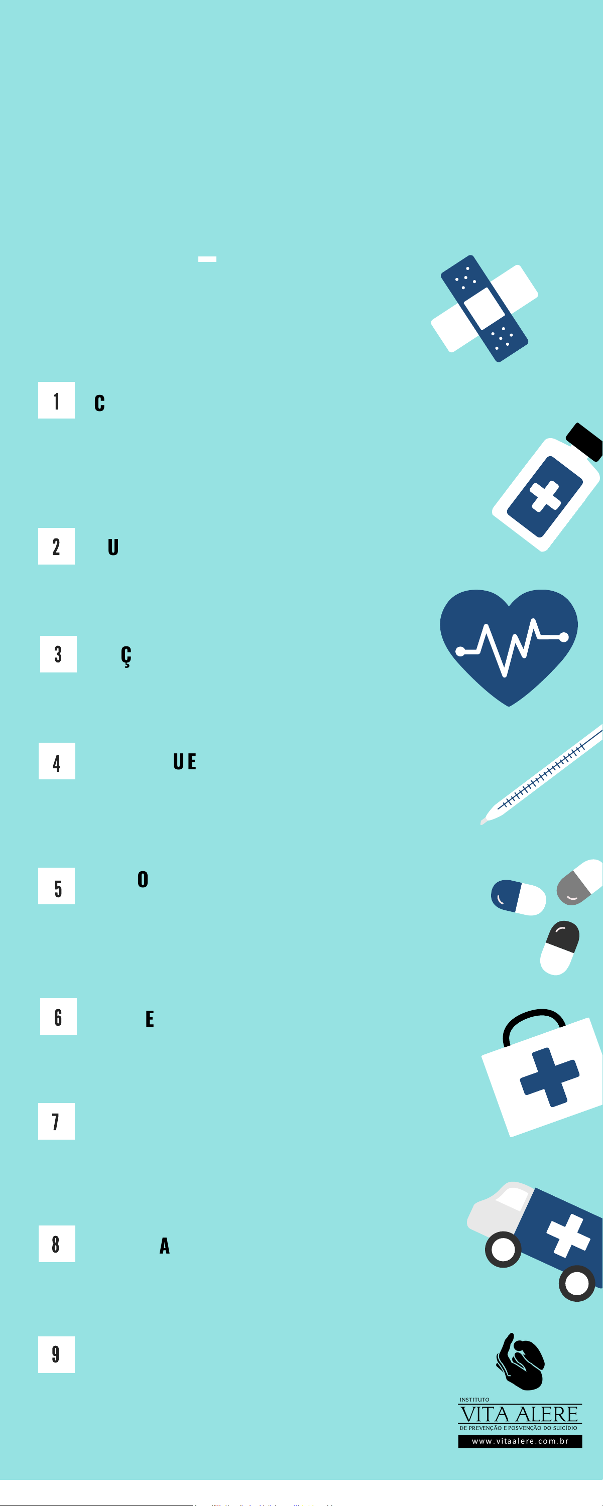 Fontes: Organização Mundial da Saúde, BBC News, Lancet Review e www.vitaalere.com.br COMO PROTEGER SUA SAÚDE MENTAL EM TEMPOS DE CORONAVÍRUS 1 C U I D A D O C O M O E X C E S S O D E I N F O R M A Ç Õ E S Tente não ficar conectado o tempo todo com as notícias, isso aumenta a sensação de incertezas e eleva as preocupações. Se perceber que isso te deixa mal, dê um tempo e vá ver ou fazer coisas em casa ou na internet que gerem bem estar. Filtre a quantidade e qualidade das informações que recebe e se possível, partilhe histórias positivas. 2 C U I D E D O S E U C O R P O Tente praticar exercícios e se alimentar de forma saudável. Relaxar, praticar meditação e alongamento, além de evitar o abuso de álcool ou drogas fazem diferença na saúde física e mental. 3 F A Ç A C O I S A S Q U E G O S T A Ouvir uma boa música, fazer um curso online, ler aquele livro esquecido ou assistir aquela série que te recomendaram, aproveite o tempo disponível para isso. 5 A P R O V E I T E P A R A C O L O C A R A S C O I S A S E M O R D E M Sabe aquela arrumação de armário, de arquivos e fotos do computador, de emails da caixa postal ou cuidar das plantas da casa. Aproveite o tempo e faça coisas que possam ocupar e relaxar a sua mente. 6 T E N T E E S T A B E L E C E R U M A R O T I N A Tente fazer as coisas nos mesmos horários, criando uma rotina de trabalho e autocuidado, isso ajudará o dia a acontecer de um jeito mais organizado e tranquilo. Lembre-se que estamos todos na mesma situação e os cuidados afetam toda a sociedade por: Instituto Vita Alere P E Ç A A J U D A S E P R E C I S A R Se você perceber que está extremamente sobrecarregado, ansioso, deprimido, pensando em se machucar ou em suicídio, procure seu médico, psicólogo ou familiar e não esqueça do CVV (188). S E C O N E C T E C O M P E S S O A S Tire uma parte do seu dia para conversar com outras pessoas online e interagir com os que estão na sua casa. Seja para falar sobre trabalho, estudo ou como está se sentindo. Não se isole! 7 N Ã O P A R E S E U T R A T A M E N T O É normal se sentir nervoso ou com medo, mas se você está em tratamento médico, não pare a medicação e procure seu médico se perceber uma piora nos sintomas. 8 9 4 P R A T I Q U E A R E S I L I Ê N C I A Tente perceber o que pode aprender com tudo o que está passando, olhe a situação de forma realista sem entrar em pânico. Descubra qual o seu melhor jeito de passar por tudo e lembre-se que isso não durará para sempre.