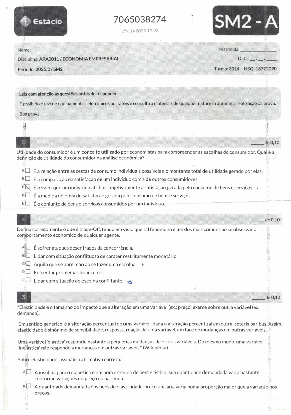 Estácio 7065038274 SM2 - A 19/10/2025 19:28 Nome: Matrícula: Disciplina: ARA0011 / ECONOMIA EMPRESARIAL Data: / / Período: 2025.2 / SM2 Turma: 3014 NSQ: 13772090 Leia com atenção as questões antes de responder. É proibido o uso de equipamentos eletrônicos portáteis e consulta a materiais de qualquer natureza durante a realização da prova. Boa prova. de 0,10 Utilidade do consumidor é um conceito utilizado por economistas para compreender as escolhas do consumidor. Qual é a definição de utilidade do consumidor na análise econômica? A É a relação entre as cestas de consumo individuais possíveis e o montante total de utilidade gerado por elas. É a comparação da satisfação de um indivíduo com a de outros consumidores. É valor que um indivíduo atribui subjetivamente à satisfação gerada pelo consumo de bens e serviços. D É a medida objetiva de satisfação gerada pelo consumo de bens e serviços. E É conjunto de bens e serviços consumidos por um indivíduo. 2. de 0,10 Defina corretamente que é trade-Off, tendo em vista que tal fenômeno é um dos mais comuns ao se observar comportamento economico de qualquer agente. A É sofrer ataques desenfrados da concorrência. Lidar com situação conflituosa de carater restritamente monetário. Aquilo que se abre mão ao se fazer uma escolha. D Enfrentar problemas financeiros. E Lidar com situação de escolha conflitante. 3 de 0,10 "Elasticidade é o tamanho do impacto que a alteração em uma variável (ex.: preço) exerce sobre outra variável (ex.: demanda). 'Em sentido genérico, é a alteração percentual de uma variável, dada a alteração percentual em outra, ceteris paribus. Assim, elasticidade é sinônimo de sensibilidade, resposta, reação de uma variável, em face de mudanças em outras Uma variável 'elástica' responde bastante a pequenas mudanças de outras variáveis. Do mesmo modo, uma variável 'inelástica' não responde a mudanças em outras variáveis." (Wikipédia) Sobre elasticidade, assinale a afirmativa correta: A A insulina para o diabético é um bom exemplo de bem elástico, sua quantidade demandada varia bastante conforme variações no preço ou na renda. A quantidade demandada dos bens de elasticidade-preço unitária varia numa proporção maior que a variação nos preços.Preço sera R$4,00 e a quantidade 140 unidades. 8. de 0,10 Os segmentos automobilístico e cervejeiro, no Brasil, são considerados setores que atuam na Estrutura de Mercado Oligopólio. Porém, existe uma característica que diferencia a atuação de cada um desses segmentos. É correto afirmar que: A As empresas não conseguem afetar o preço de mercado dos produtos. O setor automobilístico tem um pequeno número de empresas no setor. Já o setor cervejeiro, tem um pequeno número de empresas que domina setor com algumas empresas. Ambos os seguimentos têm muitas empresas operando. D O segmento cervejeiro tem produto homogêneo e automobilístico produto diferenciado. E segmento automobilístico tem produto homogêneo e cervejeiro produto diferenciado. 9. de 0,10 Os fatores de produção fixos são aqueles que permanecem inalterados, quando a produção varia, Porque de acordo com a Teoria da produção, os fatores de produção variáveis se mantem fixos mesmo com a variação da quantidade produzida A respeito destas asserções, assinale a alternativa correta: A A. A asserção é uma proposição verdadeira, e a uma proposição falsa; A. As asserções e são proposições verdadeiras, mas a não é uma justificativa da I; C As asserções le são proposições falsas D A. As asserções e são proposições verdadeiras, ea é a justificativa da I; E A. A asserção é uma proposição falsa, e a uma proposição verdadeira; 10. de 0,10 Leia o fragmento abaixo extraído da BBC. Em geral, transporte marítimo é visto como "uma indústria de baixa margem que atrai poucos investidores", As cinco maiores companhias marítimas do mundo respondem por dois terços do mercado. E as dez maiores empresas controlam 85% do transporte global, de acordo com dados de Drewry. "Diria que o mercado é moderadamente concentrado e é um setor bastante diz o especialista. Com base no texto e nas discussões feitas sobre estruturas de mercado, podemos dizer que A a estrutura de mercado representada pelo fragmento é a concorrência monopolística. a estrutura de mercado representada pelo fragmento é o oligopólio. a estrutura de mercado representada pelo fragmento é a concorrência perfeita. D a estrutura de mercado representada pelo fragmento é monopólio. E a estrutura de mercado representada pelo fragmento é cartel. Campus: Prova Impressa em 19/10/2025 por POLO DUQUE DE CAXIAS RJ MARCELO PIRES LEITE 7065038274 Prova Montada em 19/10/2025A quantidade demandada dos bens inelásticos em relação aos preços pouco varia diante de um aumento ou diminuição de preços. D A quantidade demandada dos bens inelásticos em relação a renda varia bastante diante de um aumento ou diminuição de preços. E Os bens normais são aqueles cuja quantidade demandada varia inversamente a variação nos preços e são um exemplo de bem perfeitamente inelástico. 4. de 0,10 Na análise econômica, a escolha do consumidor é frequentemente modelada por meio de curvas de indiferença. Mas afinal, o que são essas curvas? A São curvas que mostram a relação entre a renda do consumidor e a quantidade de um bem ou serviço que ele pode adquirir. São curvas que representam a relação direta entre a oferta e a quantidade demandada de um bem ou serviço. c São curvas que indicam a quantidade de um bem ou serviço que um consumidor pode adquirir com uma renda dada e preços de mercado. D São curvas que mostram as diferentes combinações de bens e serviços que geram a mesma quantidade de utilidade total para um indivíduo. E São curvas que representam a relação inversa entre o preço e a quantidade demandada de um bem ou serviço. 5. de 