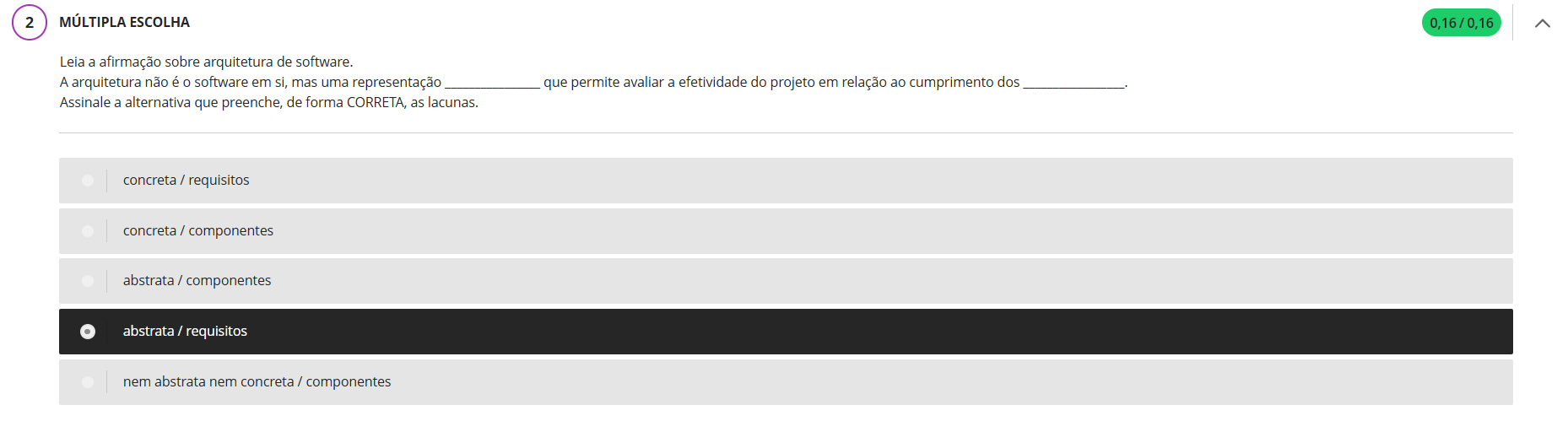 2 MÚLTIPLA ESCOLHA 0,16/0,16 Leia a afirmação sobre arquitetura de software. A arquitetura não é software em si, mas uma representação que permite avaliar a efetividade do projeto em relação ao cumprimento dos Assinale a alternativa que preenche, de forma CORRETA, as lacunas. concreta / requisitos concreta / componentes abstrata / componentes abstrata / requisitos nem abstrata nem concreta / componentes